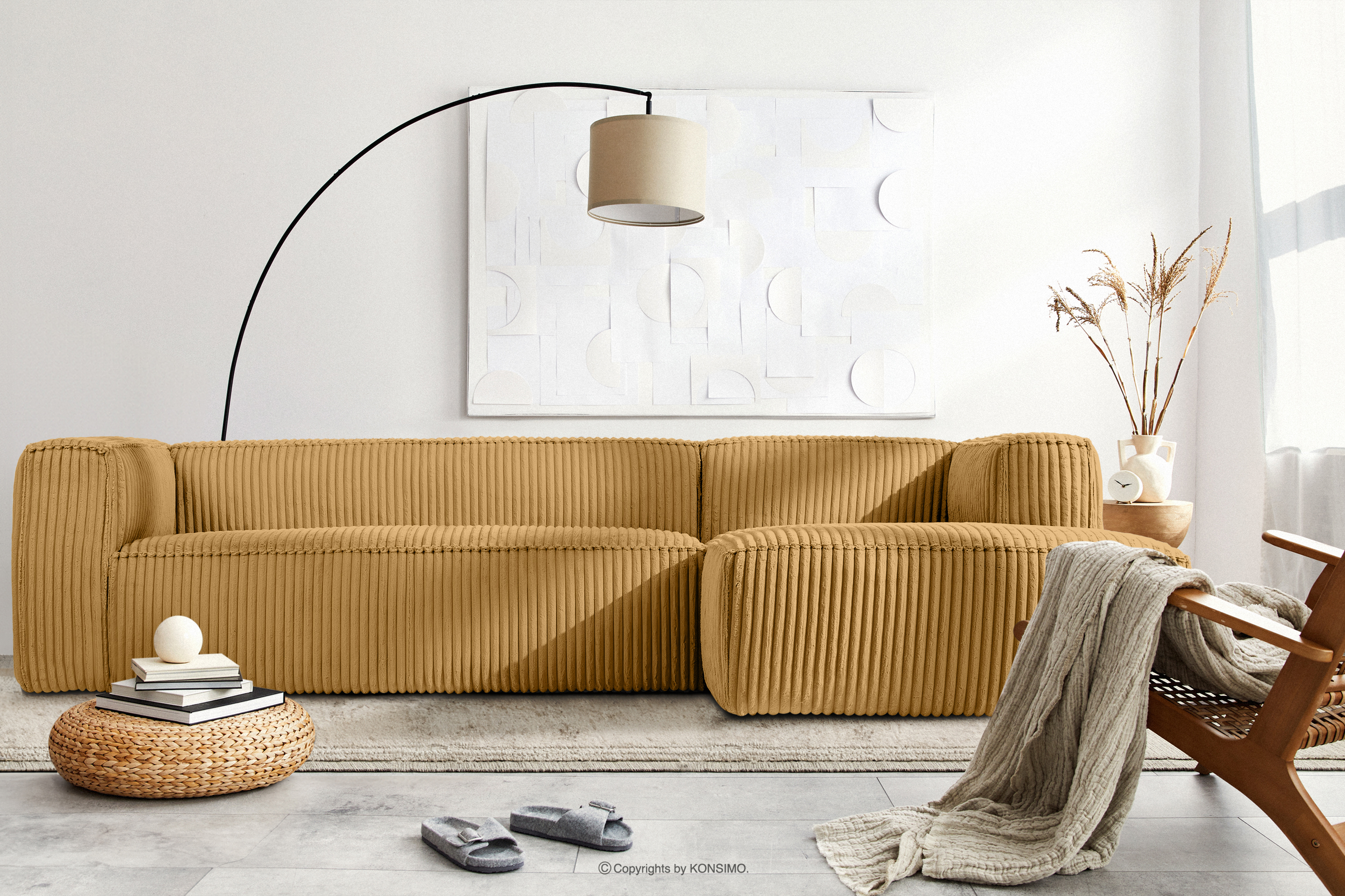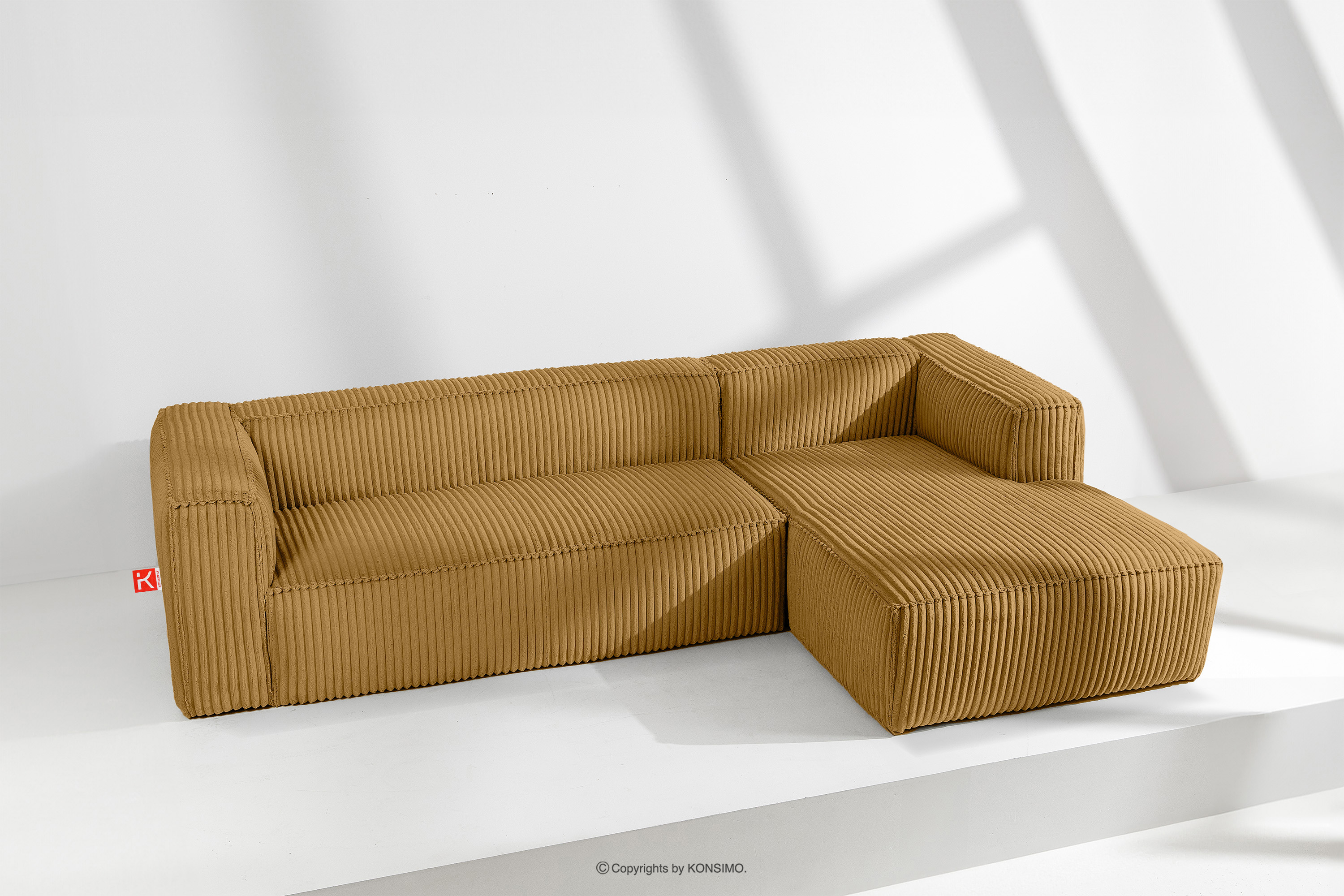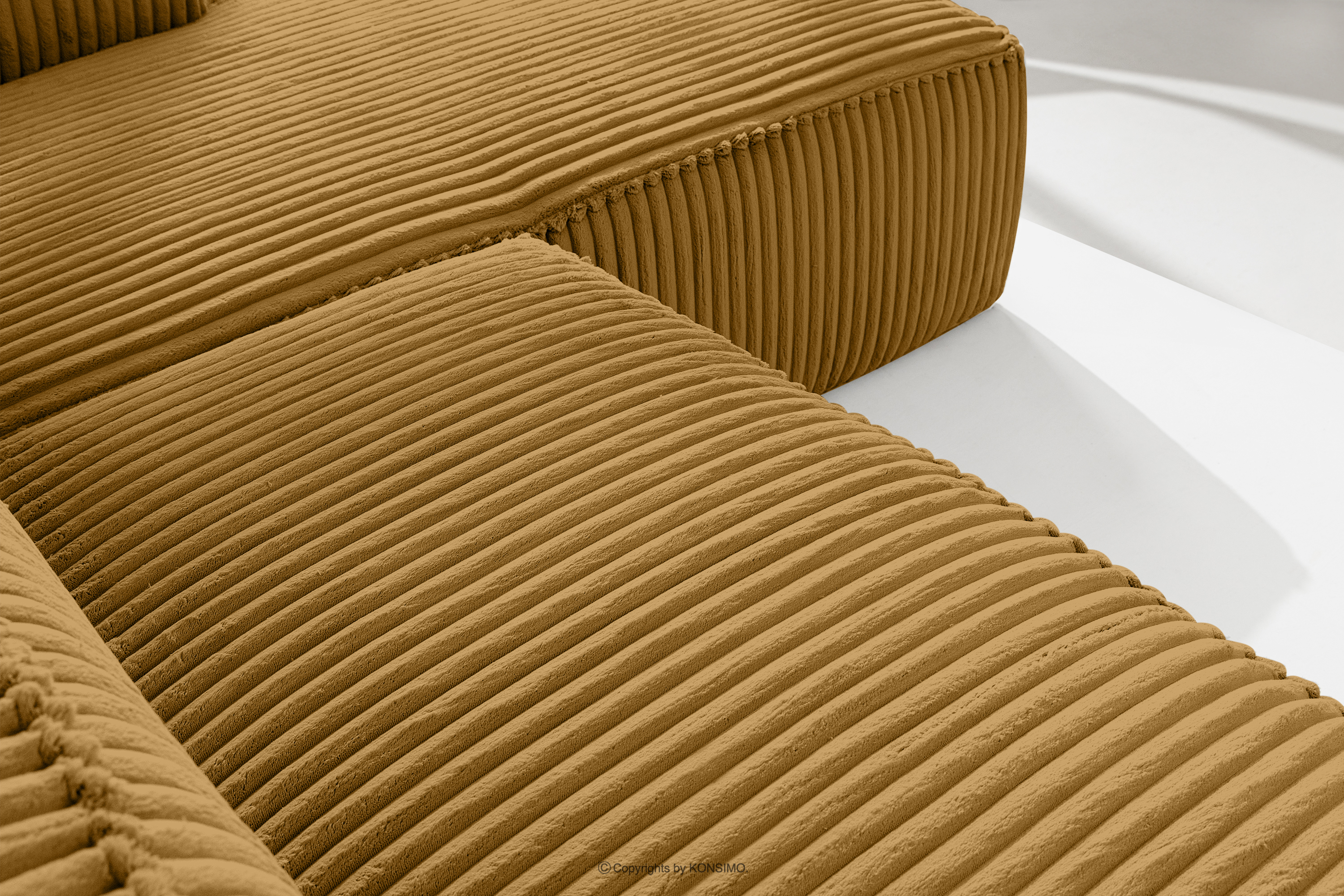 Großes gelbes Ecksofa aus Kordstoff rechts mit solider Konstruktion und außergewöhnlichem Design. Das Gestell dieses eleganten Möbelstücks wurde aus einer Kombination von Kiefern- und Buchenholz gefertigt, was nicht nur ein ästhetisches Aussehen, sondern auch eine lange Lebensdauer gewährleistet. Der Innenraum wird von einer soliden Konstruktion aus Span- und Faserplatten getragen, die Stabilität und Nutzungskomfort garantiert.