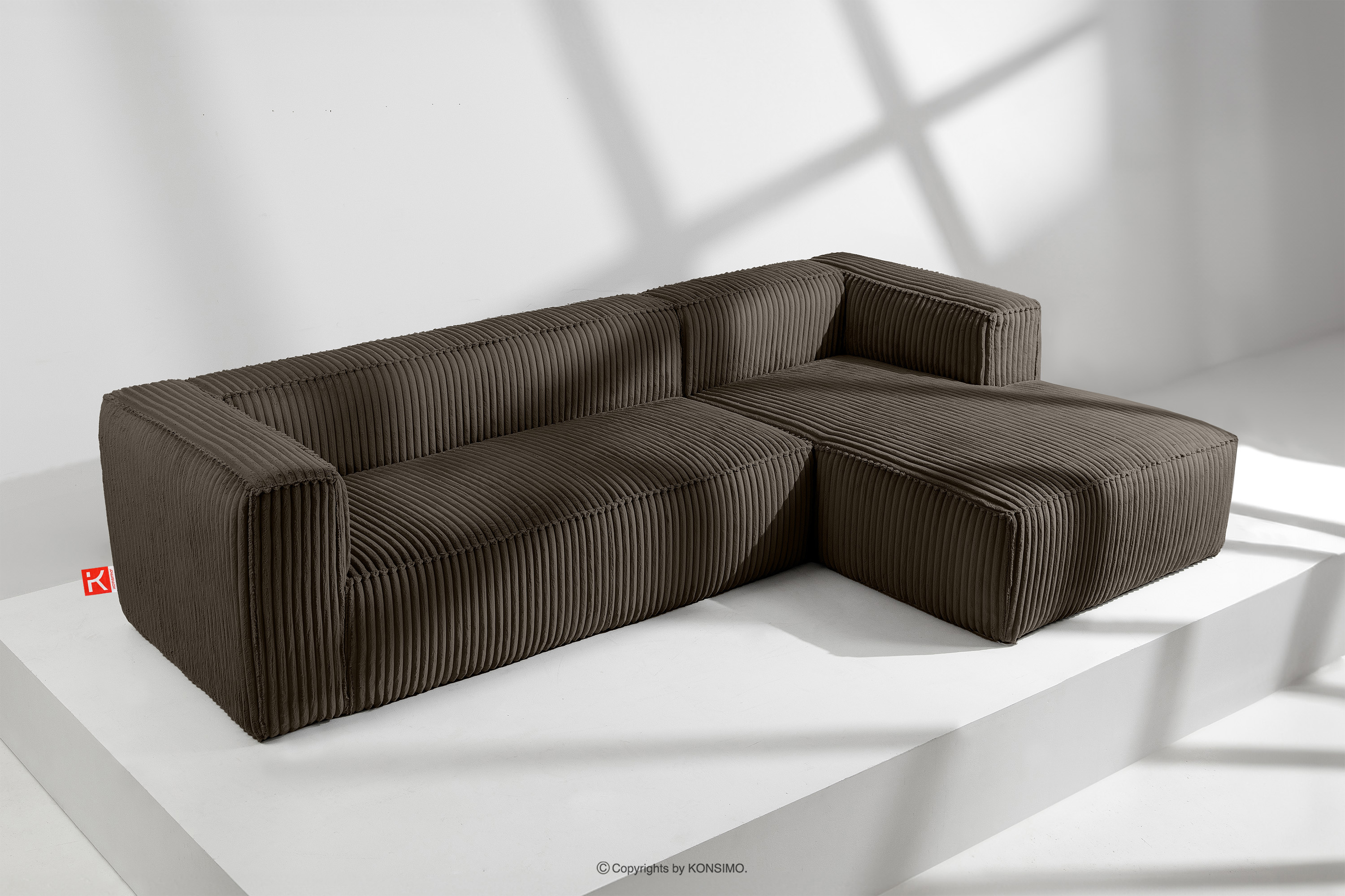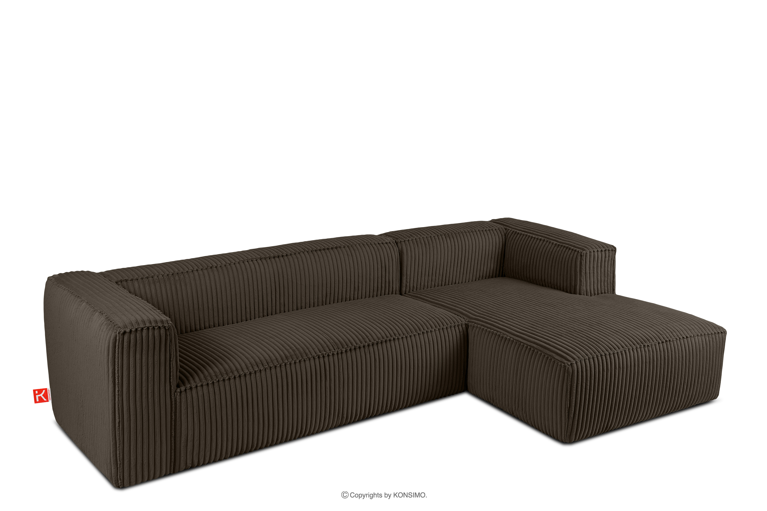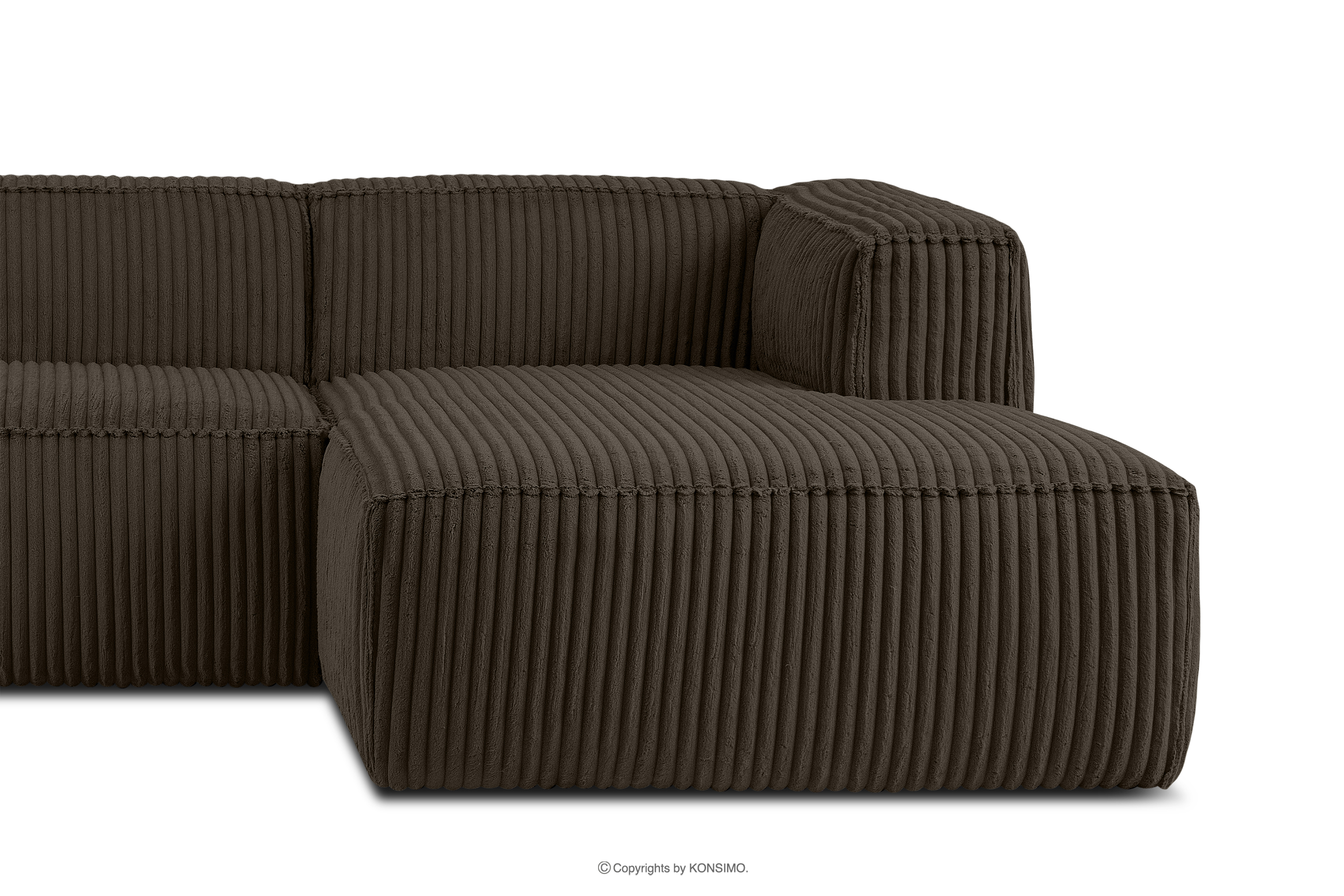 Großes braunes Ecksofa aus Kordstoff rechts mit einer soliden Konstruktion und außergewöhnlichem Design. Das Gestell dieses eleganten Möbelstücks wurde aus einer Kombination von Kiefern- und Buchenholz gefertigt, was nicht nur ein ästhetisches Aussehen, sondern auch eine lange Lebensdauer gewährleistet. Der Innenraum wird von einer soliden Konstruktion aus Span- und Faserplatten getragen, die Stabilität und Nutzungskomfort garantiert.