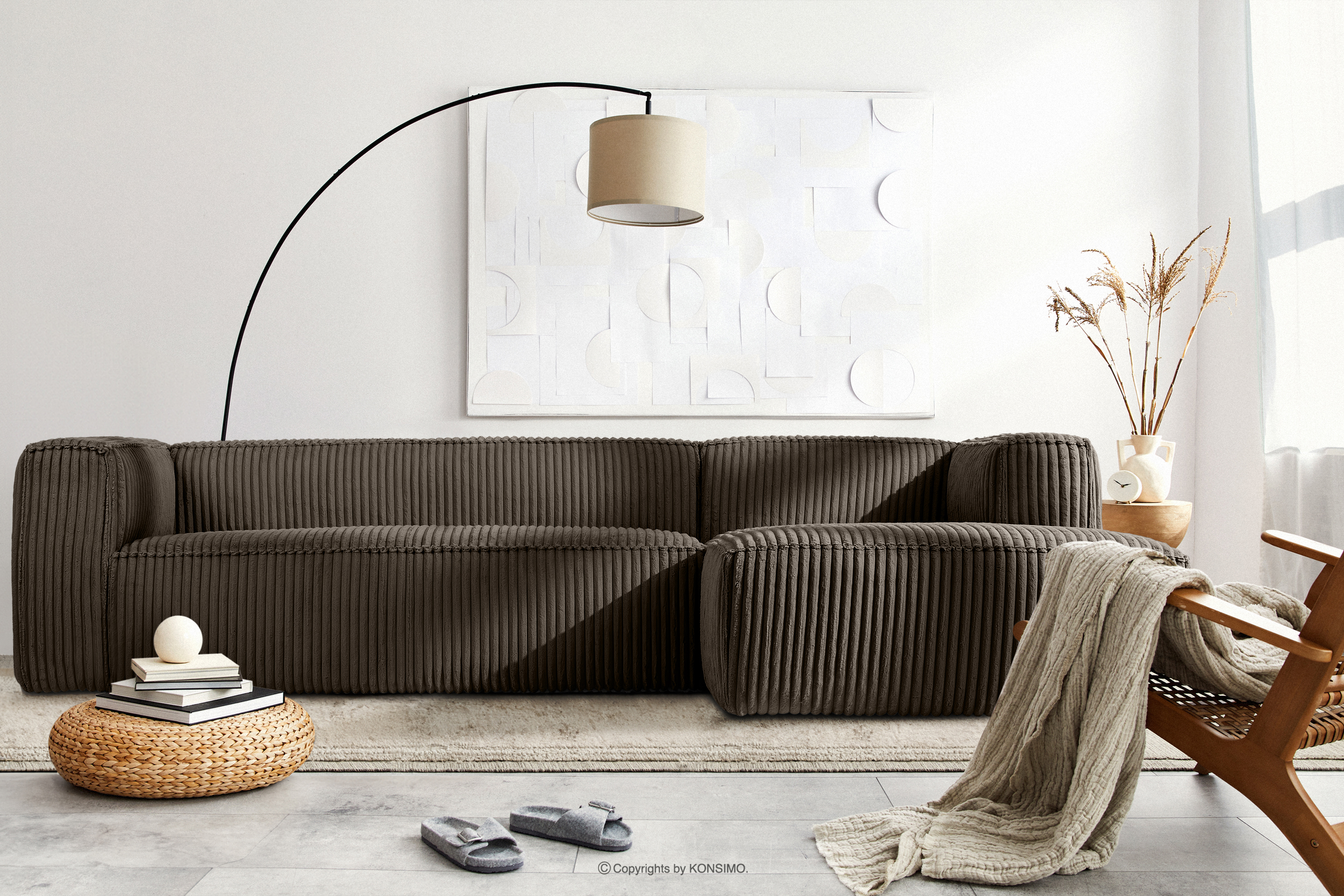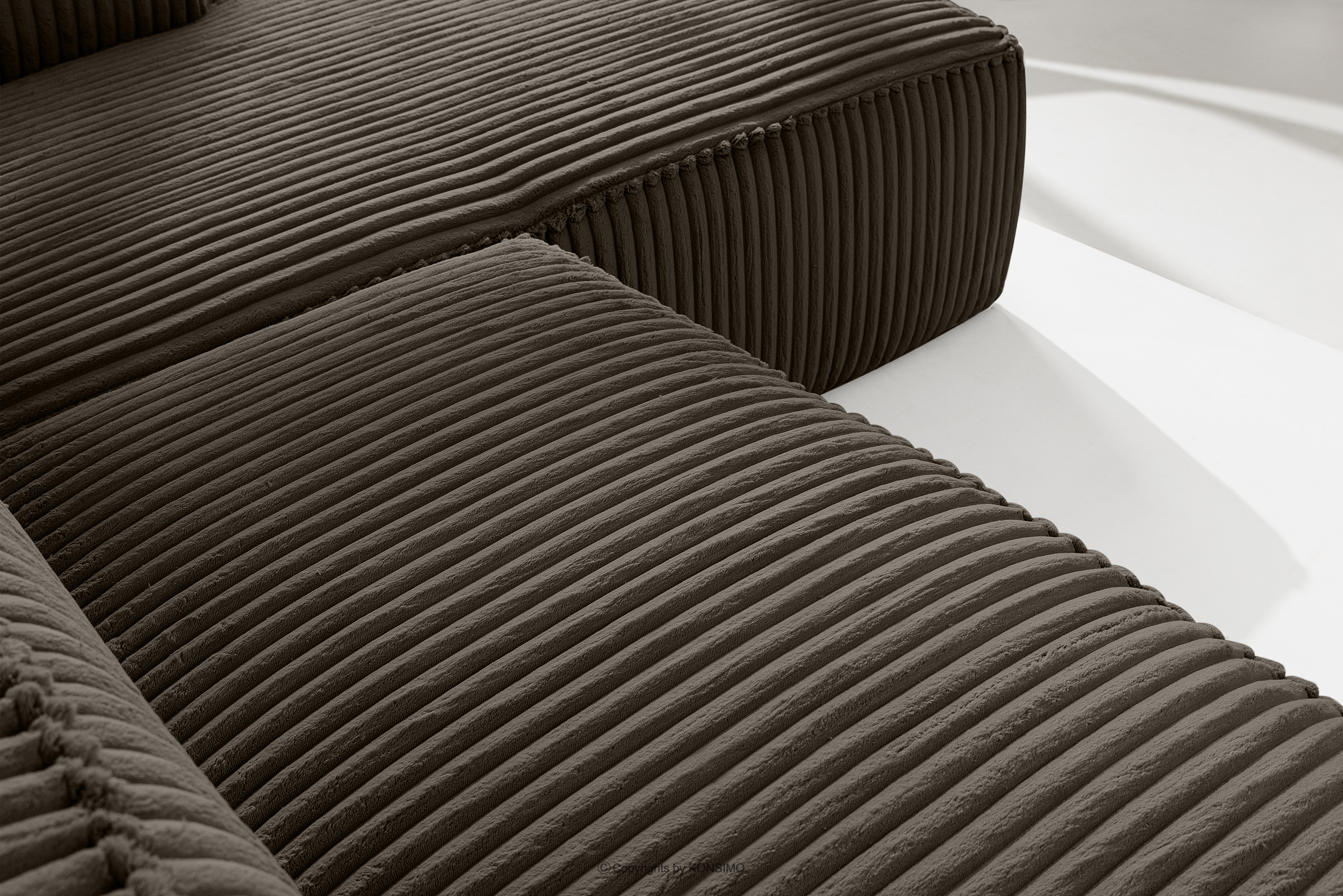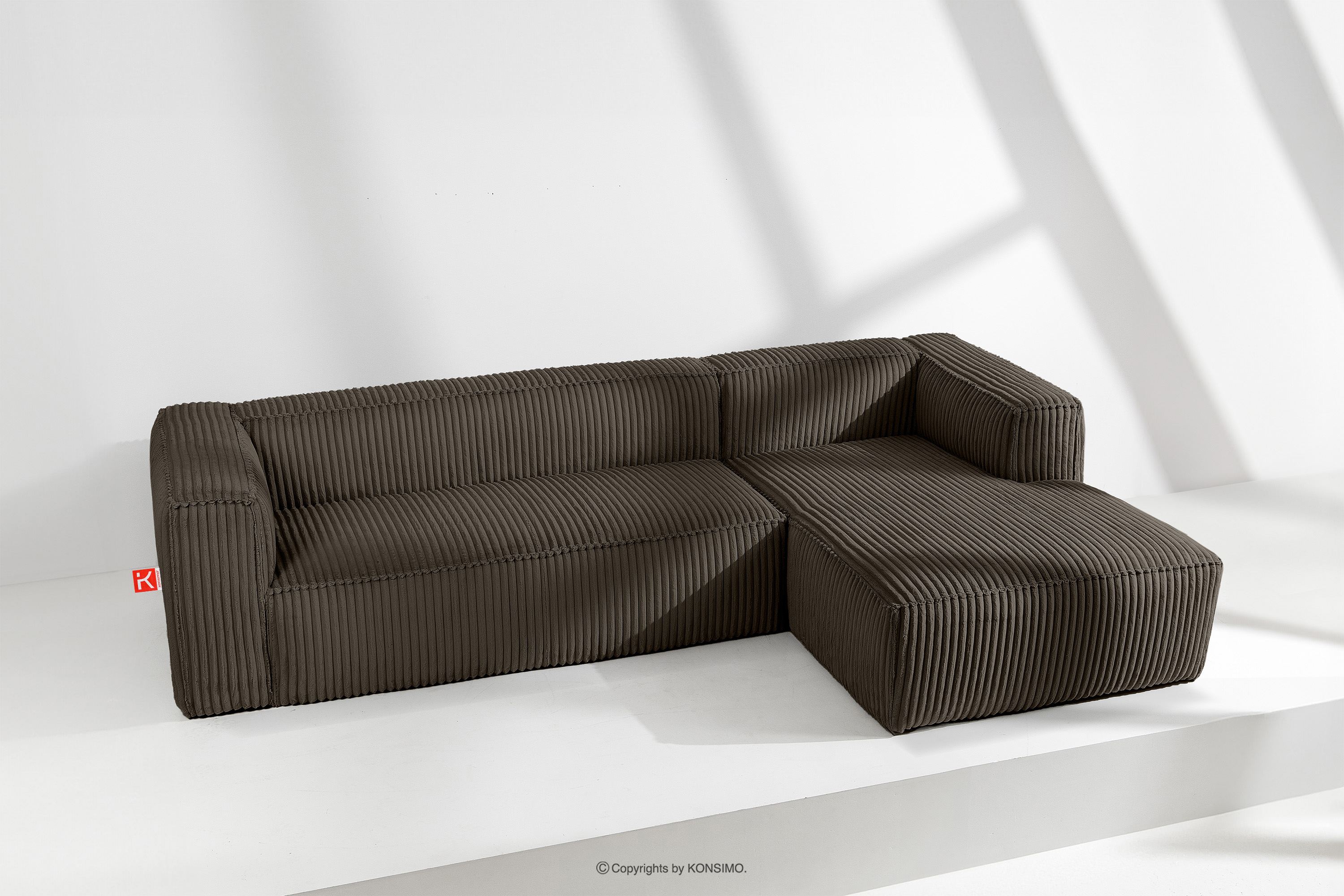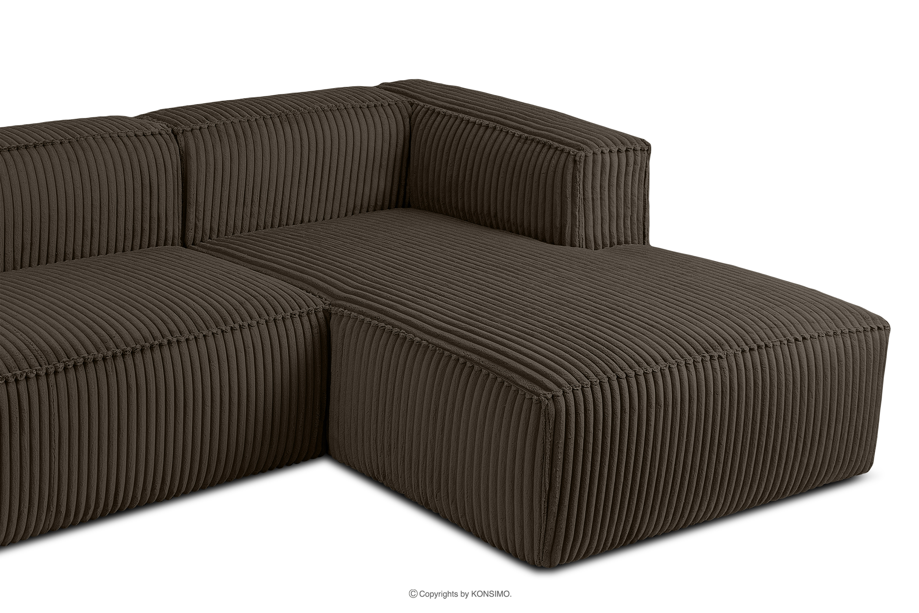 Großes braunes Ecksofa aus Kordstoff rechts mit einer soliden Konstruktion und außergewöhnlichem Design. Das Gestell dieses eleganten Möbelstücks wurde aus einer Kombination von Kiefern- und Buchenholz gefertigt, was nicht nur ein ästhetisches Aussehen, sondern auch eine lange Lebensdauer gewährleistet. Der Innenraum wird von einer soliden Konstruktion aus Span- und Faserplatten getragen, die Stabilität und Nutzungskomfort garantiert.