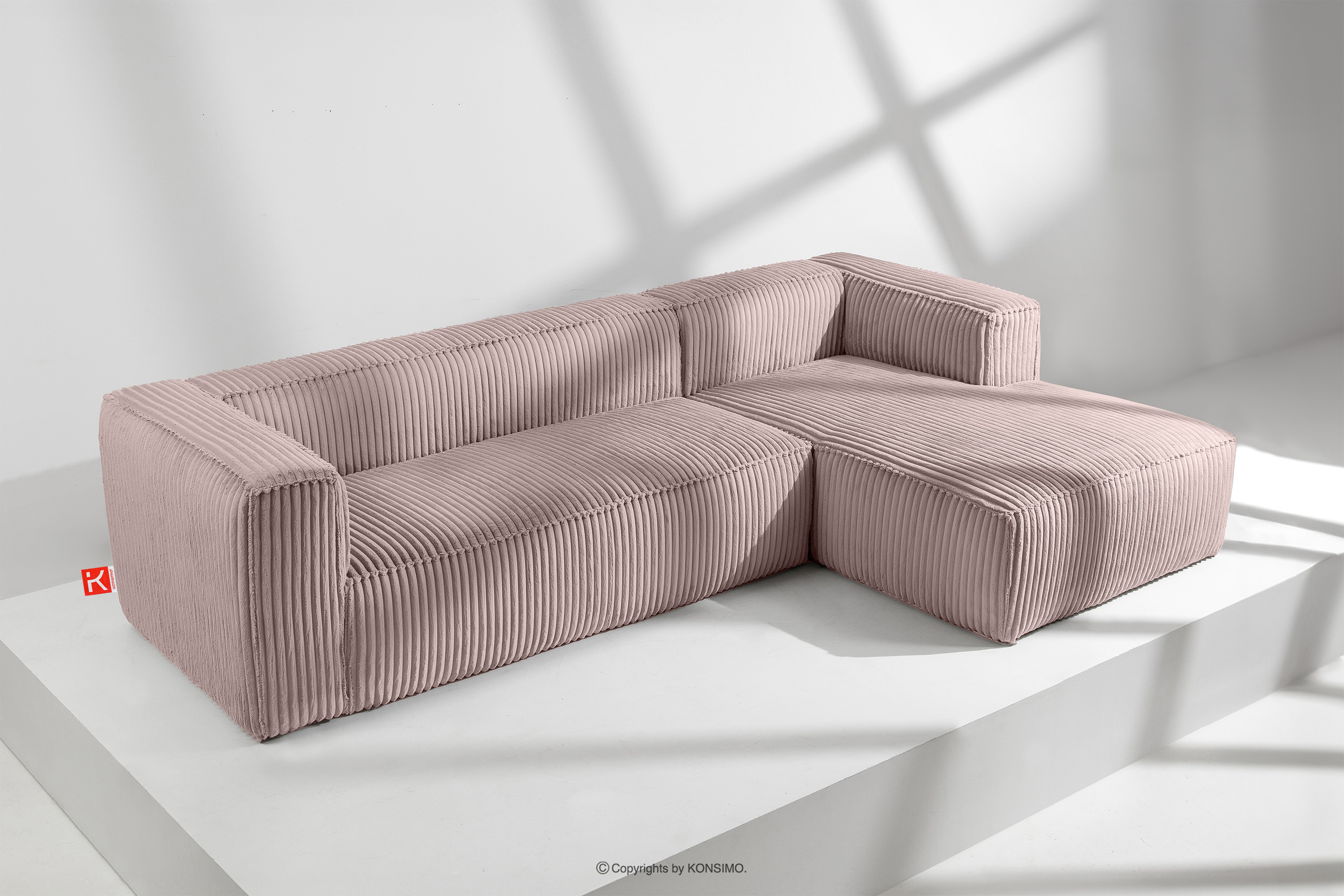 Ein großes rosafarbenes Ecksofa aus Kordstoff rechts mit einer soliden Konstruktion und außergewöhnlichem Design. Das Gestell dieses eleganten Möbelstücks ist aus einer Kombination von Kiefern- und Buchenholz gefertigt, was nicht nur ein ästhetisches Aussehen, sondern auch eine lange Lebensdauer garantiert. Der Innenraum wird von einer soliden Konstruktion aus Span- und Faserplatten getragen, die Stabilität und Nutzungskomfort garantiert.