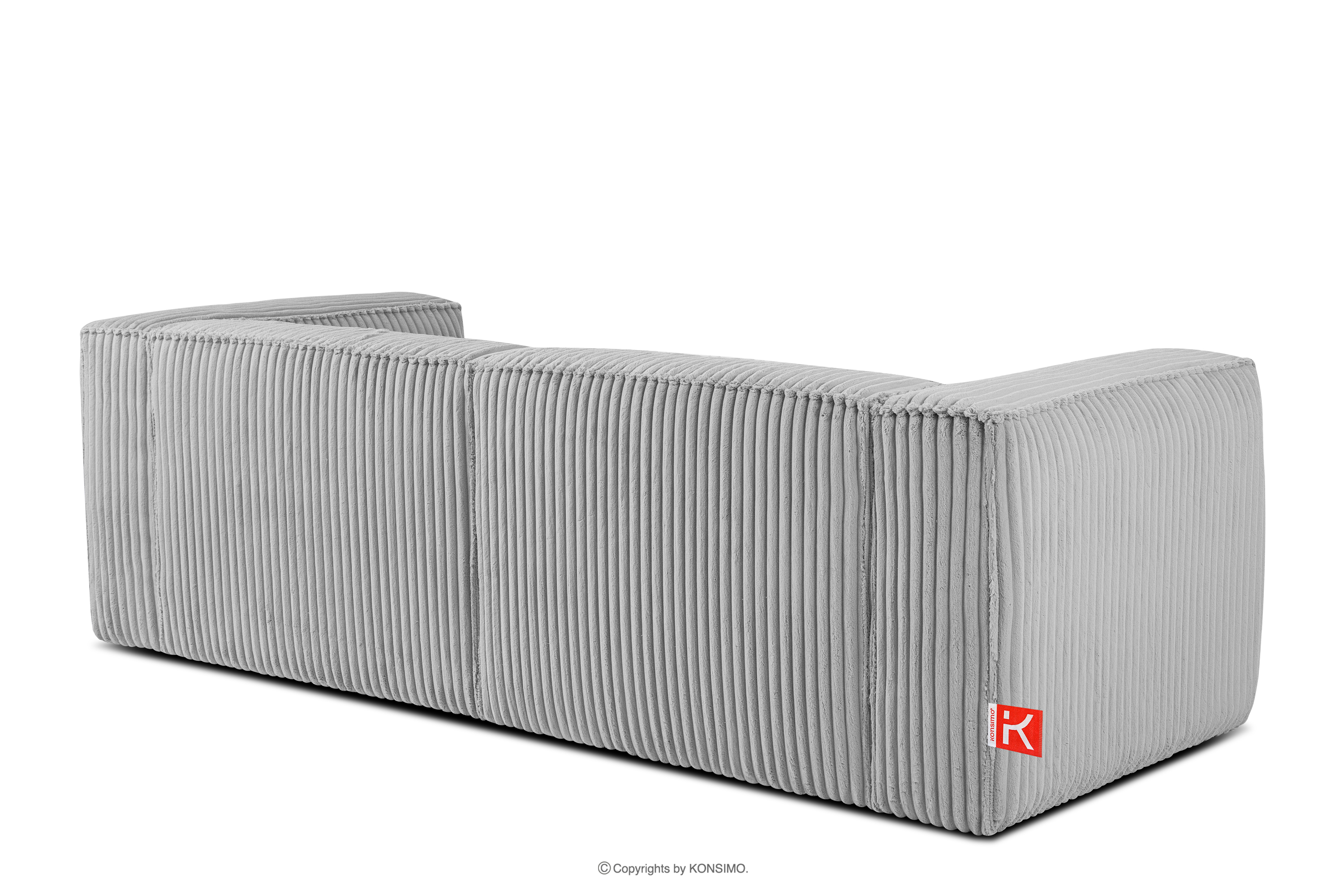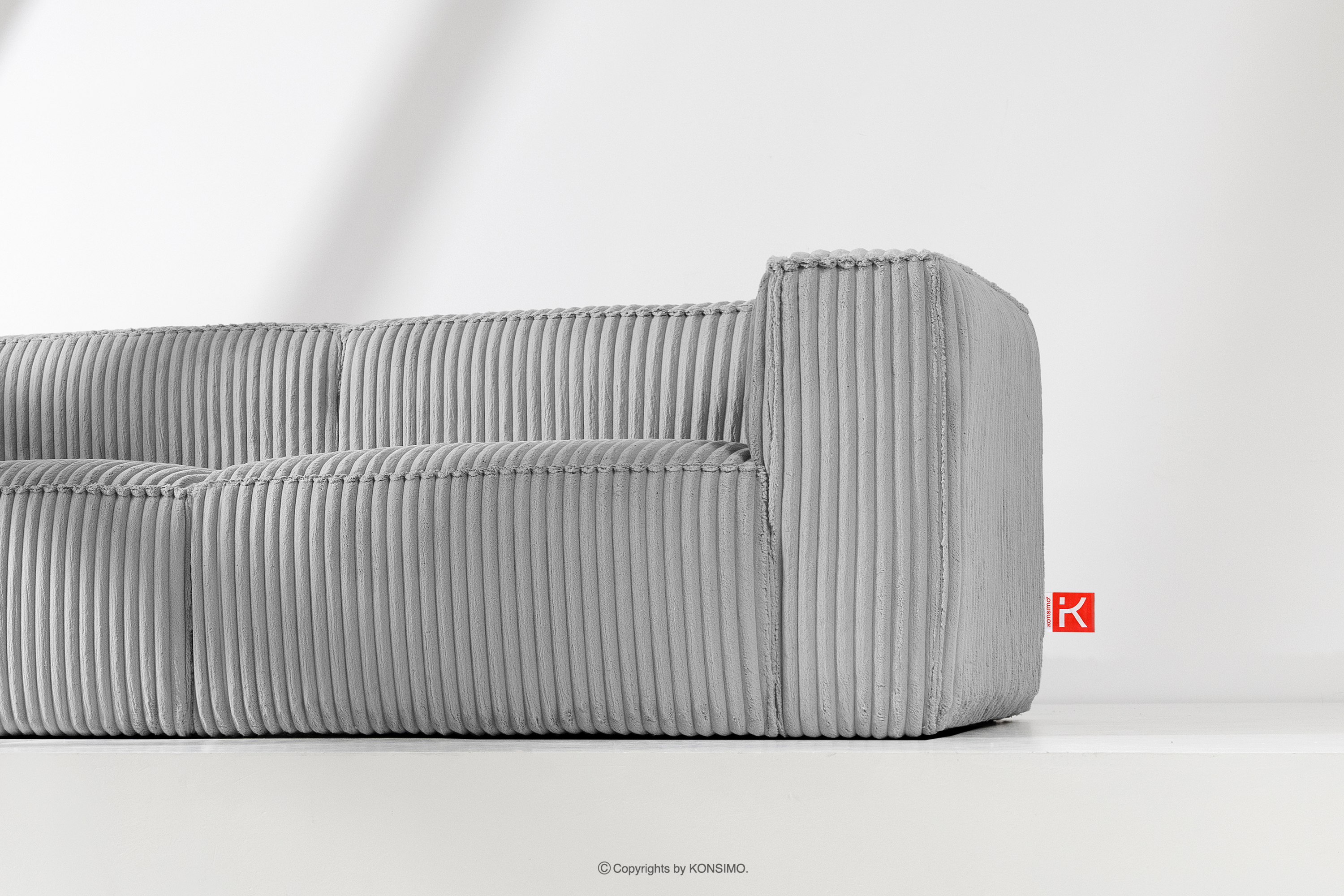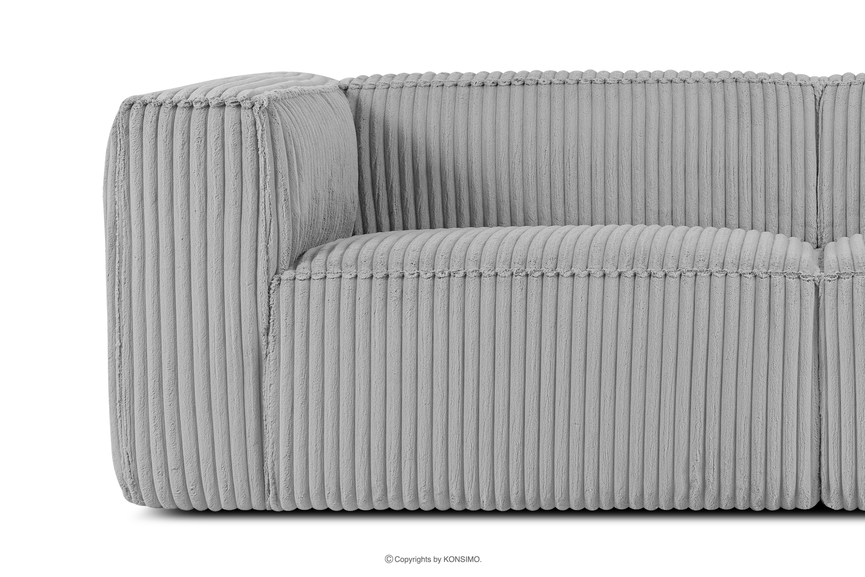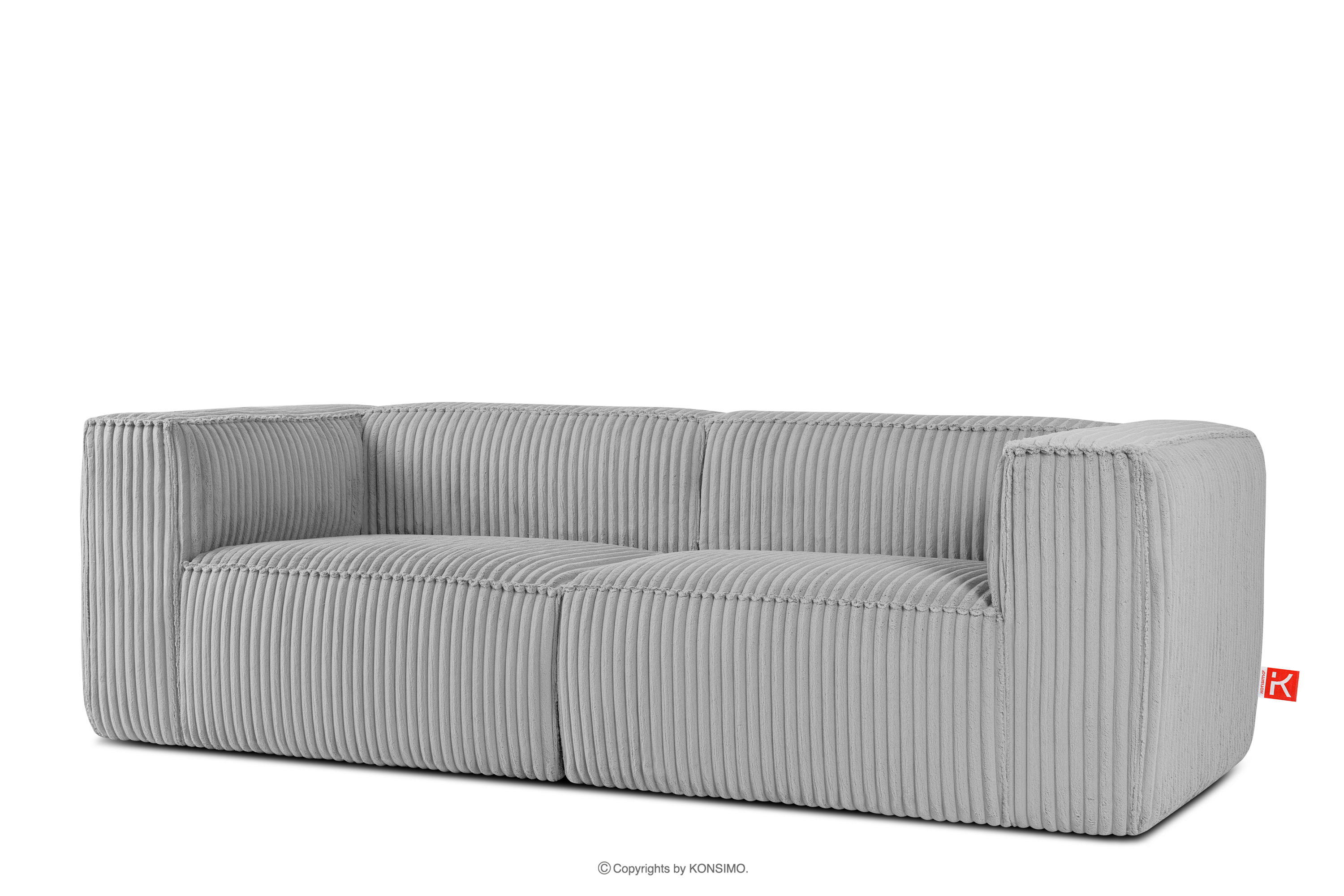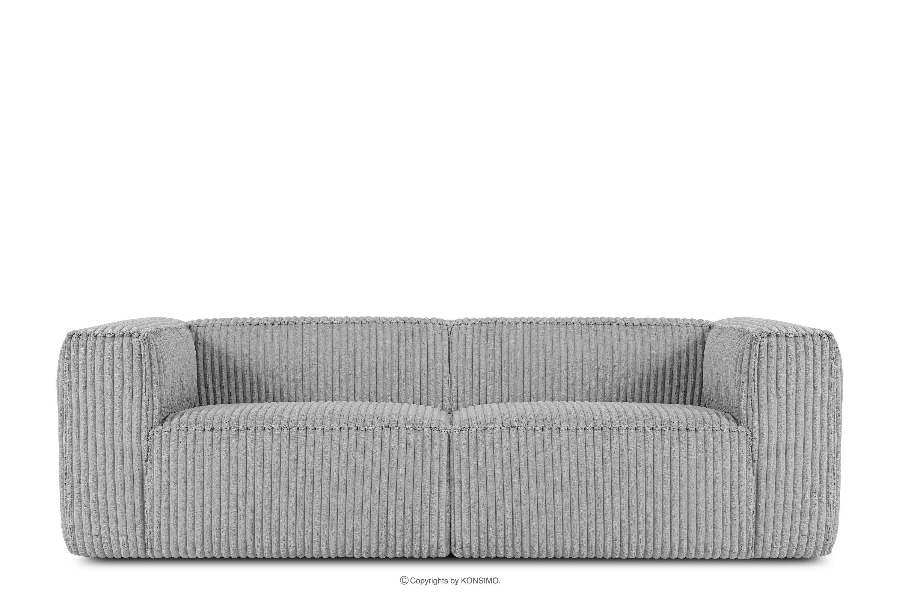 Ein großes hellgraues Sofa aus Kordstoff mit robuster Konstruktion und außergewöhnlichem Design. Das Gestell dieses eleganten Möbelstücks besteht aus einer Kombination aus Kiefern- und Buchenholz, die nicht nur ein ästhetisches Aussehen, sondern auch eine lange Lebensdauer garantiert. Der Innenraum wird von einer soliden Konstruktion auf der Basis von Span- und Faserplatten getragen, die Stabilität und Nutzungskomfort garantiert.