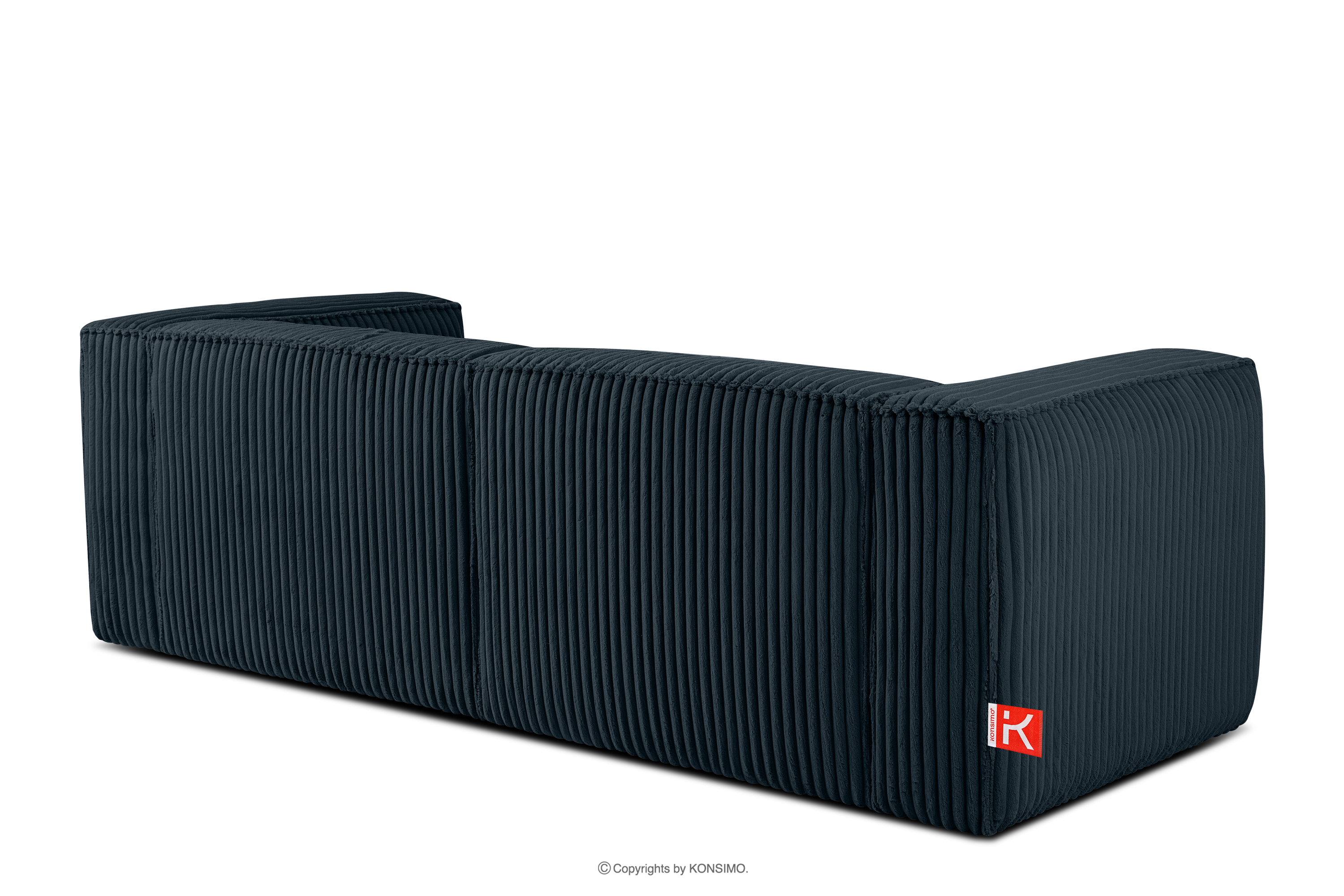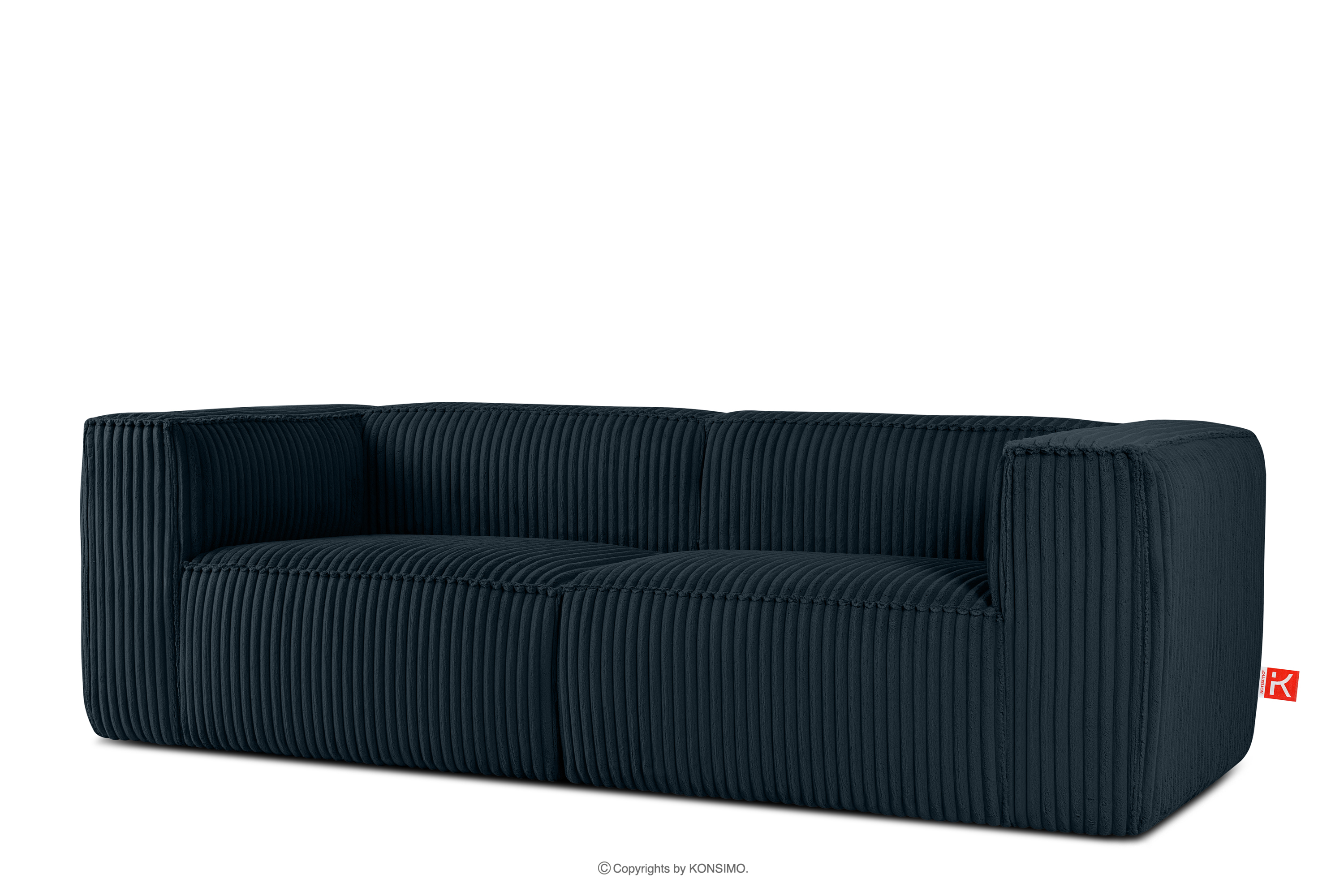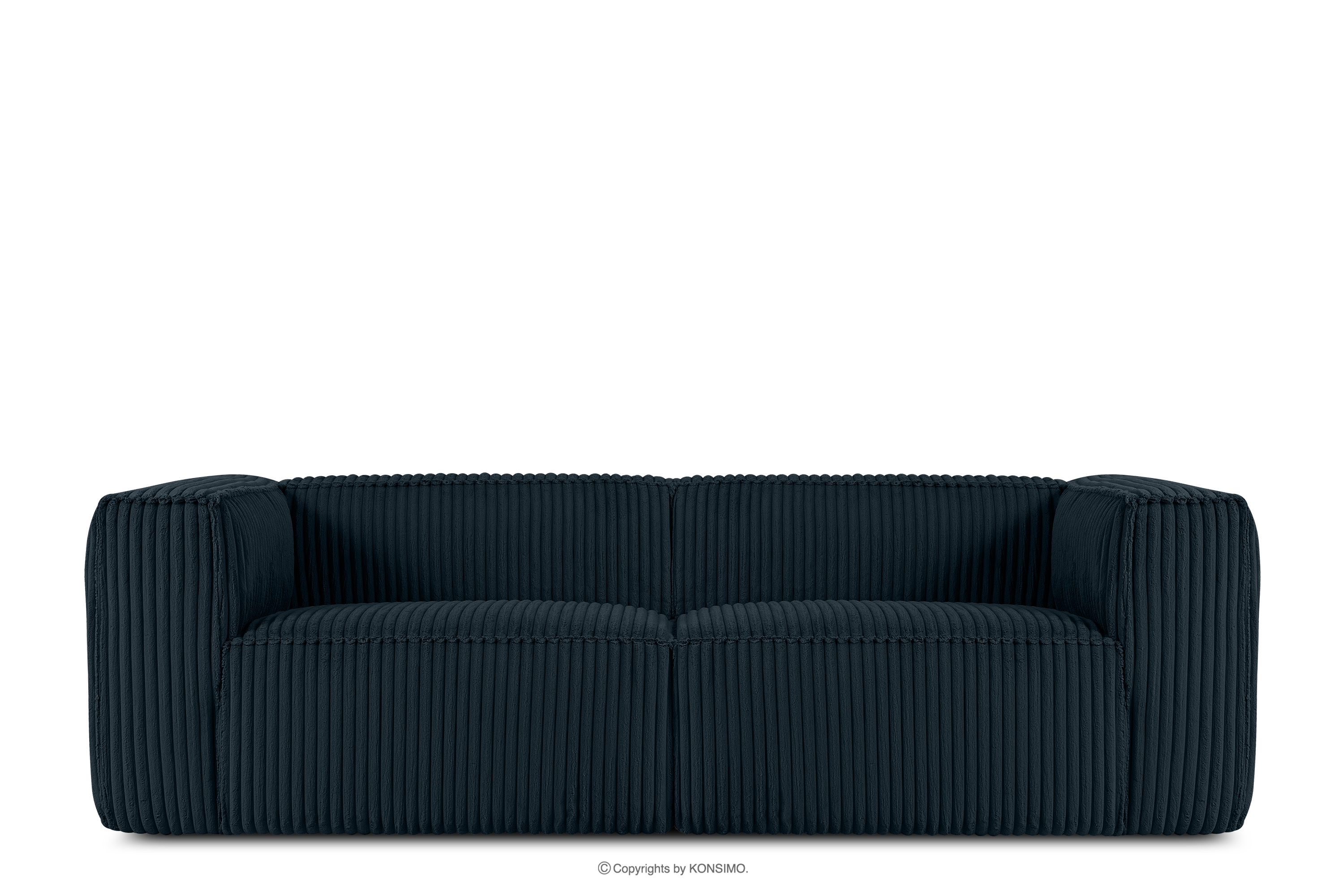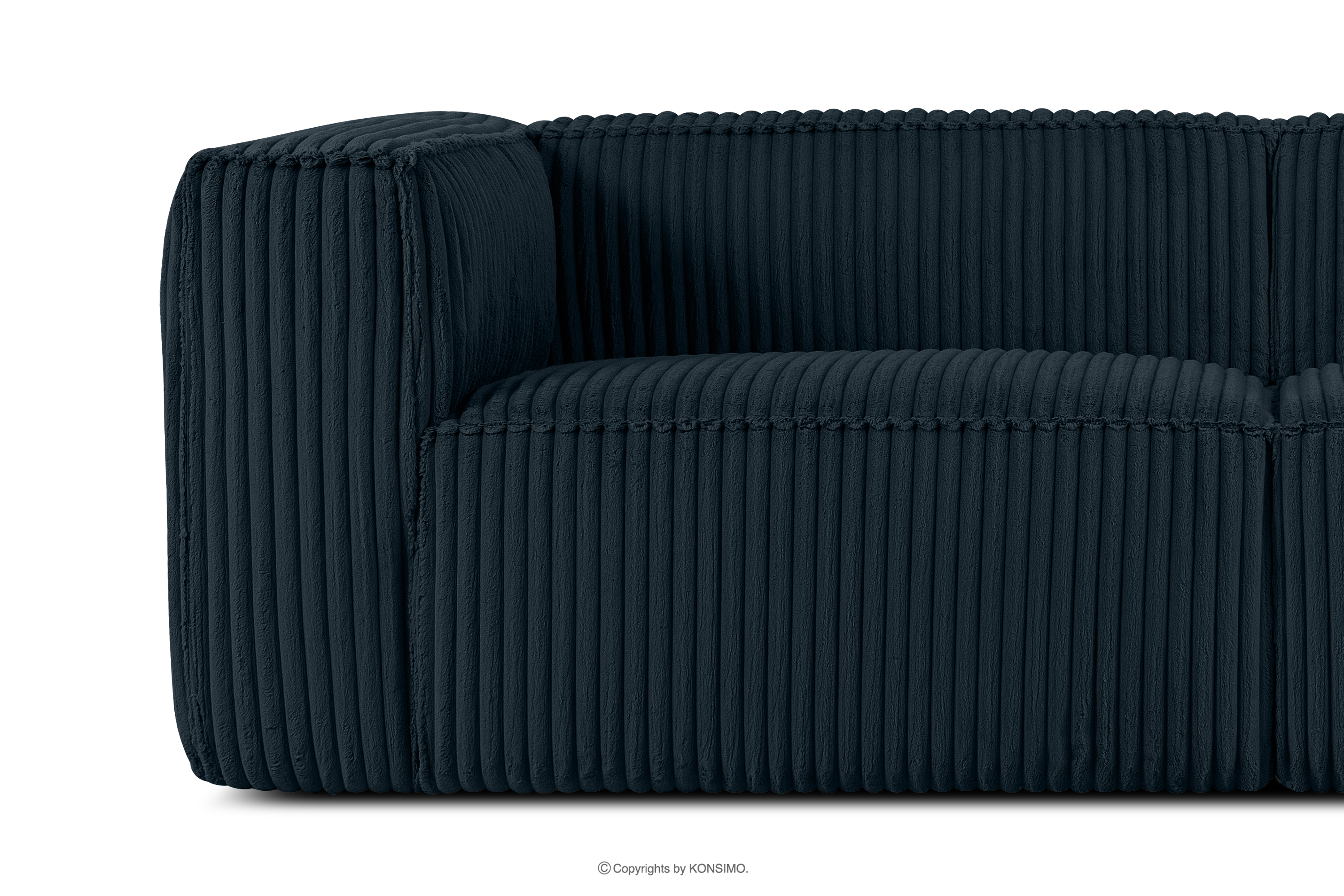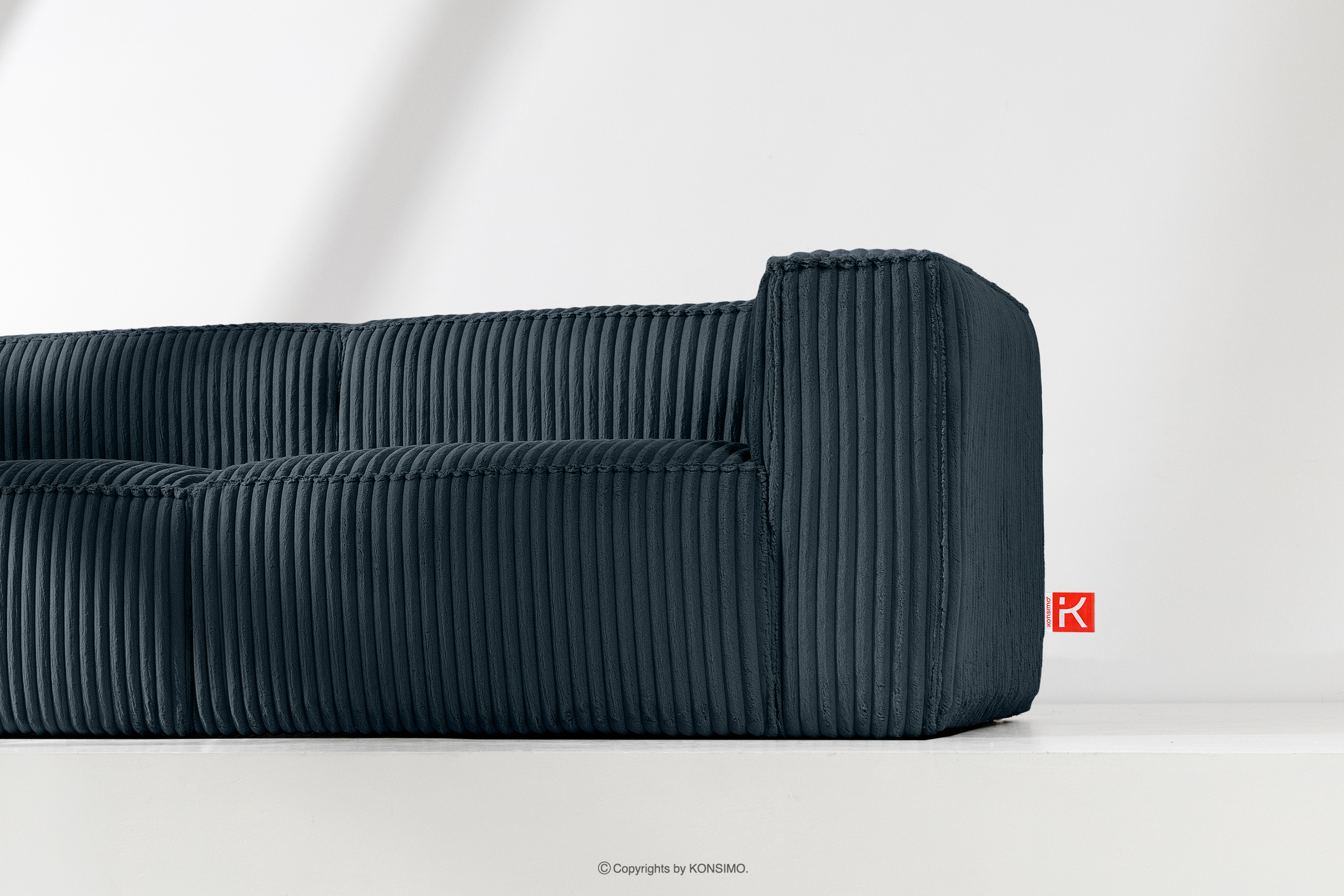 Ein großes marineblaues Sofa aus Kordstoff mit einer soliden Konstruktion und einem außergewöhnlichen Design. Das Gestell dieses eleganten Möbelstücks ist aus einer Kombination von Kiefern- und Buchenholz gefertigt, was nicht nur ein ästhetisches Aussehen, sondern auch eine lange Lebensdauer garantiert. Der Innenraum wird von einer soliden Konstruktion auf der Basis von Span- und Faserplatten getragen, die Stabilität und Nutzungskomfort garantiert.