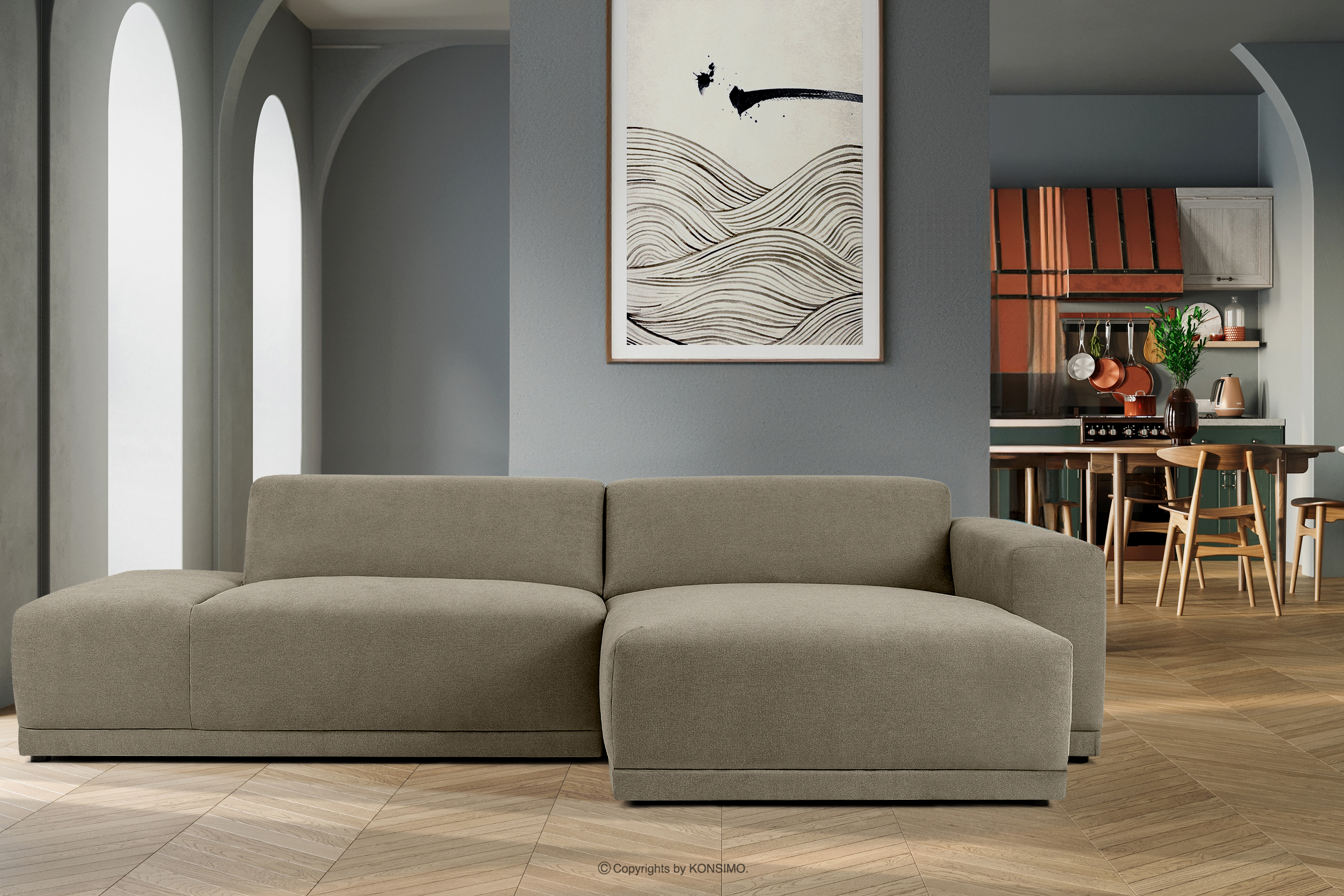 MUDI Mehr aus der Kollektion Modernes Ecksofa für Wohnzimmer hellbeige Gewebestoff rechts- Farbe hellbeige
