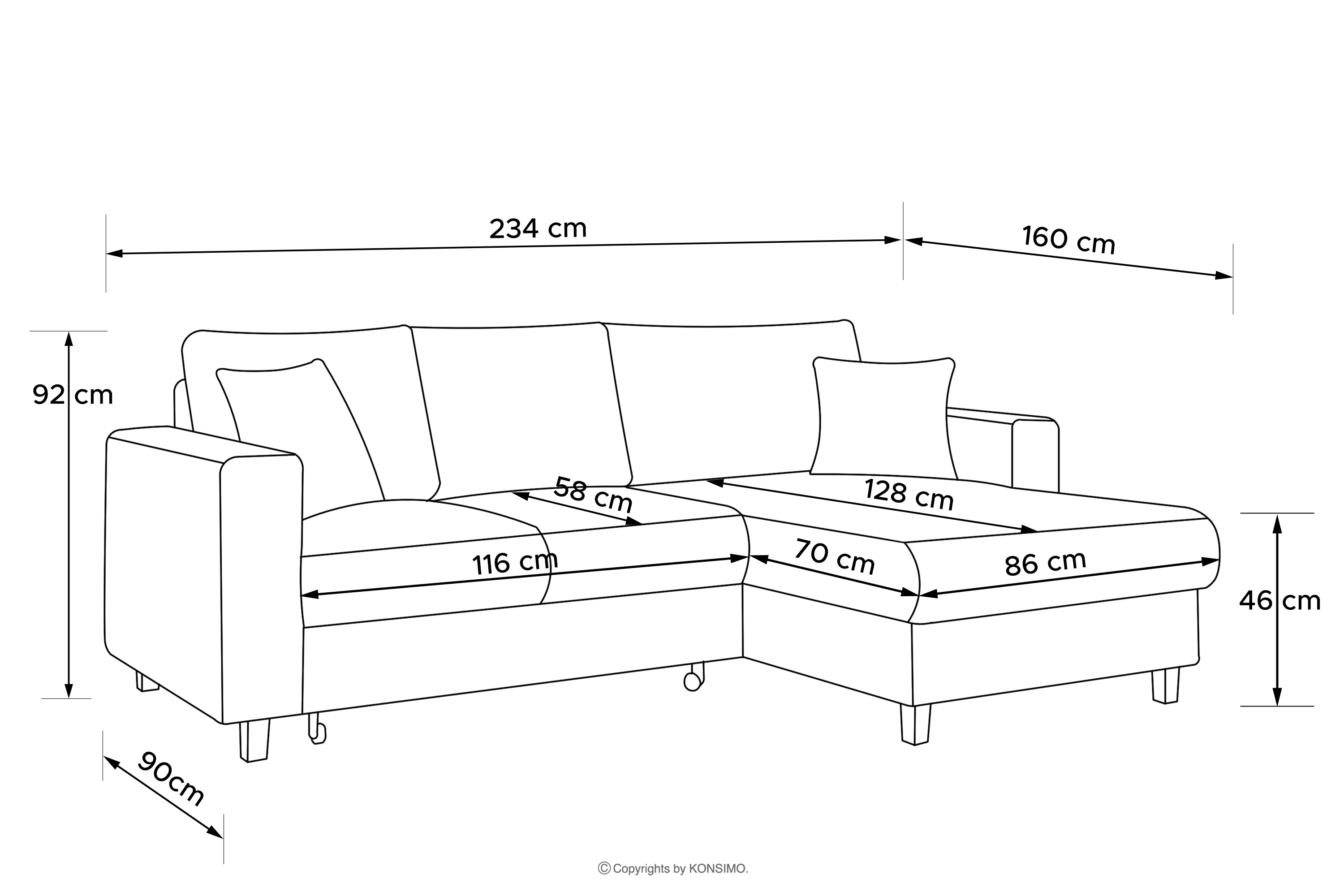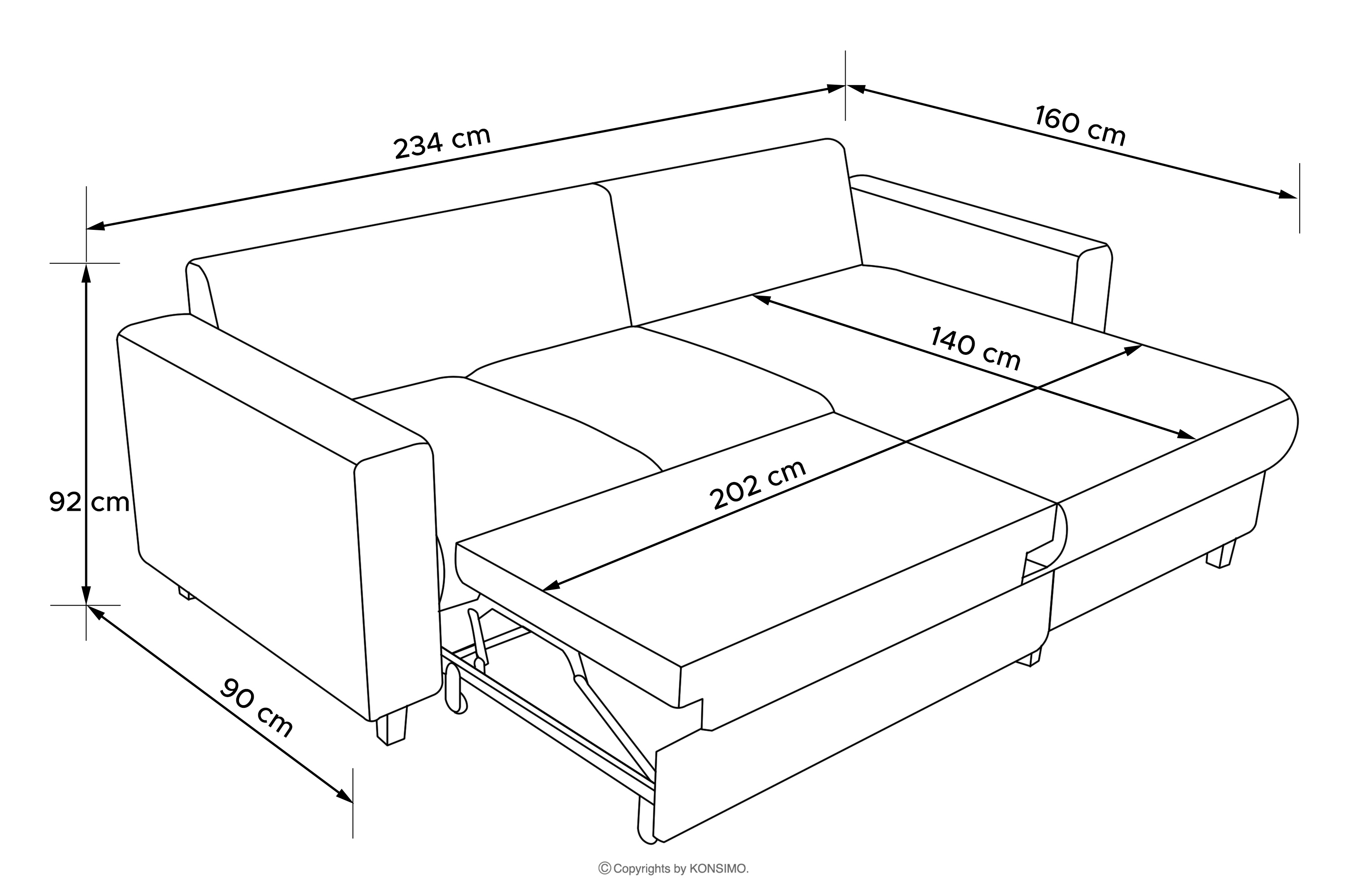 Die mittelfeste Sitzfläche mit 10 cm dickem T2842 Schaumstoff und einer Wellenunterfederung garantieren einen außergewöhnlichen Komfort bei der Benutzung. Ein zusätzlicher Vorteil ist die Möglichkeit, das Ecksofa auszuklappen, wodurch es sich leicht an Ihre Bedürfnisse anpassen lässt, und der praktische Bettzeugbehälter ermöglicht es Ihnen, Bettzeug und Kissen problemlos zu verstauen.