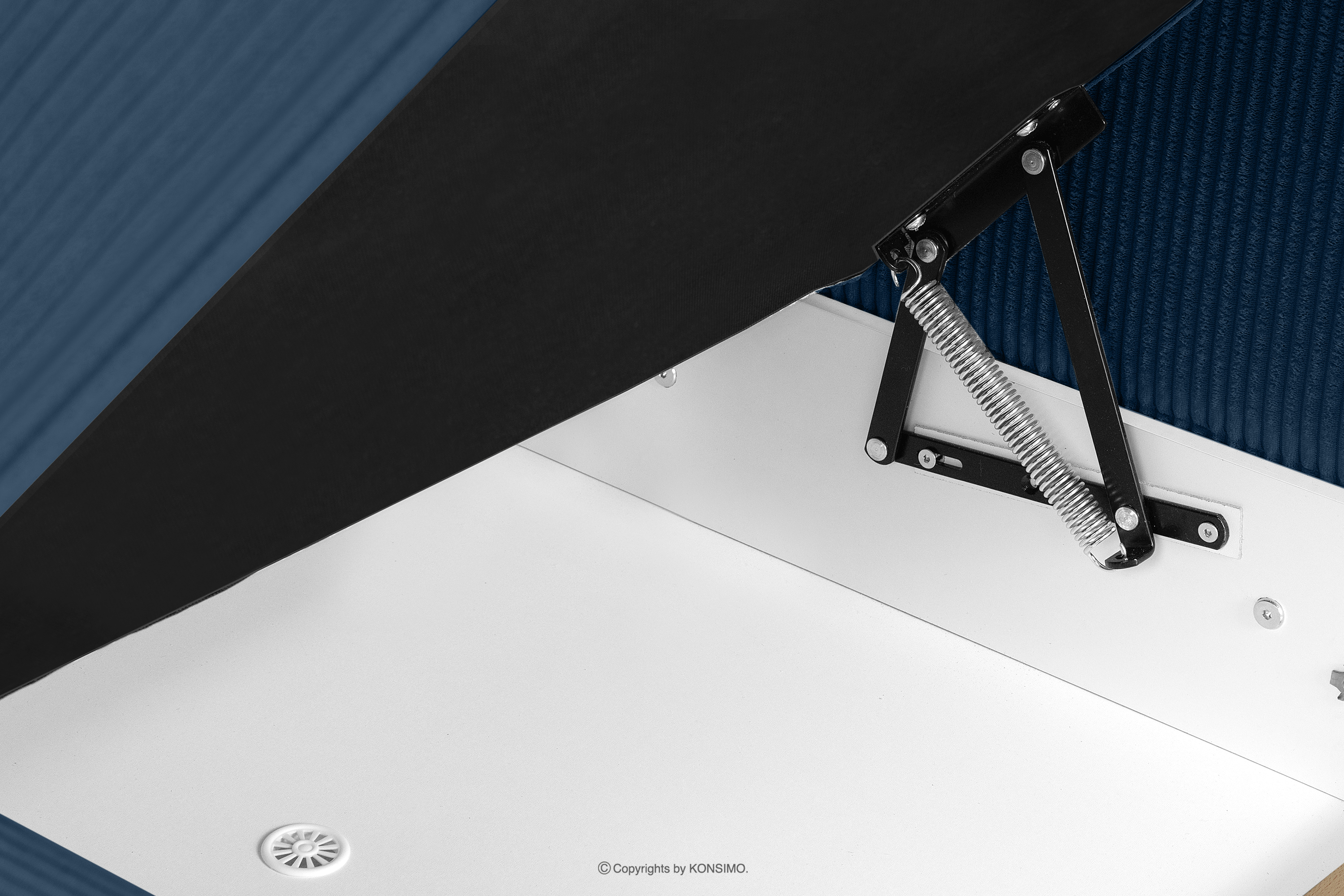 Das ausklappbare Ecksofa auf Beinen in Kordstoff navy blue right ist eine einzigartige Kombination aus Funktionalität, Komfort und Eleganz. Das Gestell aus Kiefern- und Buchenholz garantiert die Langlebigkeit und Solidität der Struktur, die das Möbelstück perfekt für den täglichen Gebrauch macht. Die bei der Herstellung verwendeten Materialien, wie Span- und Faserplatten, wurden sorgfältig ausgewählt, um eine lange Nutzungsdauer zu gewährleisten.