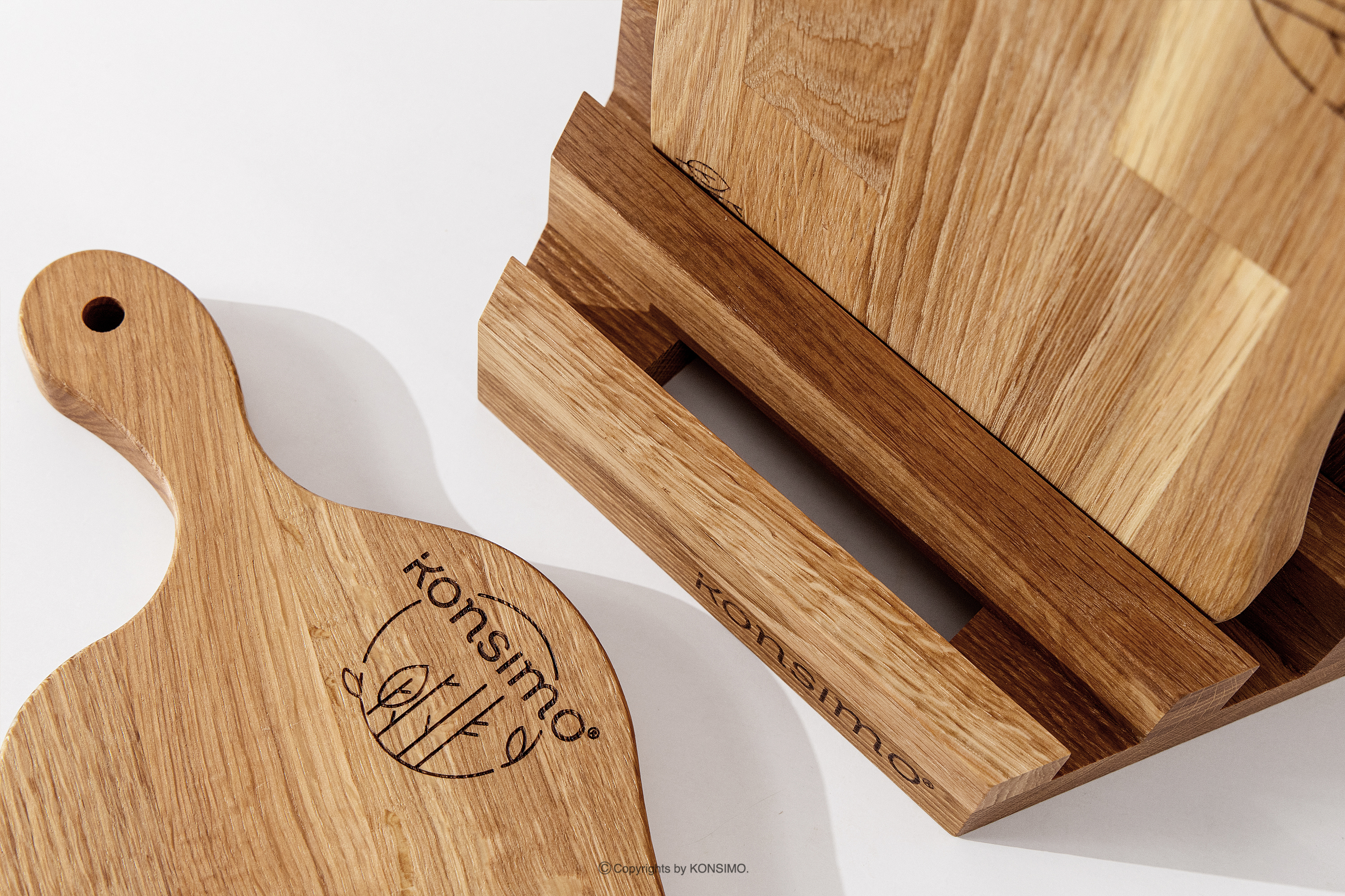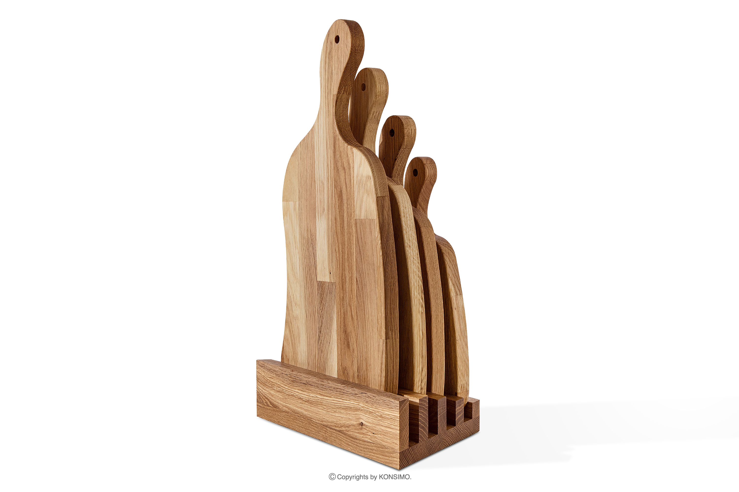 SOLIDA, https://konsimo.de/kollektion/solida/ 4er-Set Küchenschneidebretter mit Eichenholzständer Eiche geölt - Foto