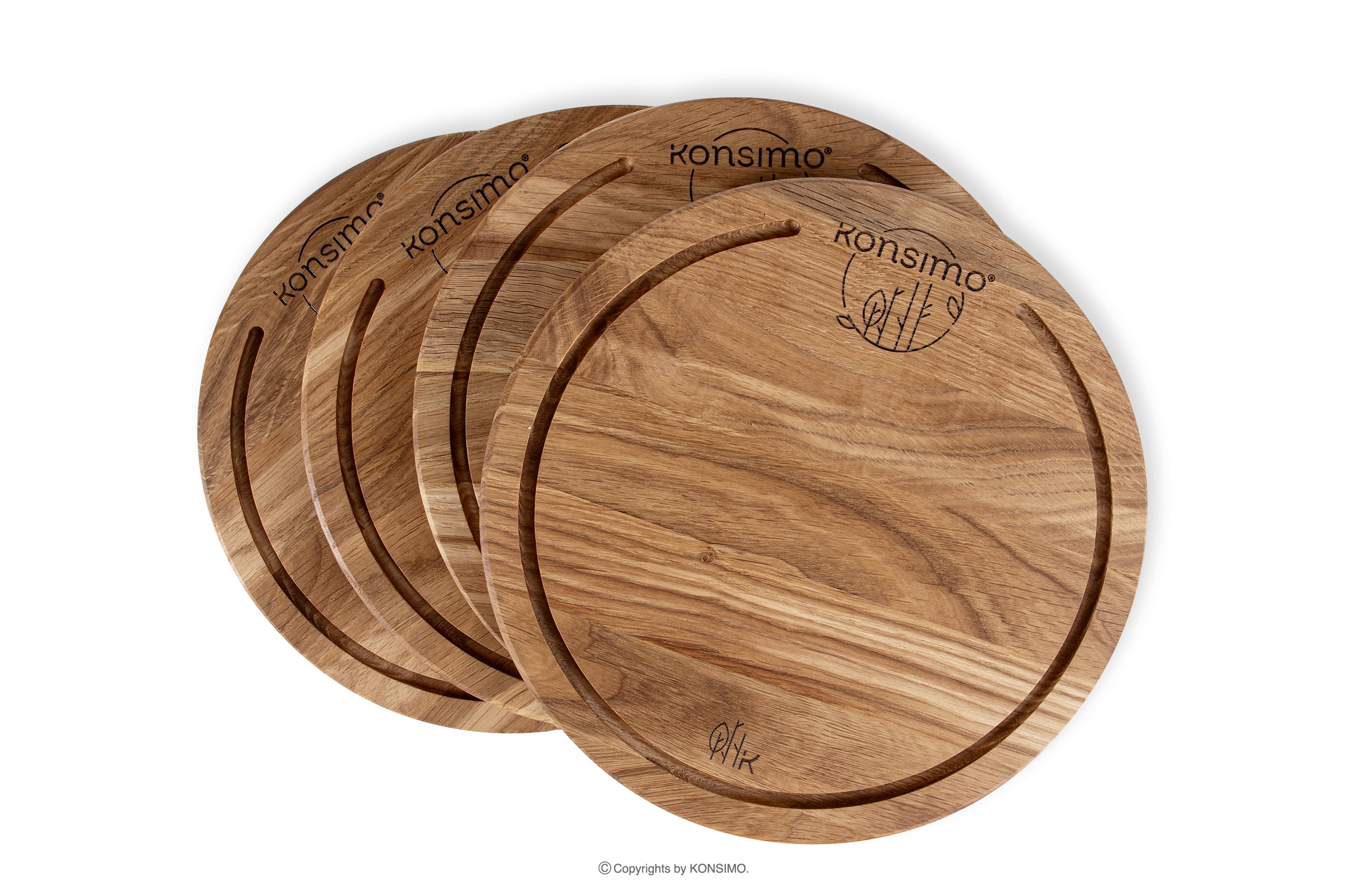 Das runde 4er-Set aus Eichenholz ist nicht nur praktisch im Gebrauch, sondern dient auch als Design-Accessoire zum Servieren von Snacks oder Gerichten. Seine runde Form aus hochwertigem Eichenholz verleiht ihm sowohl Eleganz als auch Haltbarkeit und Stärke. Dadurch eignet es sich perfekt zum Schneiden einer Vielzahl von Produkten, ohne dass die Messer stumpf werden.