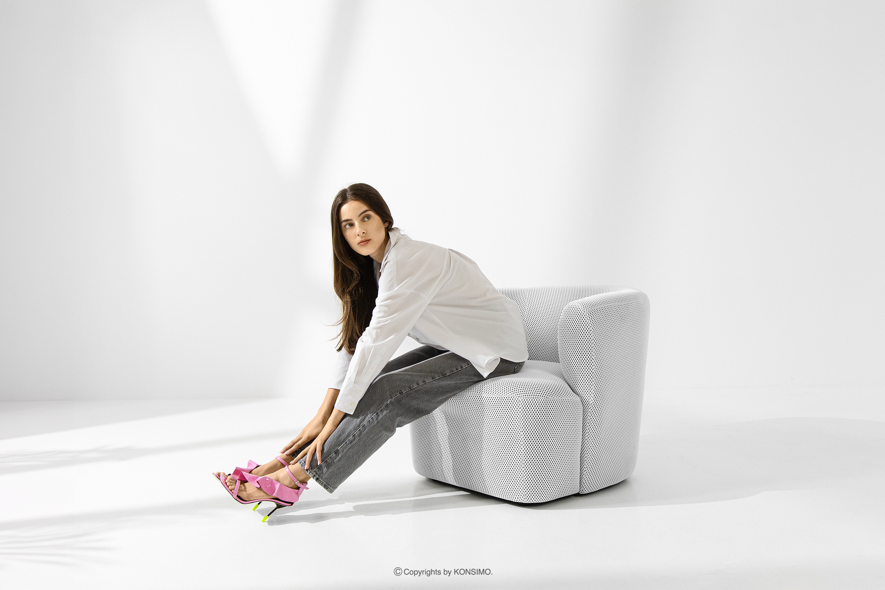 Der moderne Sessel aus weißem 3d-Stoff ist ein Produkt mit außergewöhnlichem Komfort und einzigartigem Design. Er zeichnet sich vor allem durch seine 3d-Polsterung aus, die das moderne Design unterstreicht. Der Schaumstoff T35 ist ein Material mit hoher Dichte, das sich durch außergewöhnliche Elastizität und Haltbarkeit auszeichnet. Er zeichnet sich durch eine hervorragende Verformungsbeständigkeit aus, was bedeutet, dass mit diesem Schaumstoff gefüllte Möbel über viele Jahre hinweg ihre Form und Eigenschaften behalten.