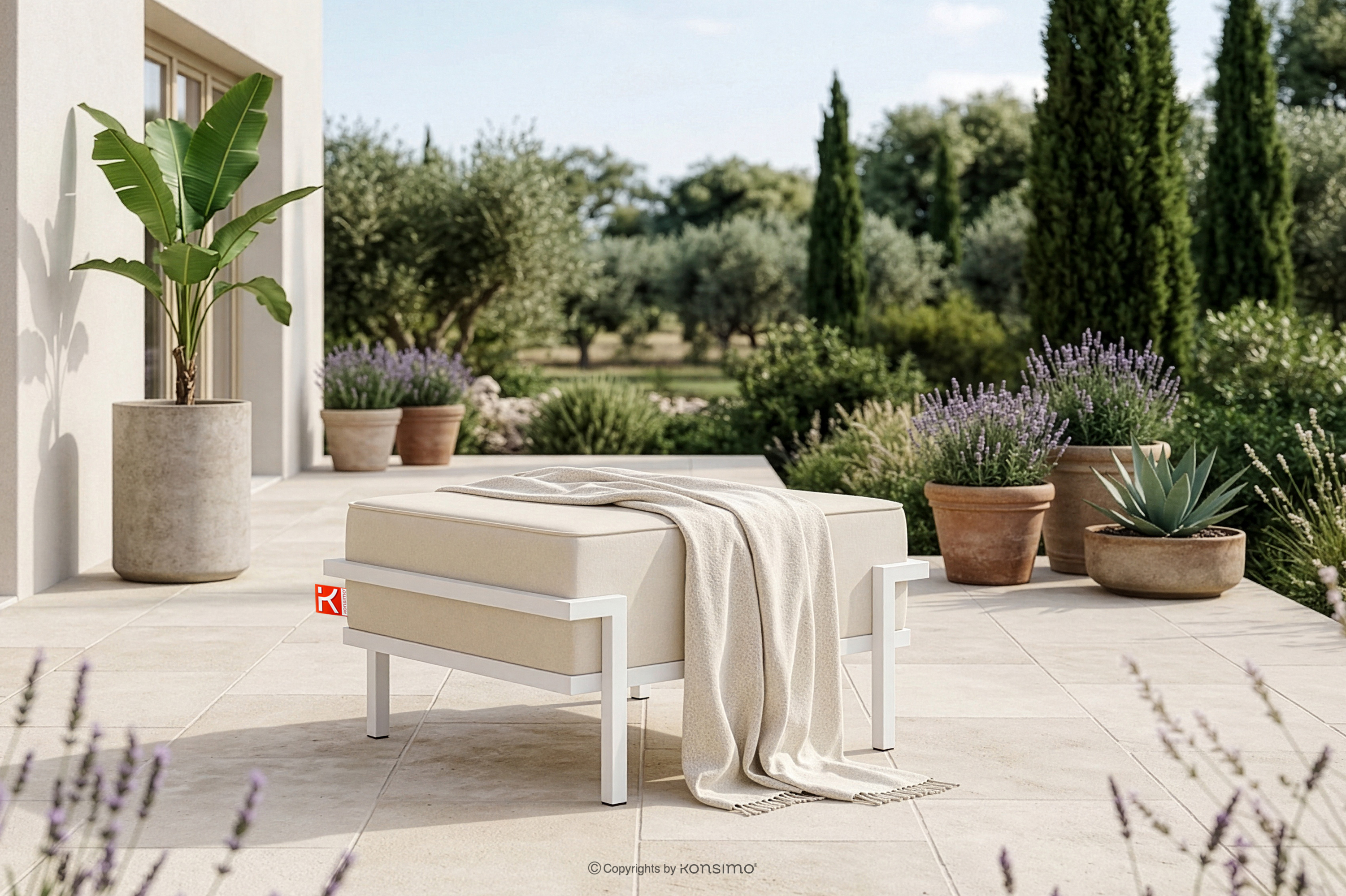 Der Sitzhocker auf Metallbeinen weiß/creme aus robustem Stahl verleiht Ihrem Raum nicht nur Eleganz, sondern bietet auch außergewöhnlichen Komfort. Dank des weichen Schaumstoffs der Sitzfläche wird das Entspannen im Freien zu einem wahren Vergnügen. Das Möbelstück steht auf massiven, pulverbeschichteten Stahlbeinen und bleibt auch bei intensiver Nutzung stabil. Es ist die ideale Wahl für alle, die Stil und Funktionalität in ihrem Garten zu schätzen wissen.