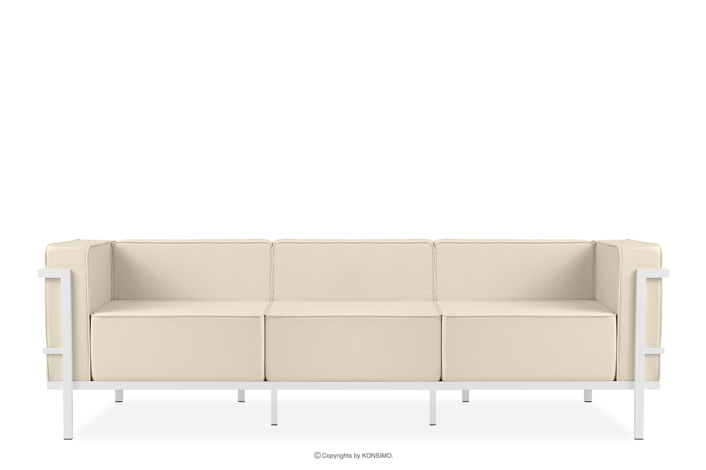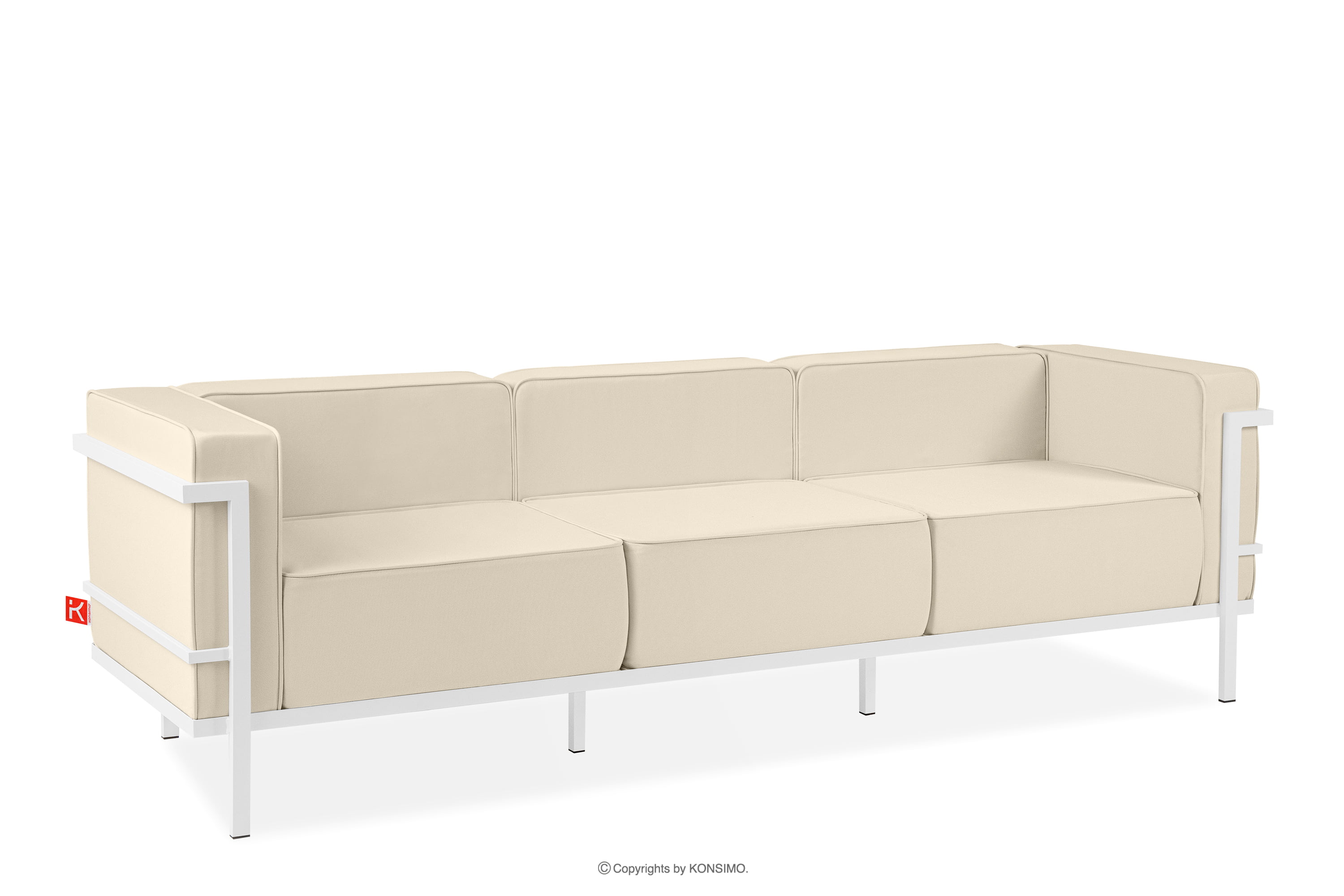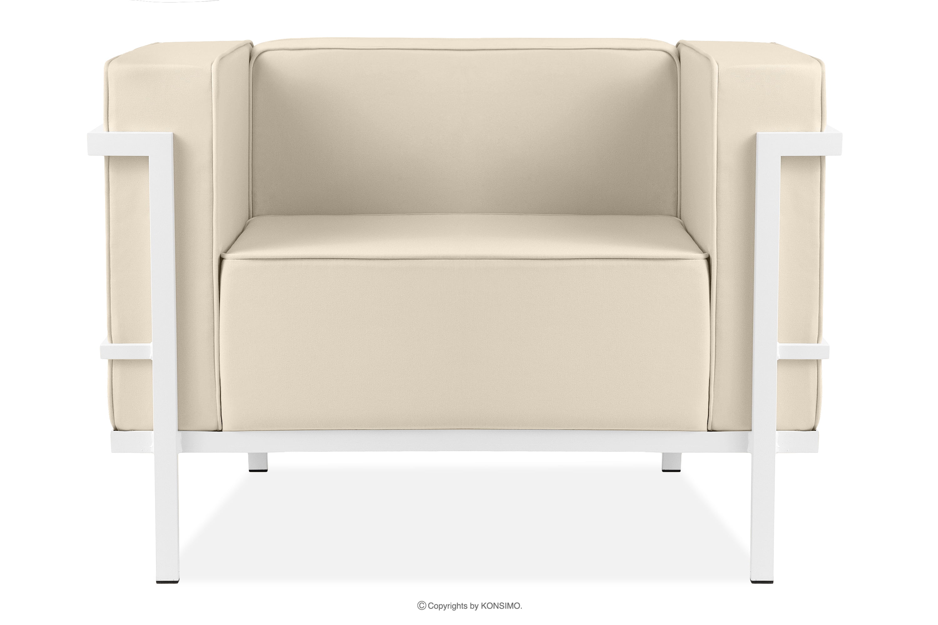 Das moderne weiß/cremefarbene Gartenmöbelset (1.1.3.1) aus robustem dunkelgrau/hellgrauem Stahl auf Metallfüßen verleiht dem Raum nicht nur Eleganz, sondern bietet auch außergewöhnlichen Komfort. Dank des weichen Schaumstoffs von Sitz und Rückenlehne wird das Entspannen im Freien zu einem echten Vergnügen. Das auf massiven, pulverbeschichteten Stahlbeinen stehende Möbel bleibt auch bei intensiver Nutzung stabil.
