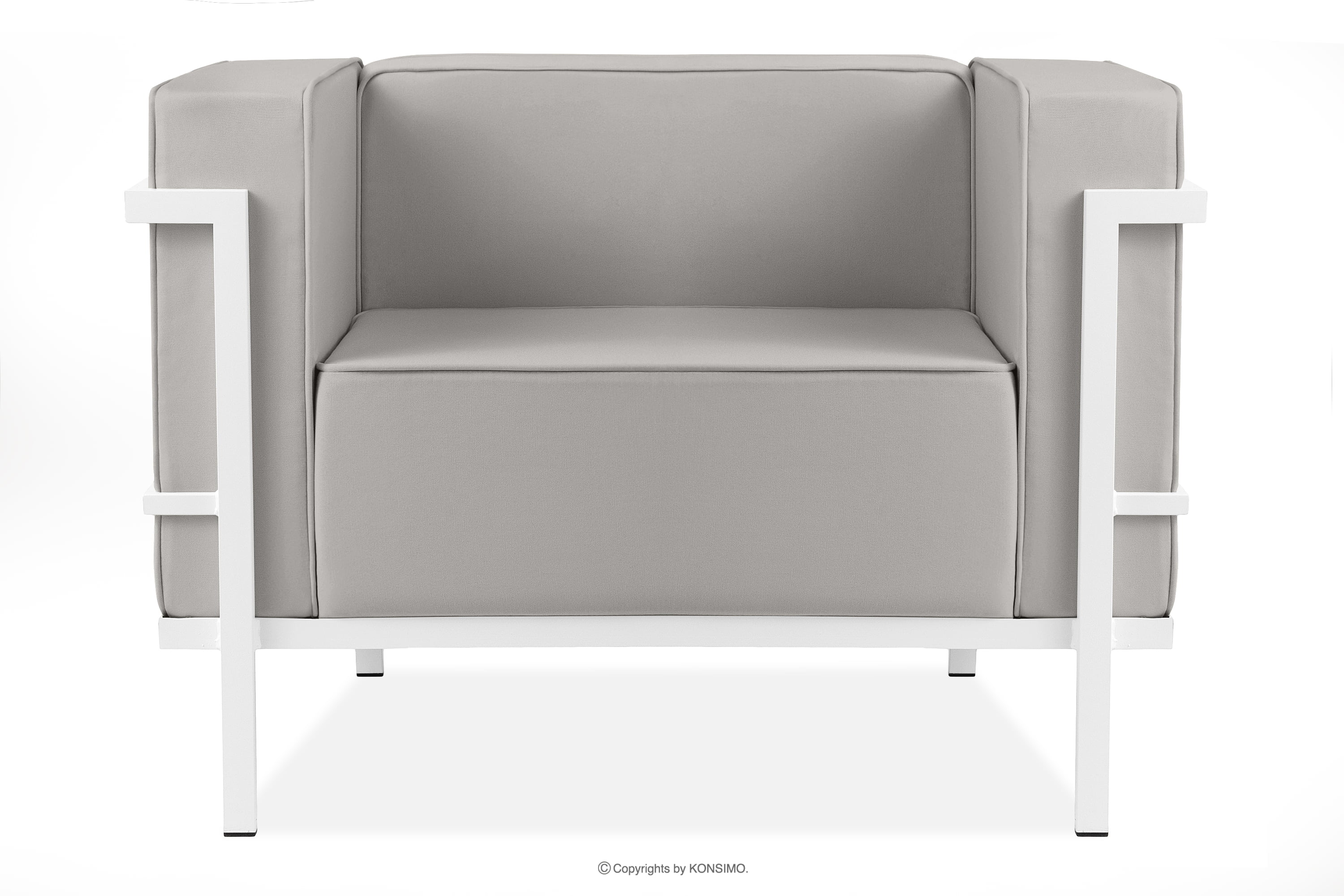 Das moderne weiß/hellgraue Gartenmöbelset (1.1.3.1) aus robustem dunkelgrau/hellgrauem Stahl auf Metallfüßen verleiht dem Raum nicht nur Eleganz, sondern bietet auch außergewöhnlichen Komfort. Dank des weichen Schaumstoffs von Sitz und Rückenlehne wird das Entspannen im Freien zu einem echten Vergnügen. Das auf massiven, pulverbeschichteten Stahlbeinen stehende Möbel bleibt auch bei intensiver Nutzung stabil.