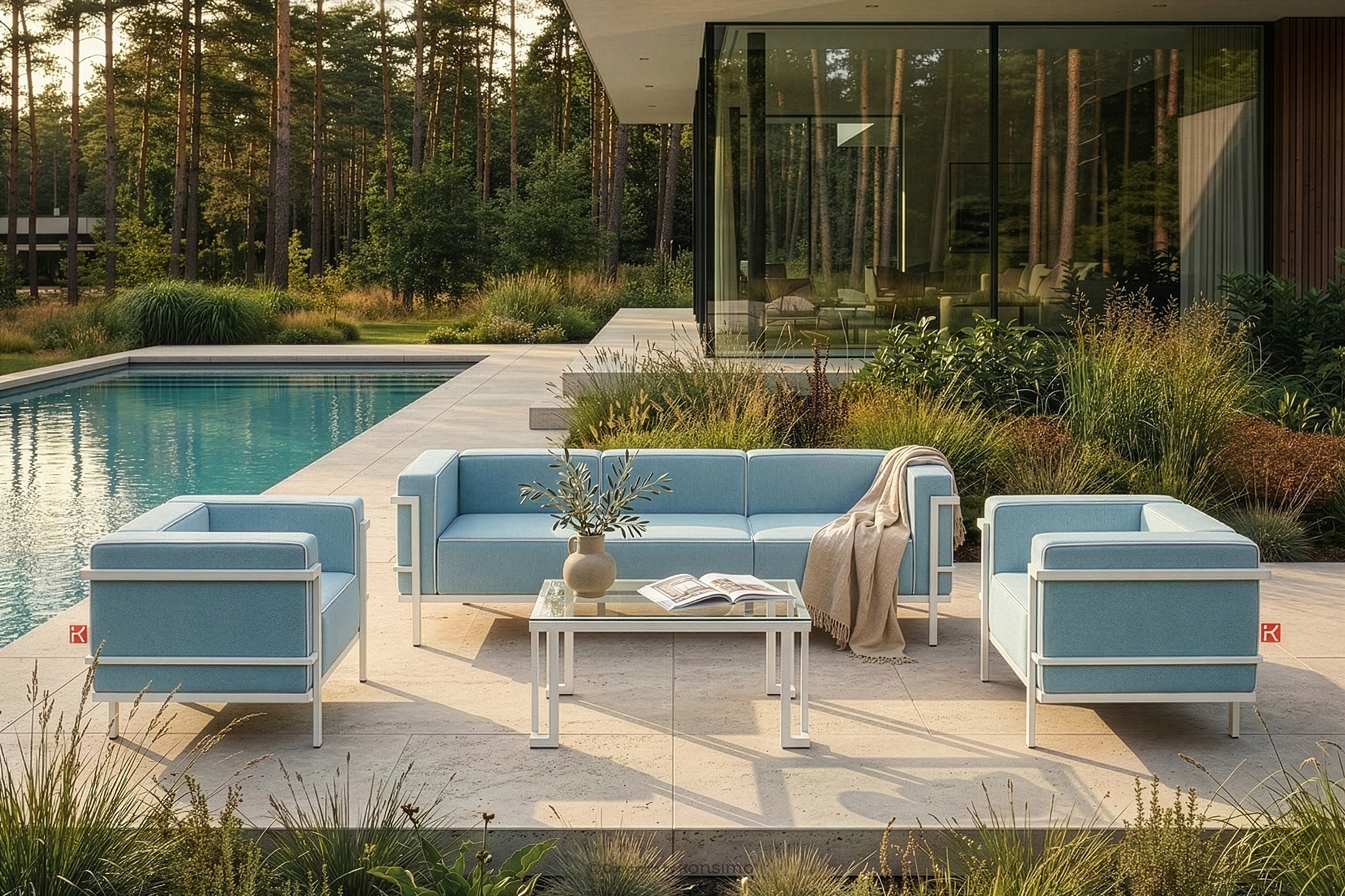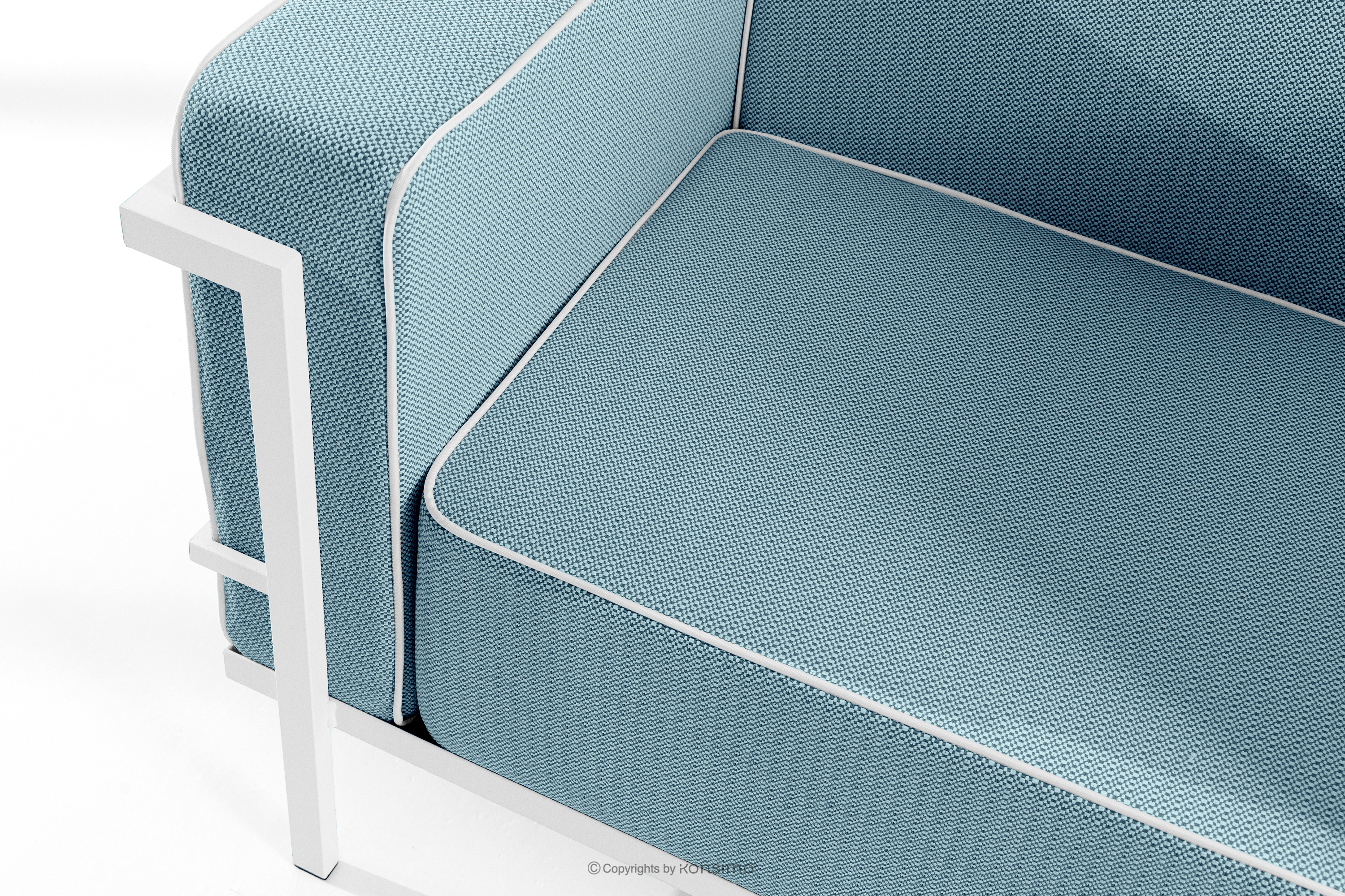 für das Produkt Modernes Gartensofa 3 auf Metallbeinen, weiß/meerblau/weiß