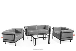 Gartenmöbel-Set 2x Sessel, Zweisitzer-Sofa, Tisch dunkelgrau/schwarz/weiß aus strapazierfähigem Stahl gefertigt, verleiht dem Raum nicht nur Eleganz, sondern sorgt auch für außergewöhnlichen Komfort. Dank der weichen Schaumstoffpolsterung von Sitzfläche und Rückenlehne wird das Entspannen im Freien zu einem wahren Vergnügen. Das Möbelstück steht auf soliden Beinen aus pulverbeschichtetem Stahl und bleibt auch bei intensiver Nutzung stabil.