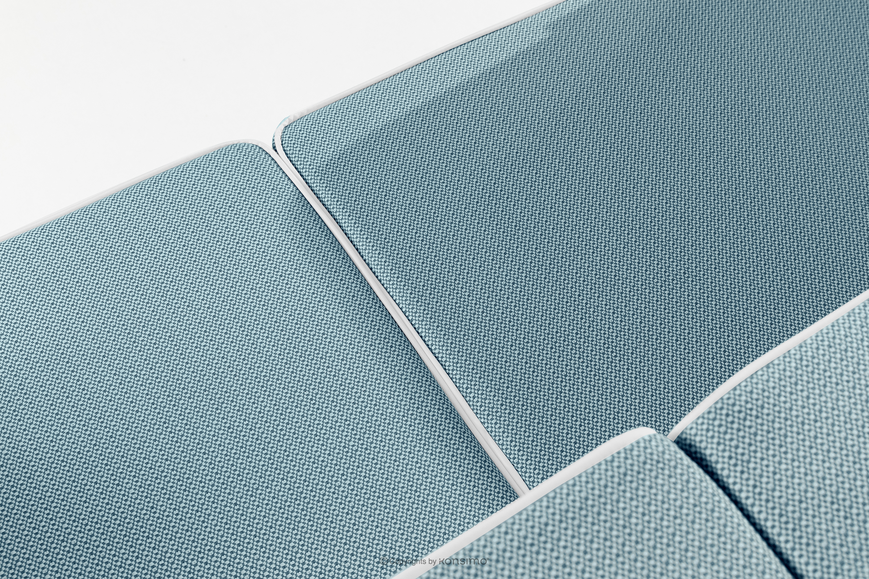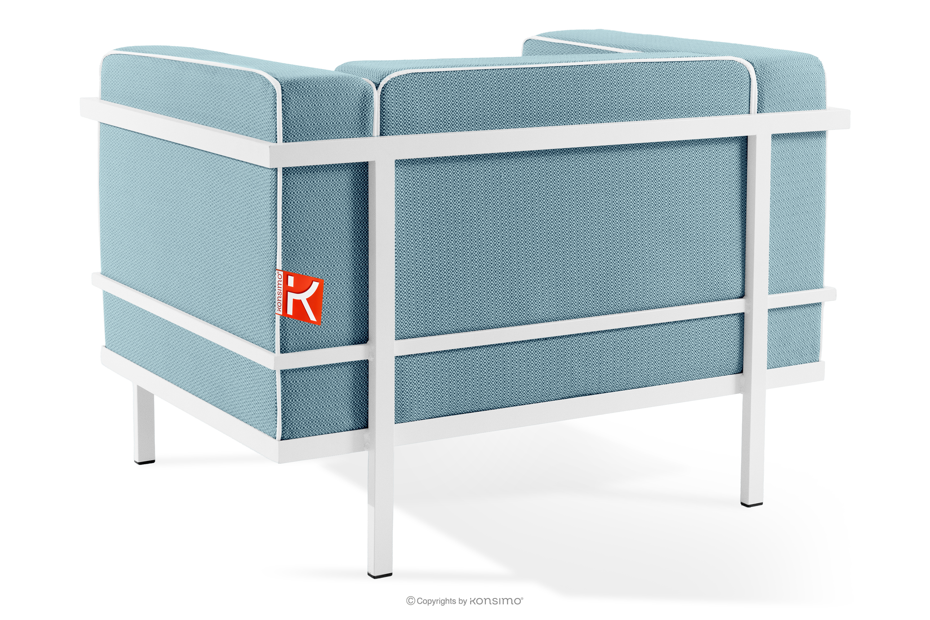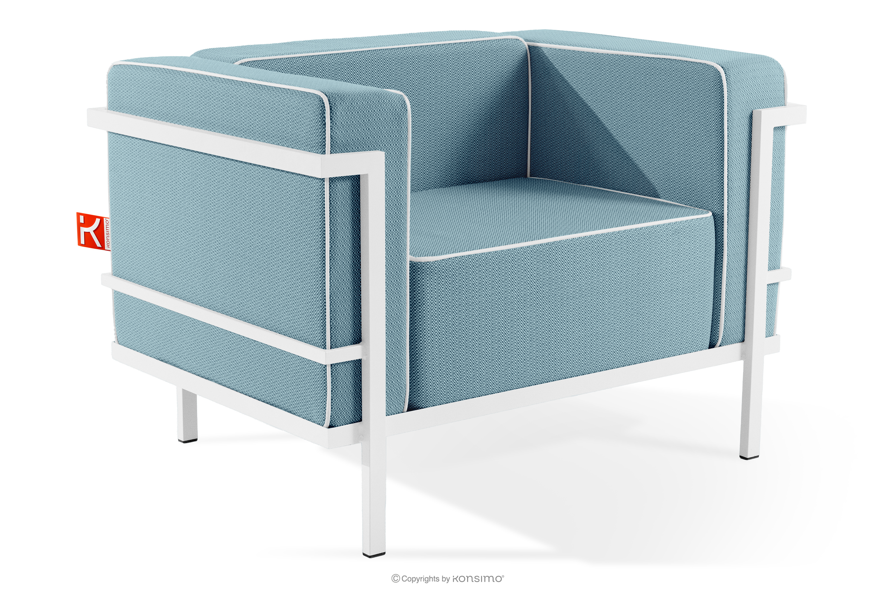 Gartenmöbel-Set 2x Sessel, Dreisitzer-Sofa, Tisch weiß/meerblau/weiß aus strapazierfähigem Stahl gefertigt, verleiht dem Raum nicht nur Eleganz, sondern sorgt auch für außergewöhnlichen Komfort. Dank der weichen Schaumstoffpolsterung von Sitzfläche und Rückenlehne wird das Entspannen im Freien zu einem wahren Vergnügen. Das Möbelstück steht auf soliden Beinen aus pulverbeschichtetem Stahl und bleibt auch bei intensiver Nutzung stabil.