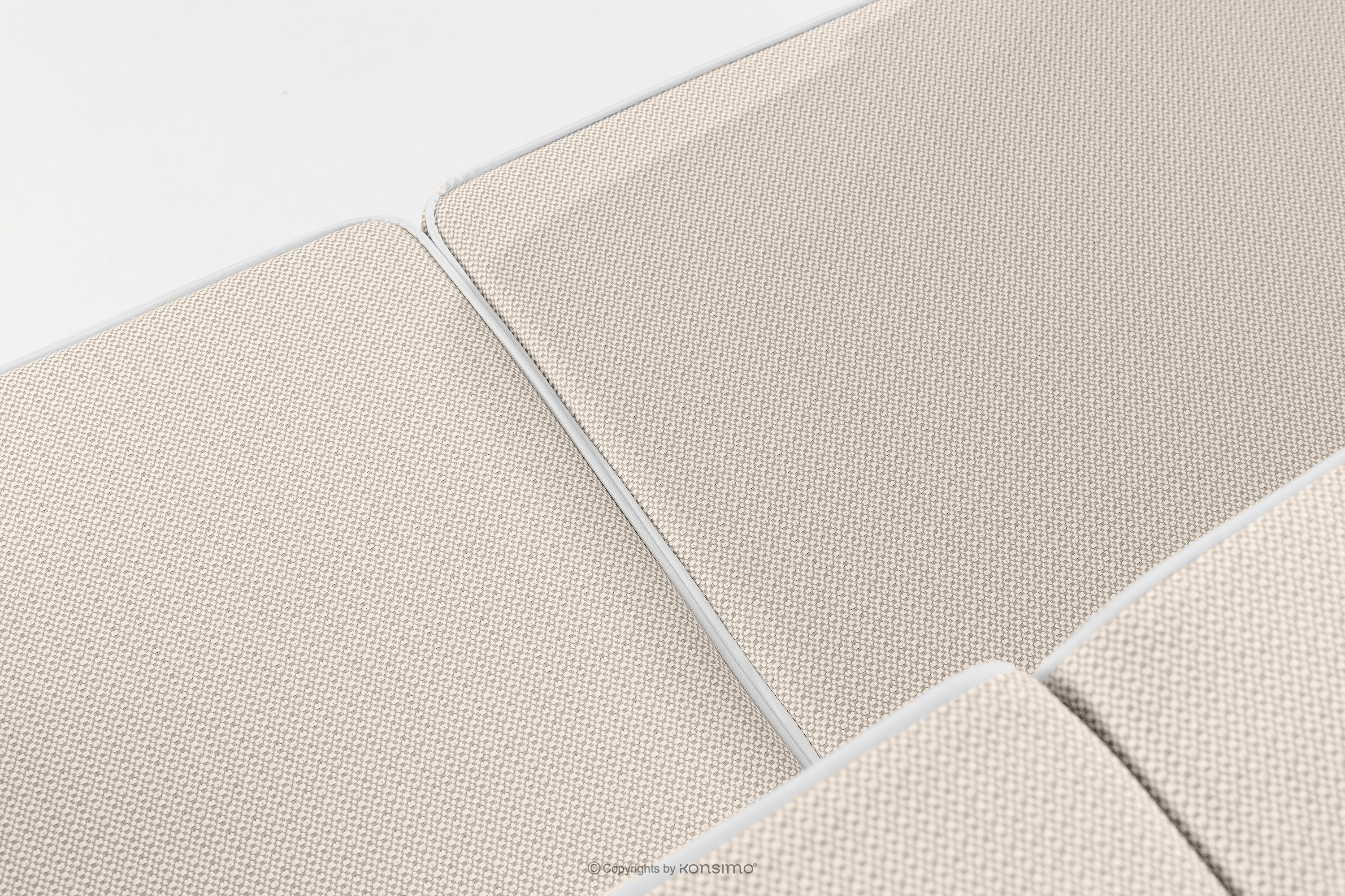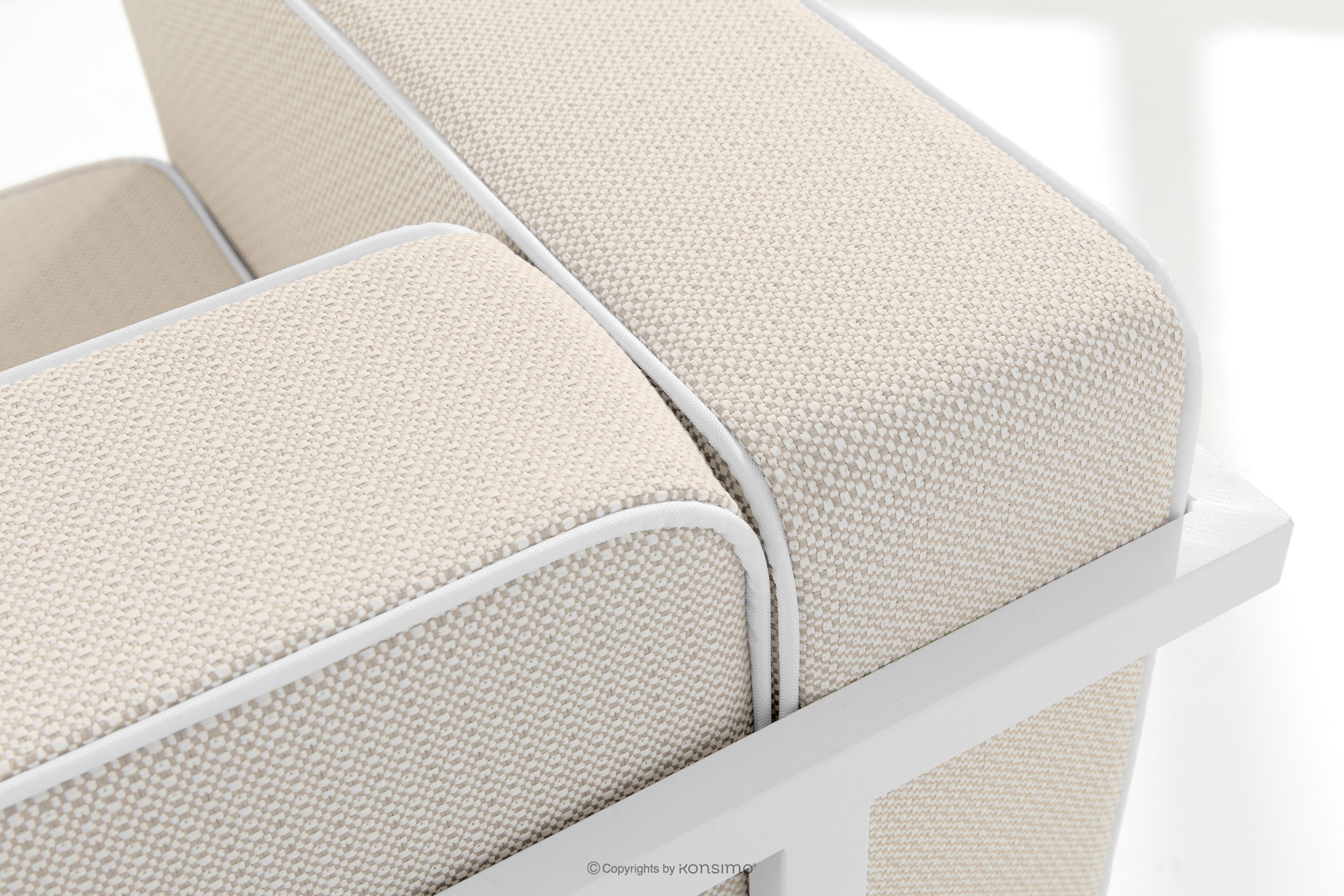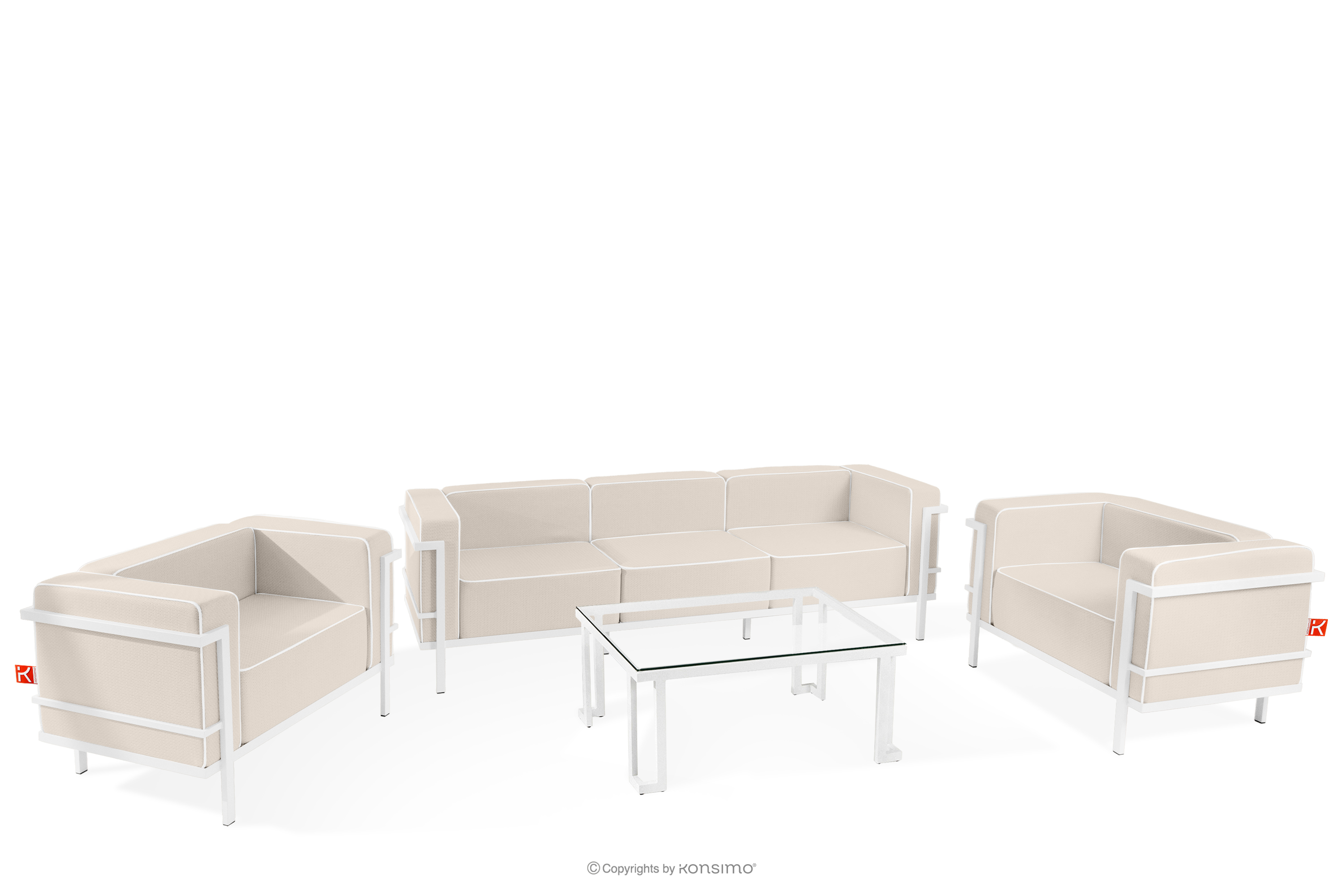 Gartenmöbel-Set 2x Sessel, Dreisitzer-Sofa, Tisch weiß/dunkelbeige/weiß aus strapazierfähigem Stahl gefertigt, verleiht dem Raum nicht nur Eleganz, sondern sorgt auch für außergewöhnlichen Komfort. Dank der weichen Schaumstoffpolsterung von Sitzfläche und Rückenlehne wird das Entspannen im Freien zu einem wahren Vergnügen. Das Möbelstück steht auf soliden Beinen aus pulverbeschichtetem Stahl und bleibt auch bei intensiver Nutzung stabil.