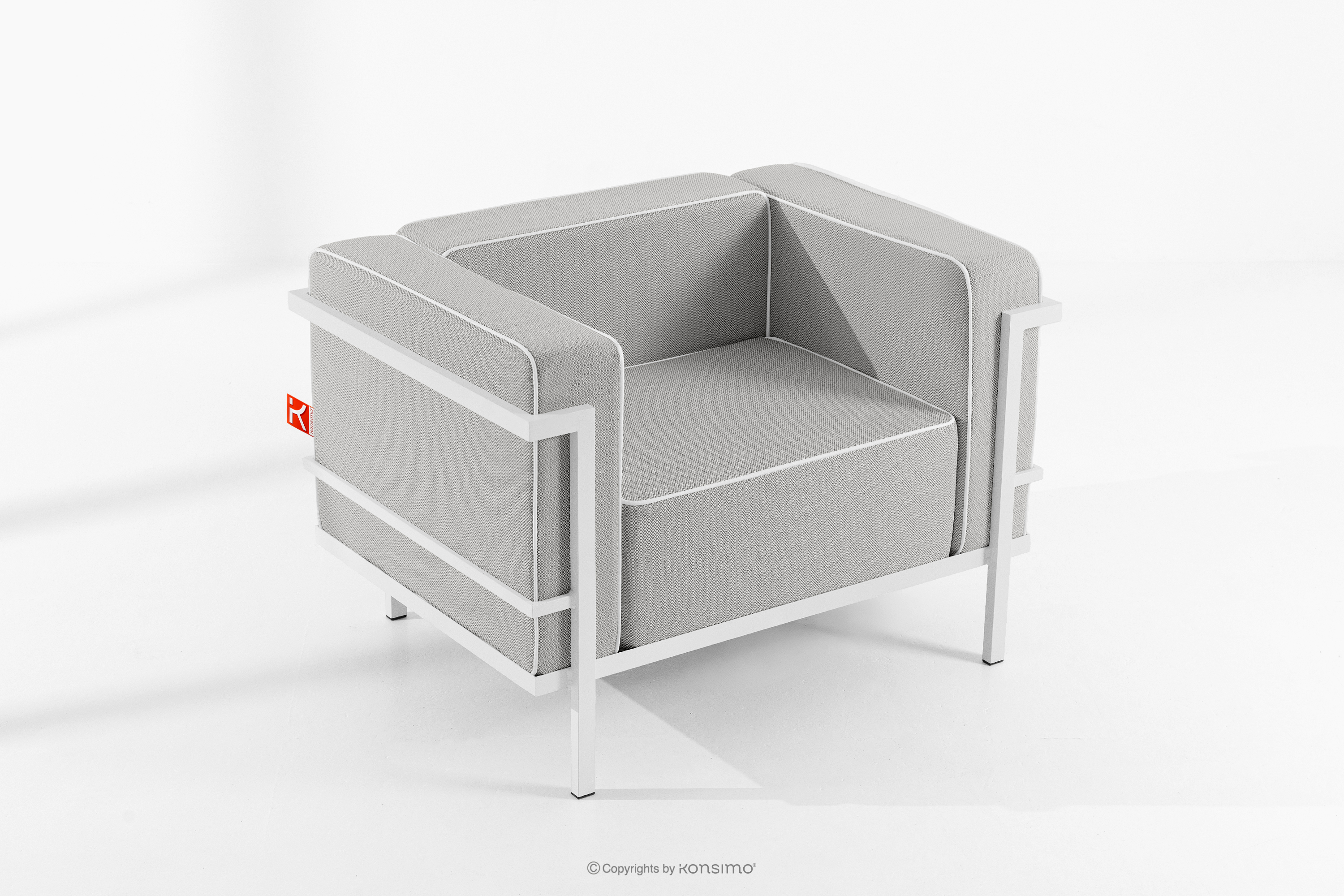 Gartenmöbel-Set 2x Sessel, Dreisitzer-Sofa, Tisch weiß/dunkelgrau/weiß aus strapazierfähigem Stahl gefertigt, verleiht dem Raum nicht nur Eleganz, sondern sorgt auch für außergewöhnlichen Komfort. Dank der weichen Schaumstoffpolsterung von Sitzfläche und Rückenlehne wird das Entspannen im Freien zu einem wahren Vergnügen. Das Möbelstück steht auf soliden Beinen aus pulverbeschichtetem Stahl und bleibt auch bei intensiver Nutzung stabil.