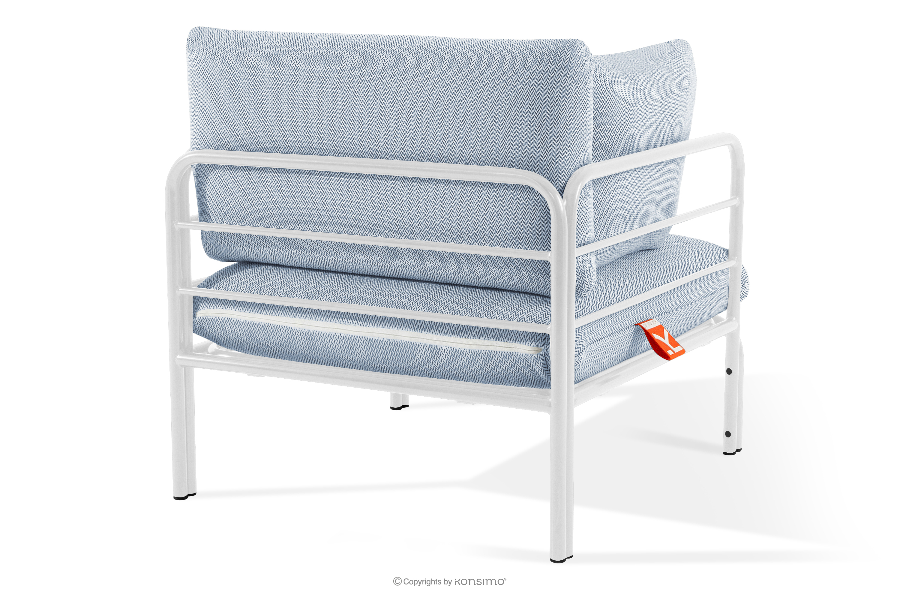 Loft-Gartenstuhl mit Metallbeinen, weiß/hellblau/weiß aus strapazierfähigem Stahl gefertigt, verleiht dem Raum nicht nur Eleganz, sondern sorgt auch für außergewöhnlichen Komfort. Dank der weichen Schaumstoffpolsterung von Sitzfläche und Rückenlehne wird das Entspannen im Freien zu einem wahren Vergnügen. Das Möbelstück steht auf soliden Beinen aus pulverbeschichtetem Stahl und bleibt auch bei intensiver Nutzung stabil.