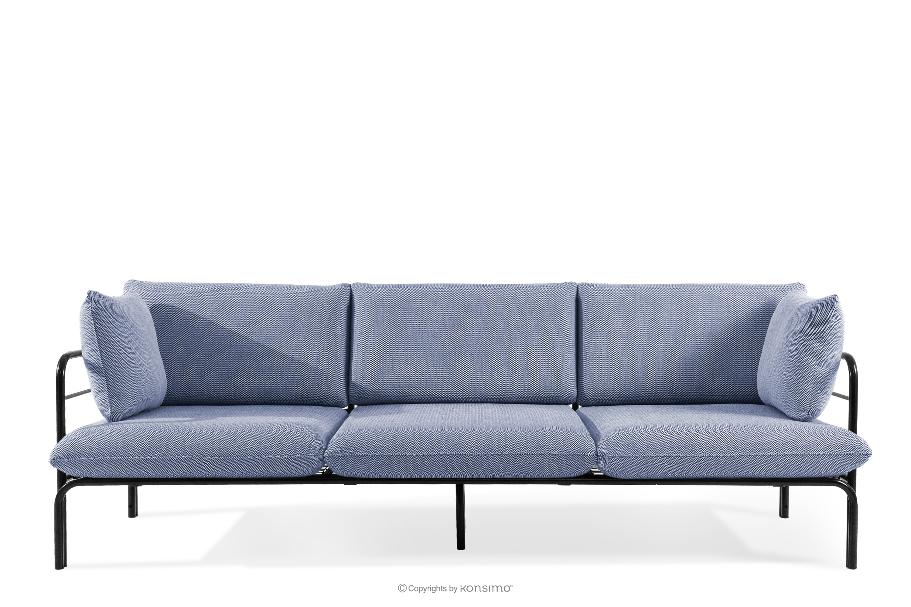 Loft-Gartensofa 3 auf Metallbeinen anthrazit/marineblau/weiß aus strapazierfähigem Stahl gefertigt, verleiht dem Raum nicht nur Eleganz, sondern sorgt auch für außergewöhnlichen Komfort. Dank der weichen Schaumstoffpolsterung von Sitzfläche und Rückenlehne wird das Entspannen im Freien zu einem wahren Vergnügen. Das Möbelstück steht auf soliden Beinen aus pulverbeschichtetem Stahl und bleibt auch bei intensiver Nutzung stabil.