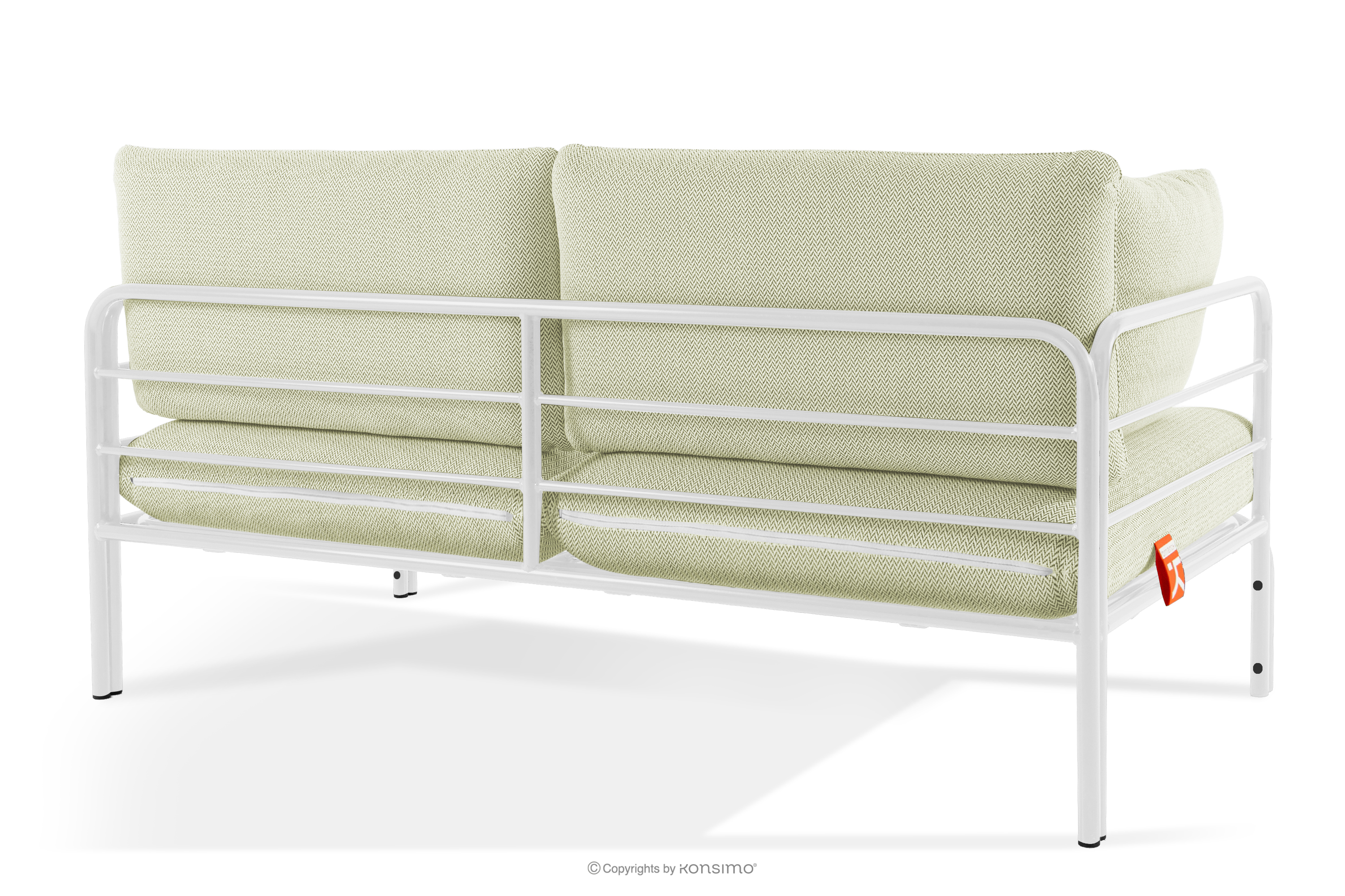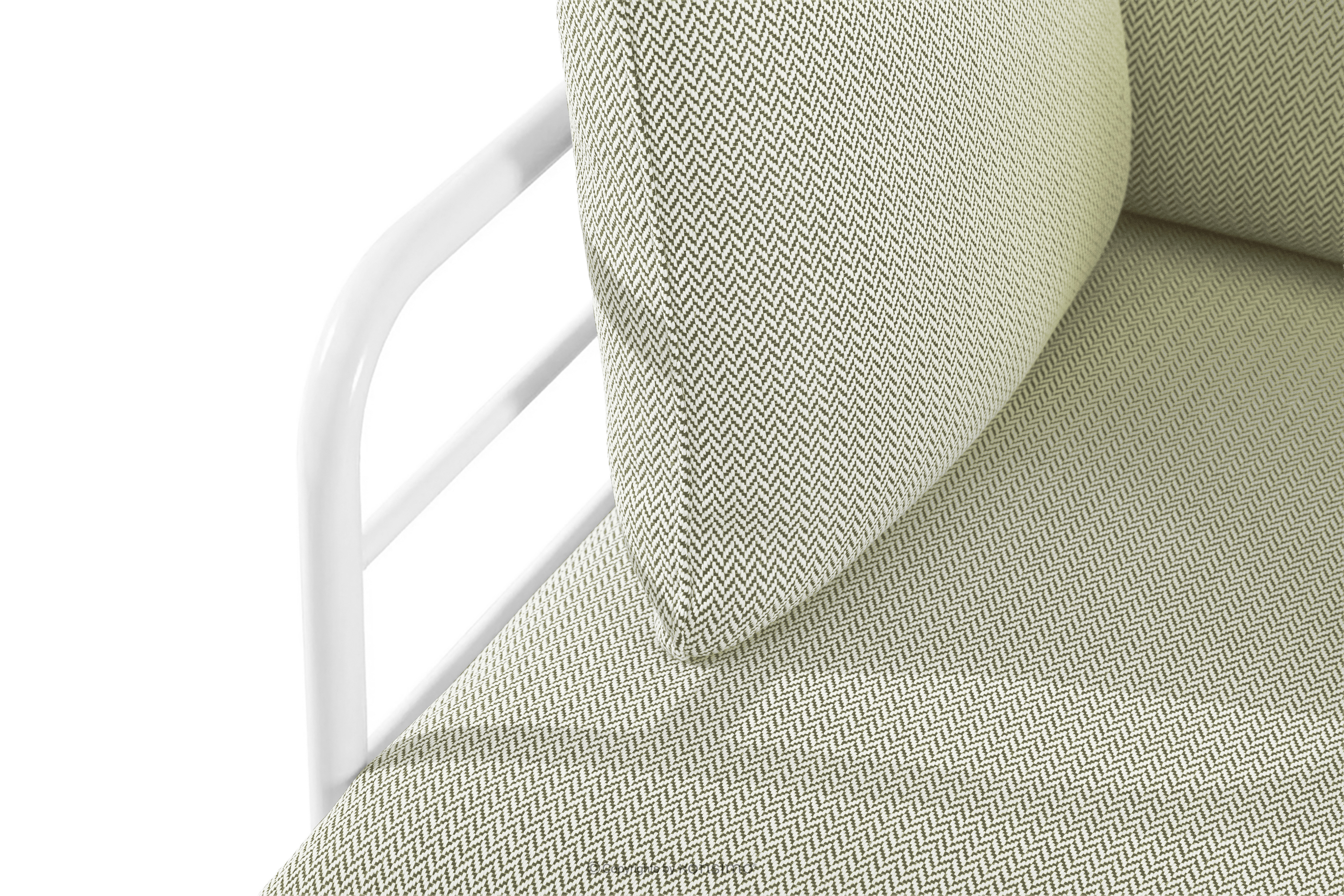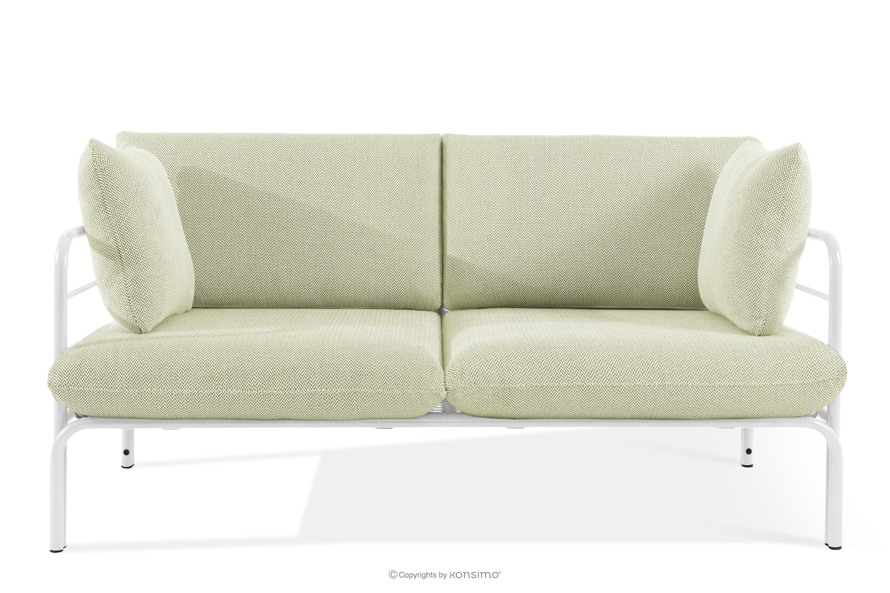 Gartenmöbel-Set 2x Sessel, Zweisitzer-Sofa, Tisch weiß/hellgrün/weiß aus strapazierfähigem Stahl gefertigt, verleiht dem Raum nicht nur Eleganz, sondern sorgt auch für außergewöhnlichen Komfort. Dank der weichen Schaumstoffpolsterung von Sitzfläche und Rückenlehne wird das Entspannen im Freien zu einem wahren Vergnügen. Das Möbelstück steht auf soliden Beinen aus pulverbeschichtetem Stahl und bleibt auch bei intensiver Nutzung stabil.
