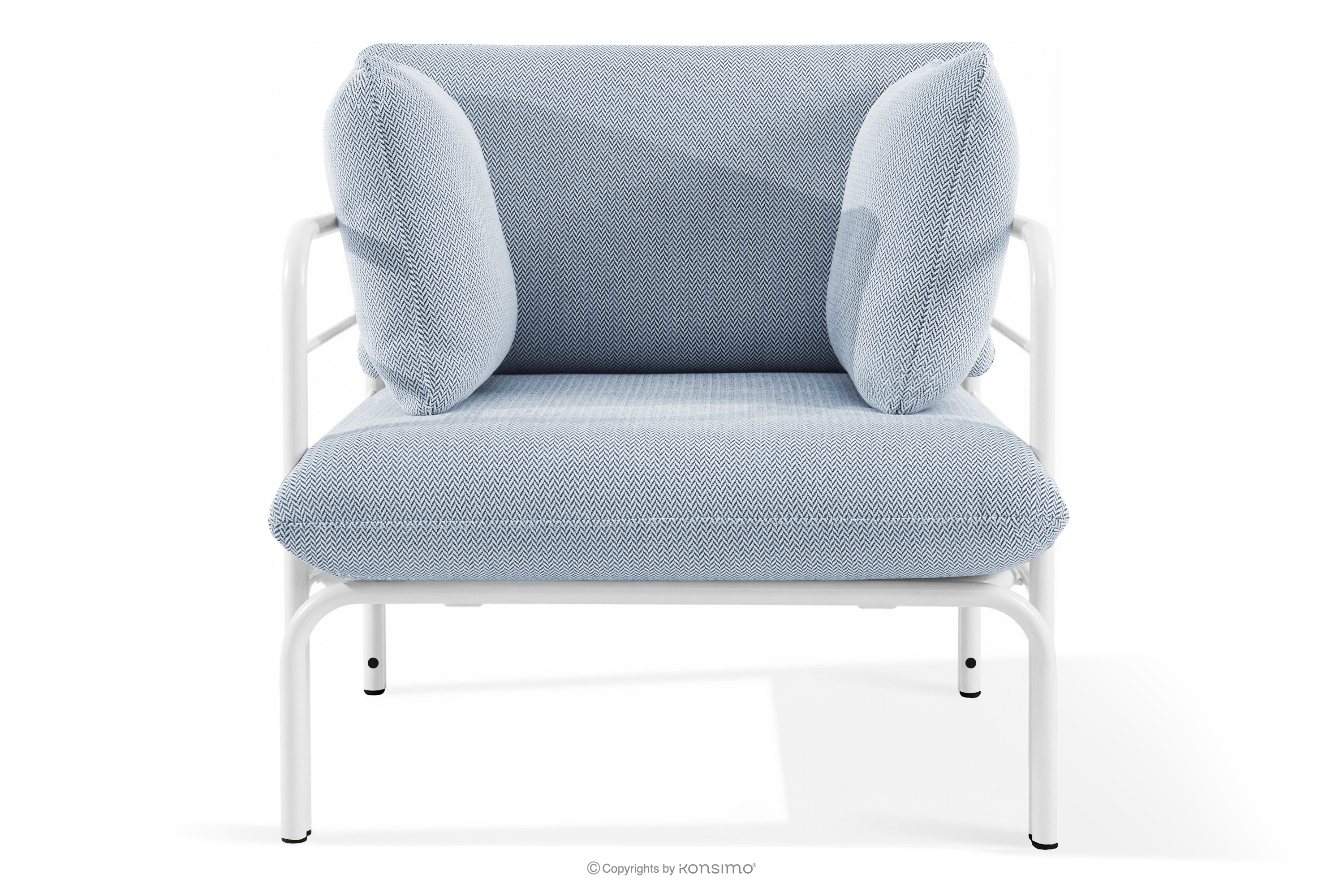 Gartenmöbel-Set 2x Sessel, Zweisitzer-Sofa, Tisch weiß/hellblau/weiß aus strapazierfähigem Stahl gefertigt, verleiht dem Raum nicht nur Eleganz, sondern sorgt auch für außergewöhnlichen Komfort. Dank der weichen Schaumstoffpolsterung von Sitzfläche und Rückenlehne wird das Entspannen im Freien zu einem wahren Vergnügen. Das Möbelstück steht auf soliden Beinen aus pulverbeschichtetem Stahl und bleibt auch bei intensiver Nutzung stabil.