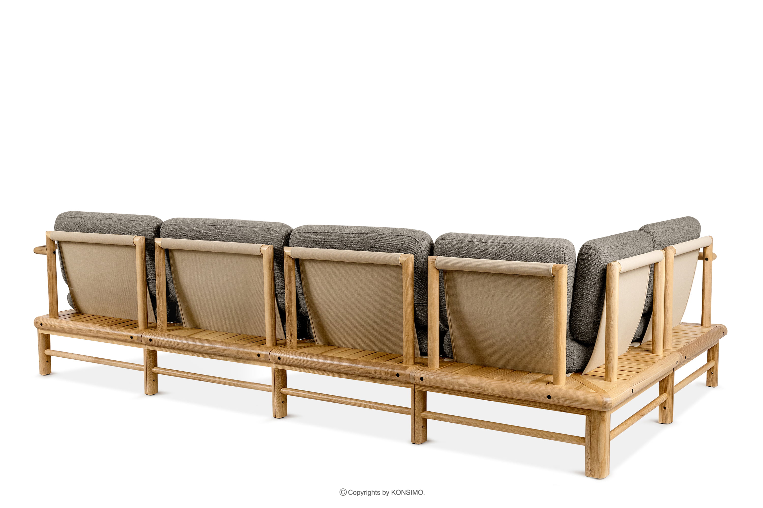 Das graue Ecksofa aus Holz im Boho-Stil ist ein einzigartiges Produkt, das Ihren Raum verschönern wird. Die Sitz- und Rückenkissen sind mit hochwertigem PU-Schaumstoff für unvergleichlichen Komfort gefüllt. Der Stoffbezug, der zu 93% aus recyceltem Polypropylen und zu 7% aus Polyester besteht, ist nicht nur umweltfreundlich, sondern auch pflegeleicht - einfach mit einem feuchten Tuch abwischen.