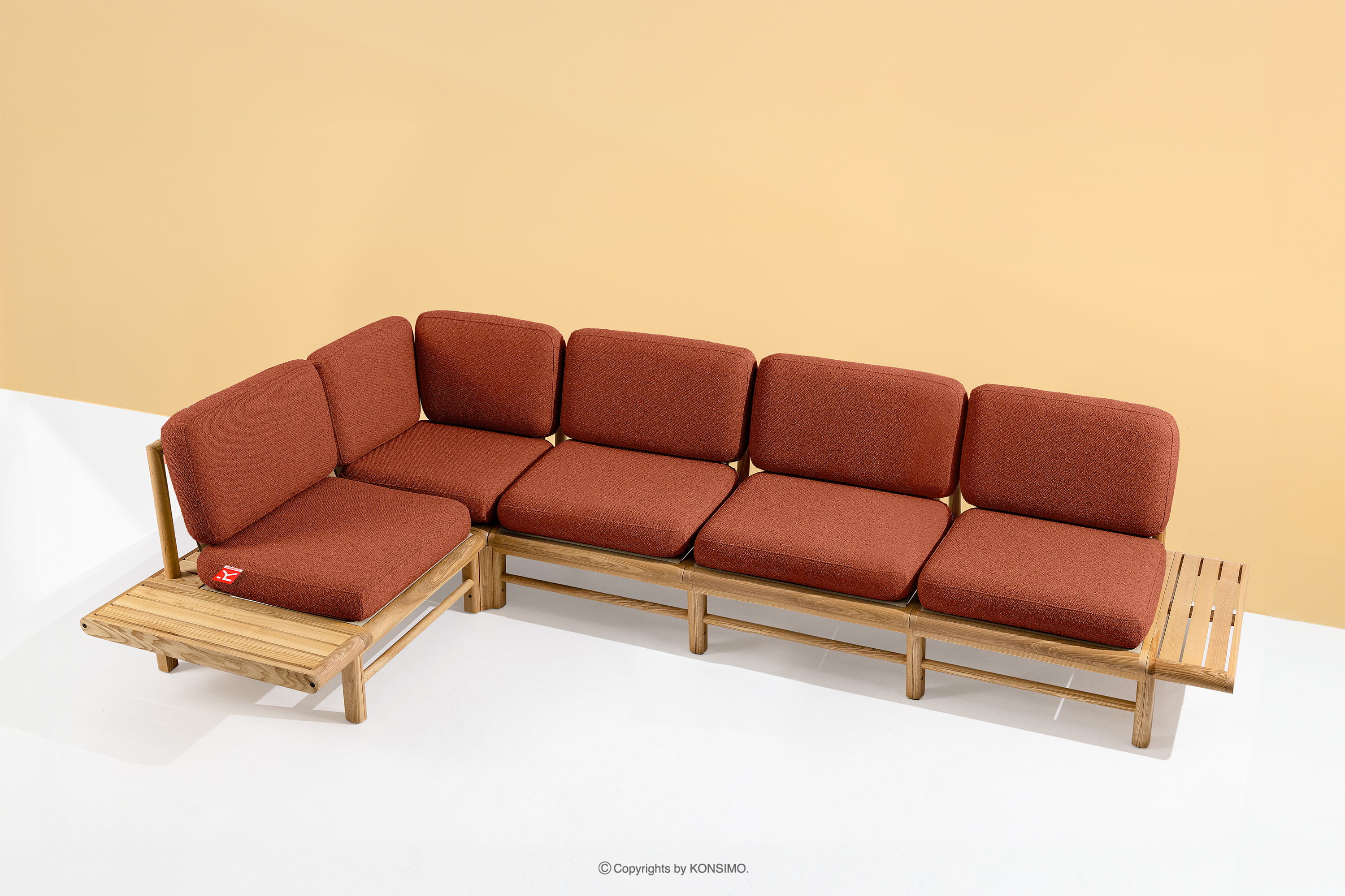 Das Ecksofa aus massivem Eschenholz orange links ist ein einzigartiges Produkt, das Ihren Raum verschönern wird. Die Sitz- und Rückenkissen sind mit hochwertigem PU-Schaumstoff für unvergleichlichen Komfort gefüllt. Der Stoffbezug, der zu 93% aus recyceltem Polypropylen und zu 7% aus Polyester besteht, ist nicht nur umweltfreundlich, sondern auch pflegeleicht - einfach mit einem feuchten Tuch abwischen.