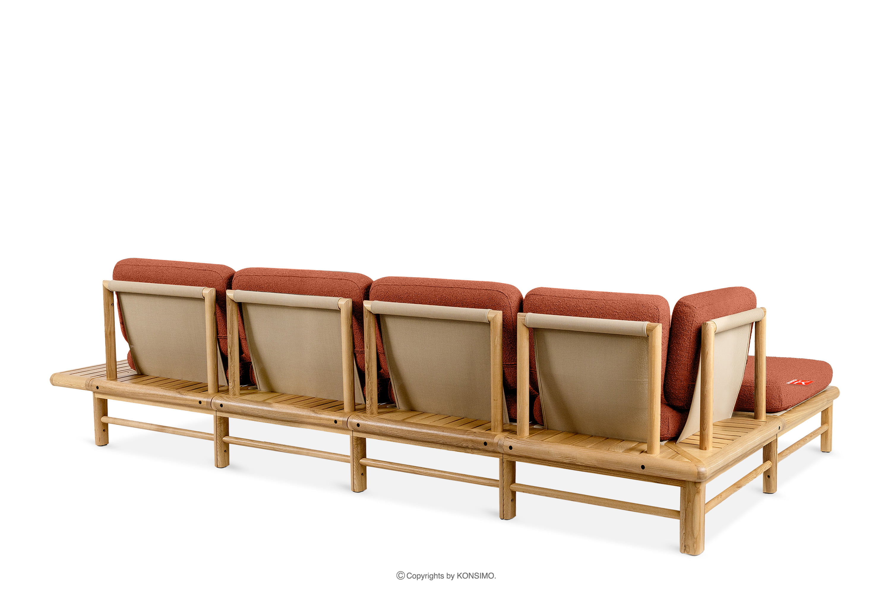 Das Ecksofa aus Holz mit Kissen orange links ist ein einzigartiges Produkt, das Ihren Raum verschönern wird. Die Sitz- und Rückenkissen sind mit hochwertigem PU-Schaumstoff für unvergleichlichen Komfort gefüllt. Der Stoffbezug aus 93% recyceltem Polypropylen und 7% Polyester ist nicht nur umweltfreundlich, sondern auch pflegeleicht - einfach mit einem feuchten Tuch abwischen.
