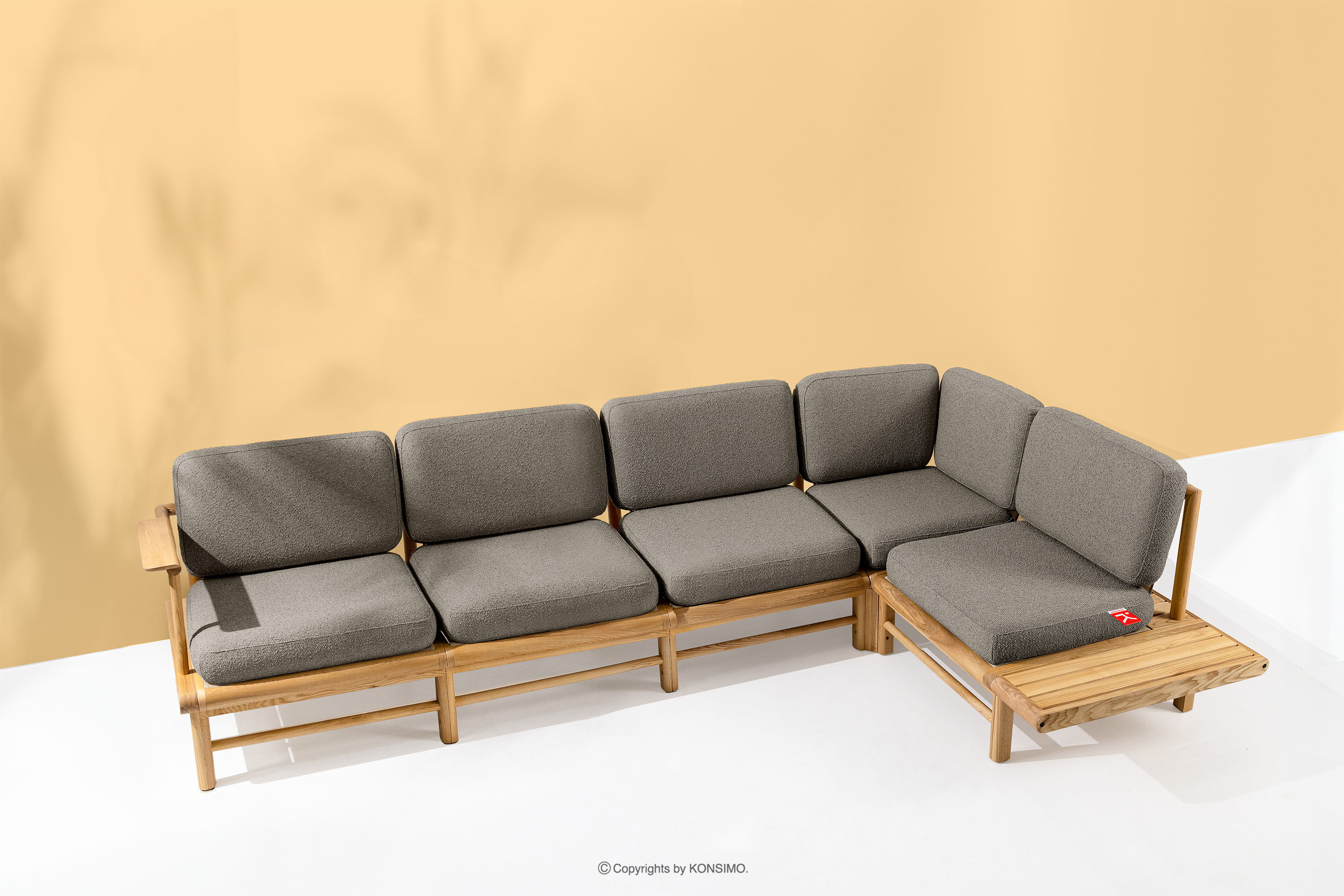 Das Ecksofa aus Holz mit Kissen grau rechts ist ein einzigartiges Produkt, das Ihren Raum verschönern wird. Die Sitz- und Rückenkissen sind mit hochwertigem PU-Schaumstoff gefüllt und bieten einen unvergleichlichen Komfort. Der Stoffbezug aus 93 % recyceltem Polypropylen und 7 % Polyester ist nicht nur umweltfreundlich, sondern auch pflegeleicht - einfach mit einem feuchten Tuch abwischen.