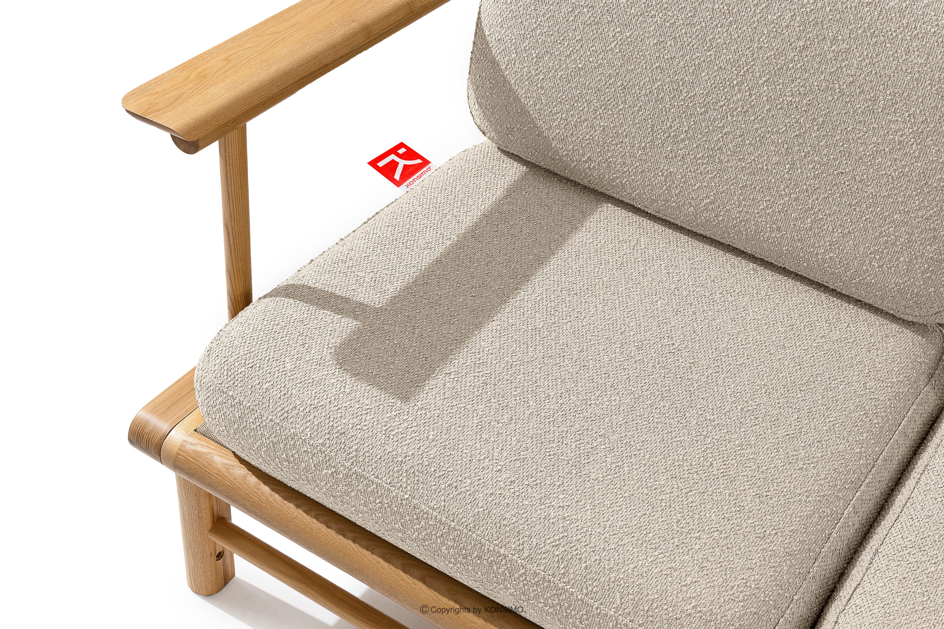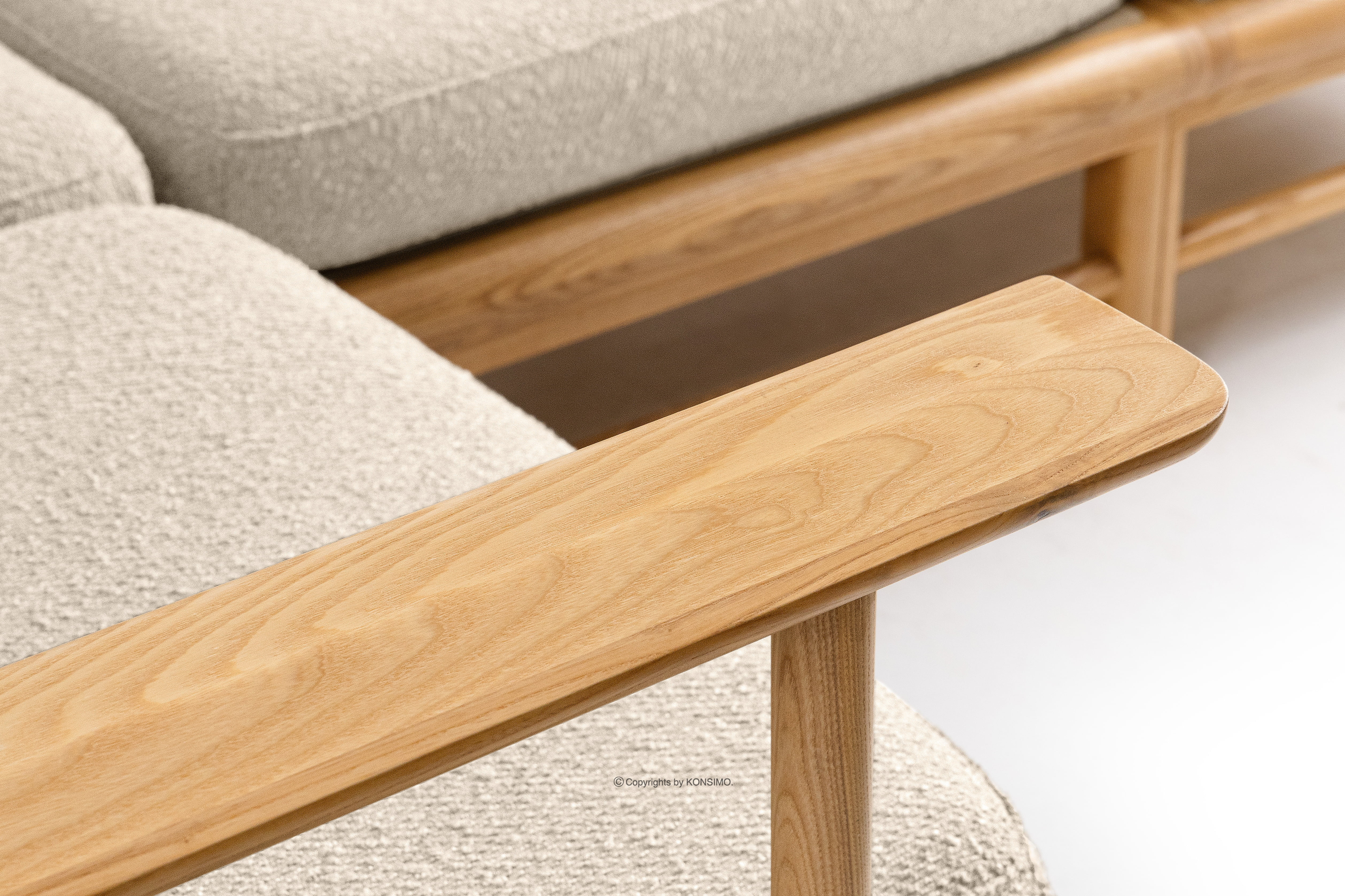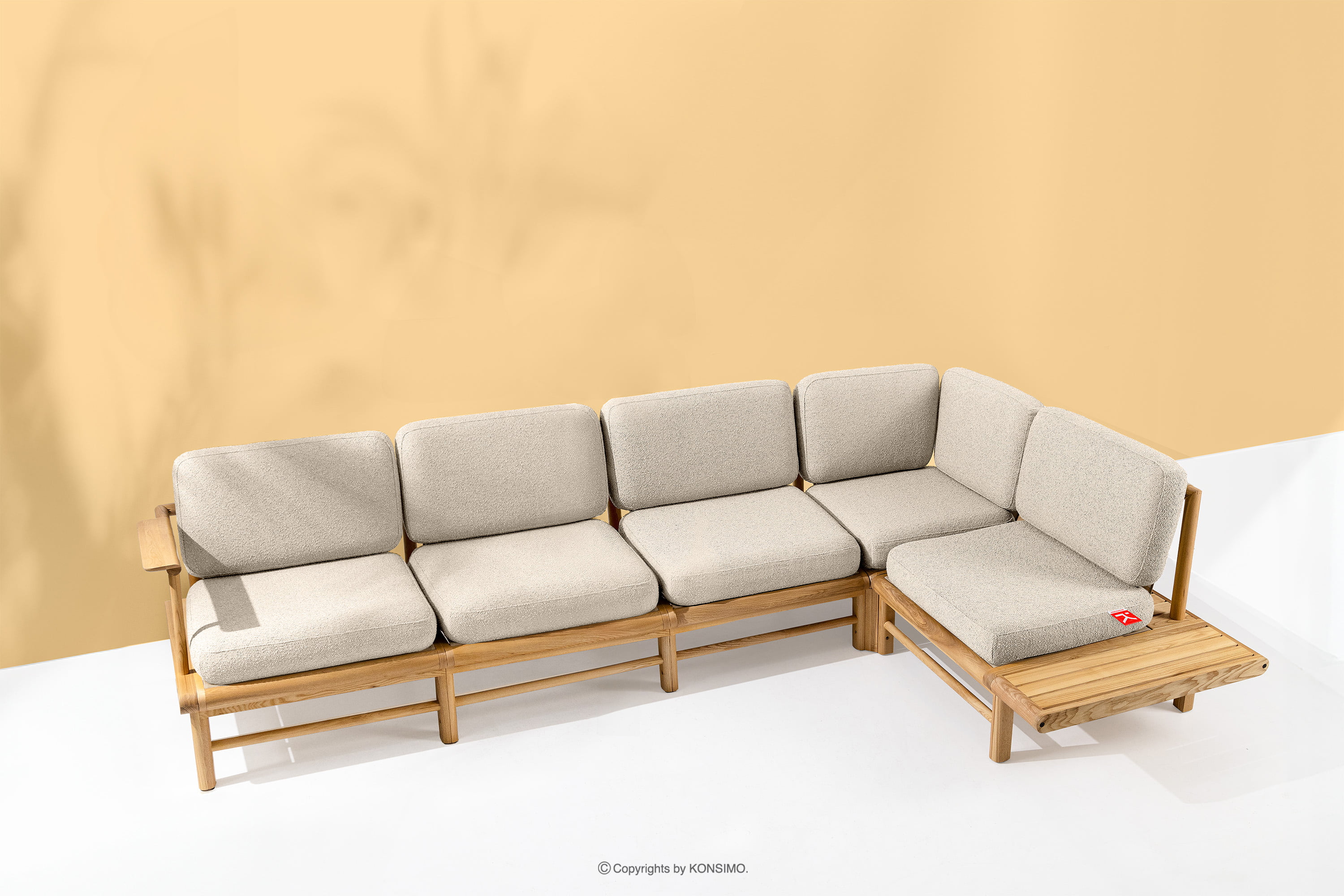 Das hölzerne Ecksofa mit Kissen creme rechts ist ein einzigartiges Produkt, das Ihren Raum verschönern wird. Die Sitz- und Rückenkissen sind mit hochwertigem PU-Schaumstoff für unvergleichlichen Komfort gefüllt. Der Stoffbezug, der zu 93% aus recyceltem Polypropylen und zu 7% aus Polyester besteht, ist nicht nur umweltfreundlich, sondern auch pflegeleicht - einfach mit einem feuchten Tuch abwischen.