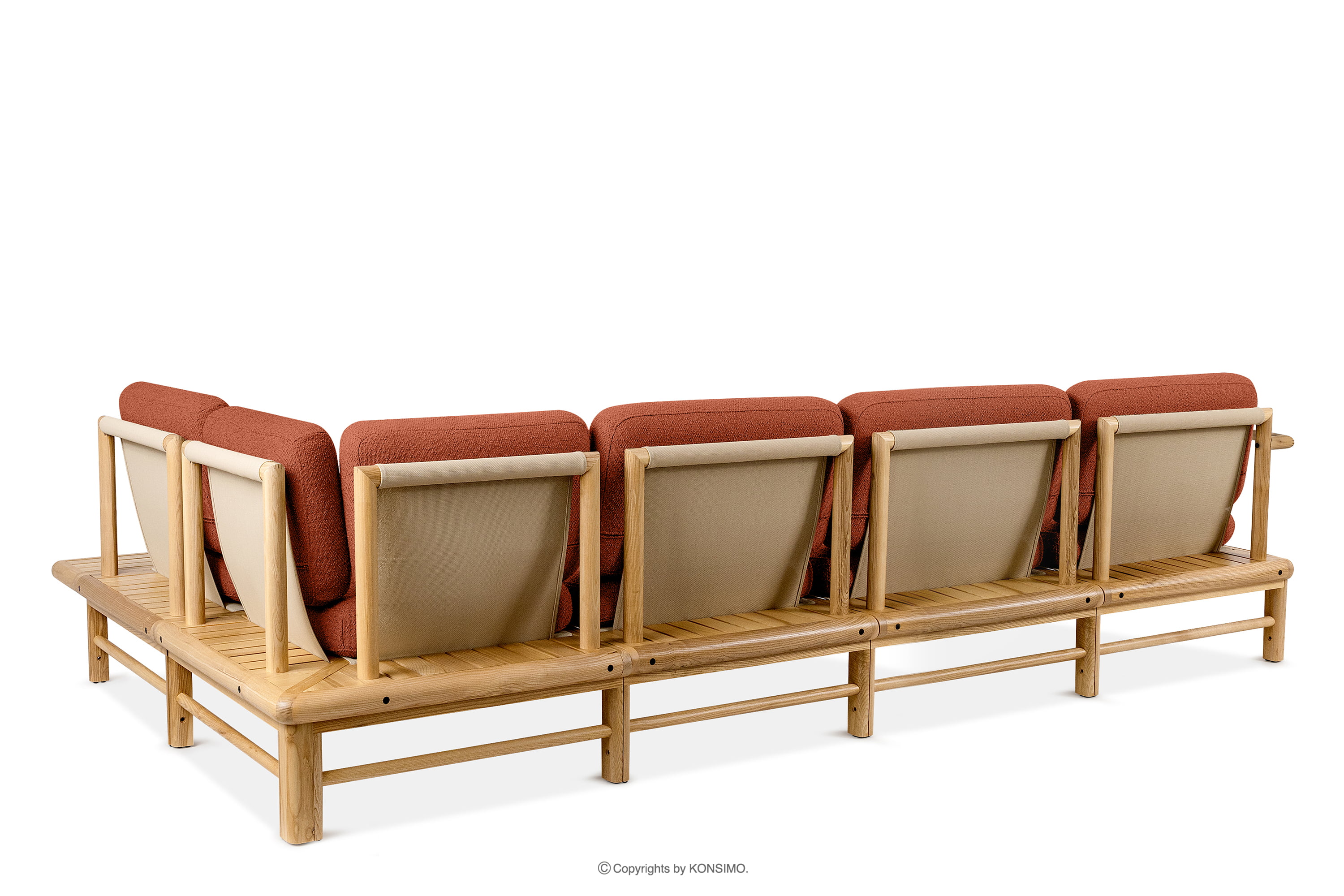 Das Ecksofa aus Holz mit Kissen orange rechts ist ein einzigartiges Produkt, das Ihren Raum verschönern wird. Die Sitz- und Rückenkissen sind mit hochwertigem PU-Schaumstoff für unvergleichlichen Komfort gefüllt. Der Stoffbezug aus 93% recyceltem Polypropylen und 7% Polyester ist nicht nur umweltfreundlich, sondern auch pflegeleicht - einfach mit einem feuchten Tuch abwischen.