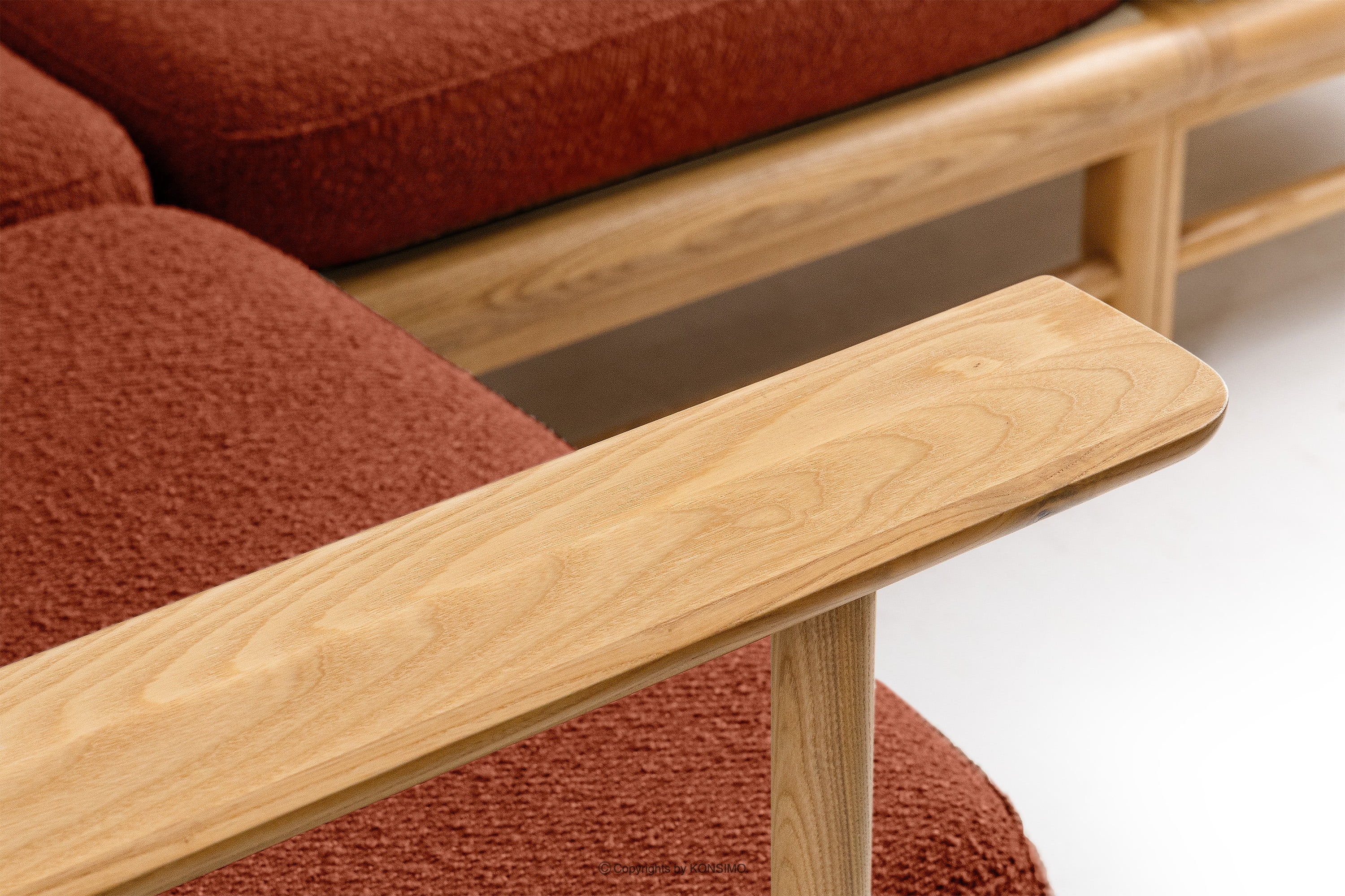 Das Ecksofa aus Holz mit Kissen orange rechts ist ein einzigartiges Produkt, das Ihren Raum verschönern wird. Die Sitz- und Rückenkissen sind mit hochwertigem PU-Schaumstoff für unvergleichlichen Komfort gefüllt. Der Stoffbezug aus 93% recyceltem Polypropylen und 7% Polyester ist nicht nur umweltfreundlich, sondern auch pflegeleicht - einfach mit einem feuchten Tuch abwischen.
