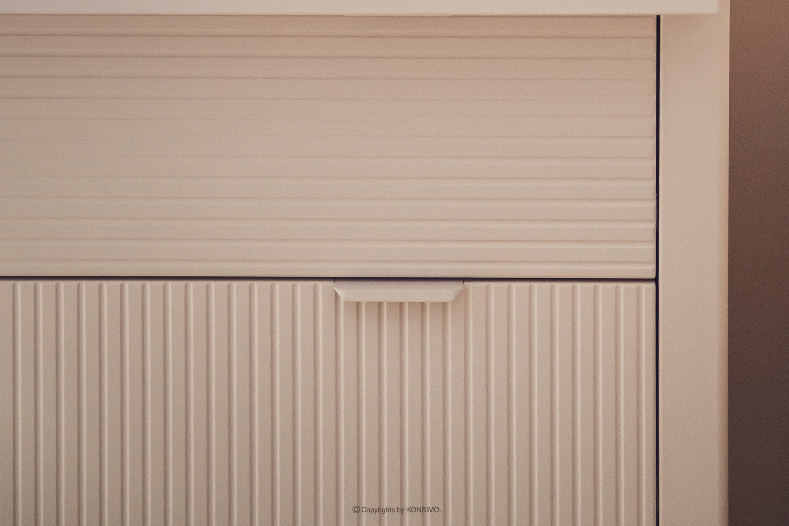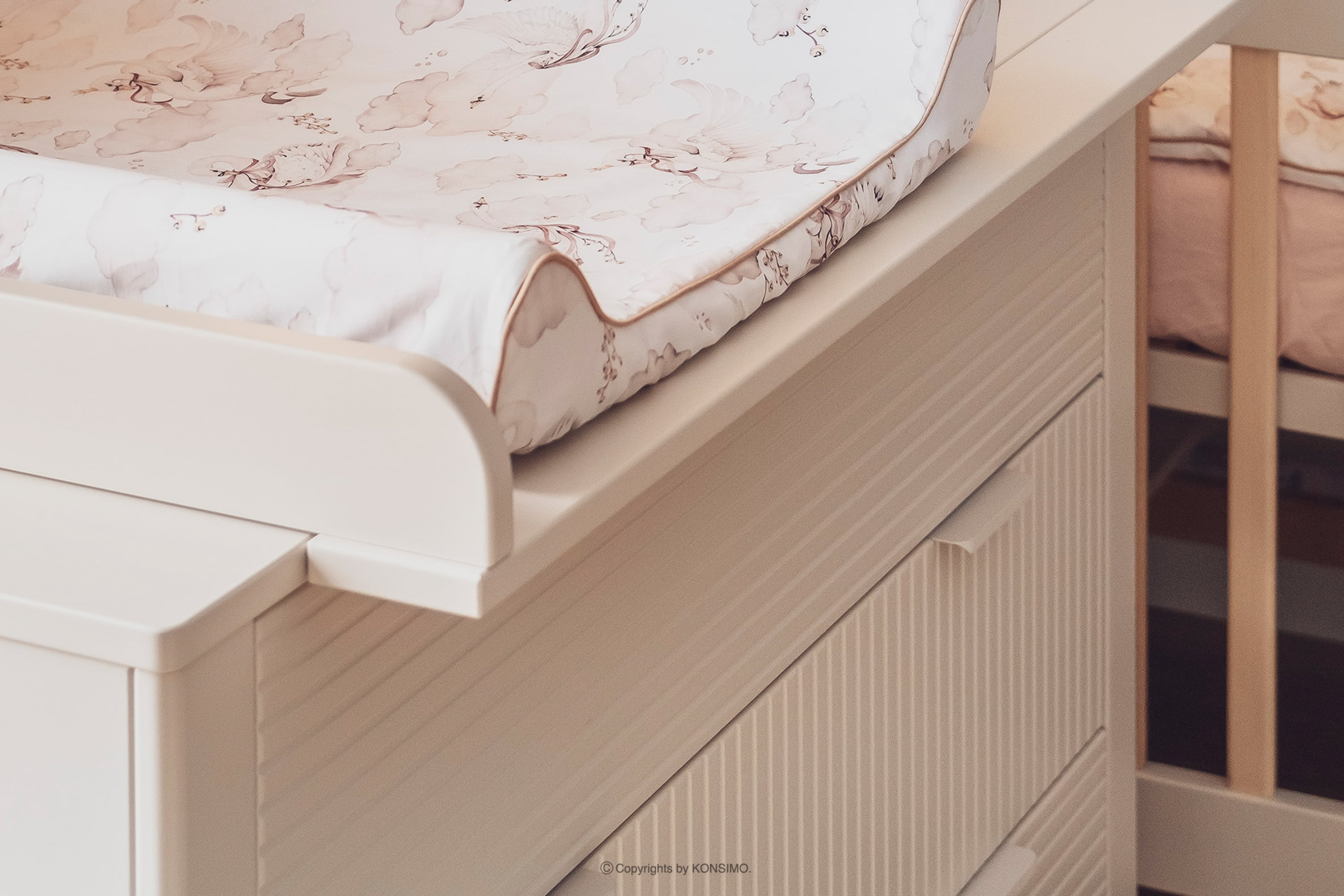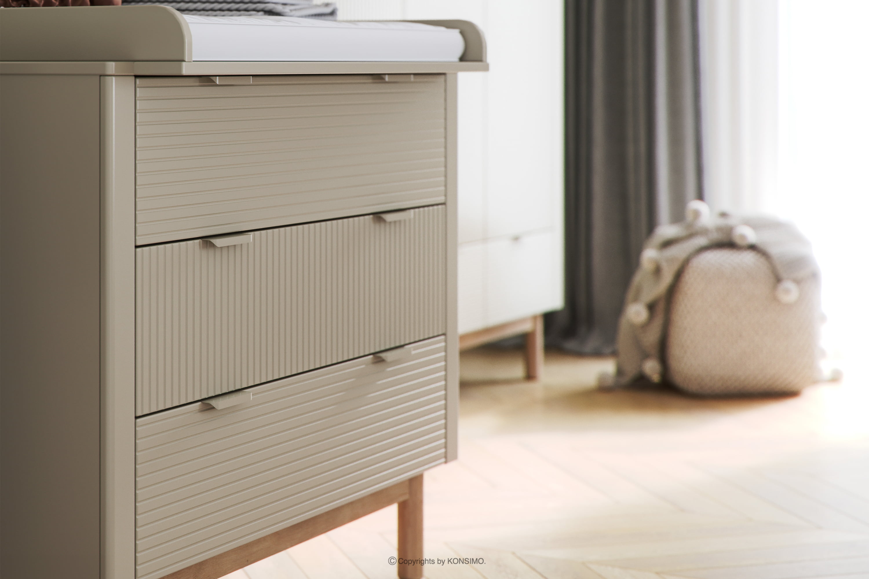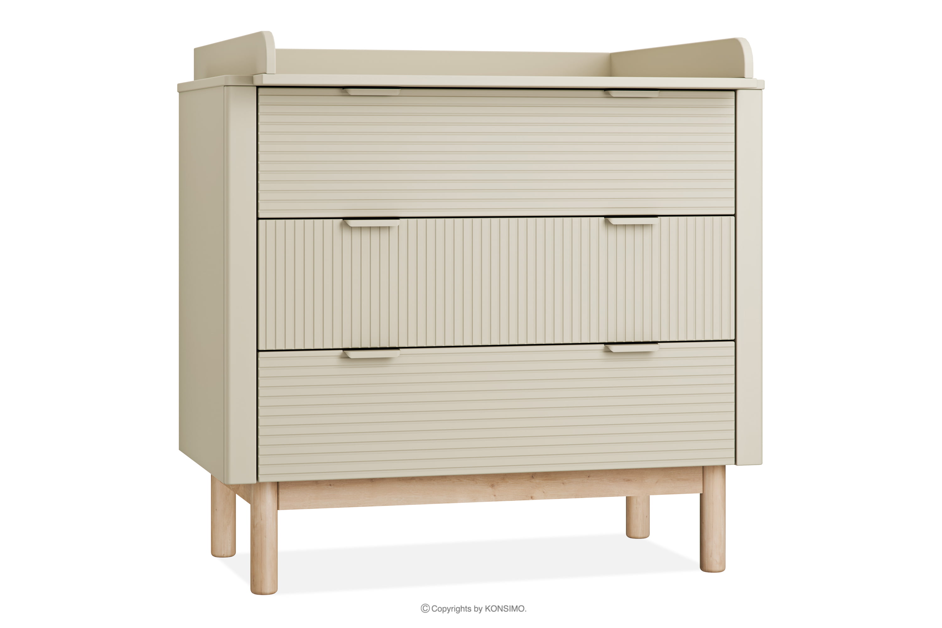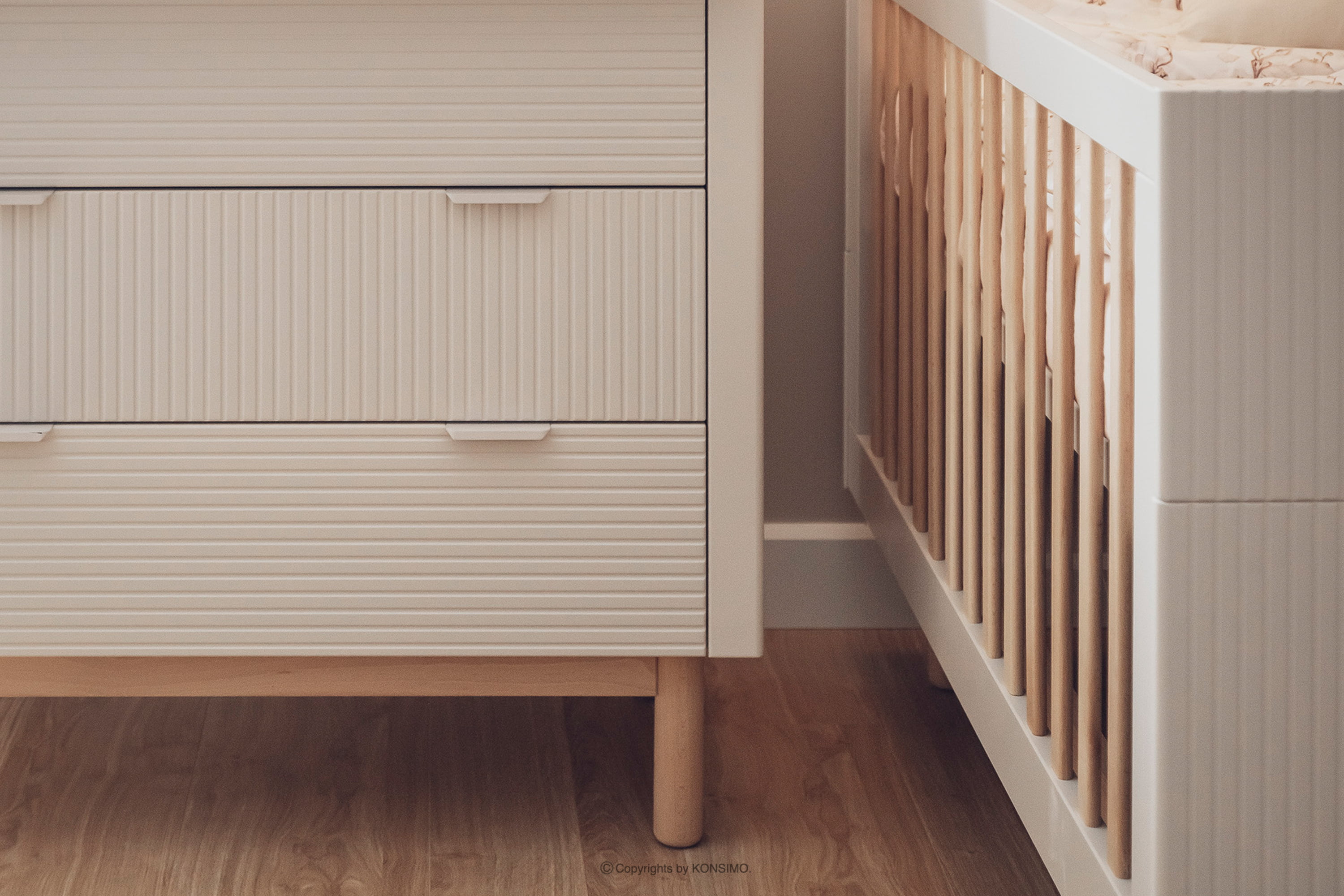 Die beigefarbene Kommode ist nicht nur eine praktische Lösung für die Aufbewahrung von Kleidung und Accessoires Ihres Kindes, sondern auch ein Designelement, das der Einrichtung eine einzigartige Note verleiht. Ihr einzigartiges Design zeichnet sich durch ein Dekor in Form einer zarten Rille aus, die dem Möbelstück Eleganz und Raffinesse verleiht. Die Oberfläche der Kommode ist mit zertifizierten Lacken beschichtet, was die Sicherheit und Qualität der für die Herstellung des Möbels verwendeten Materialien bestätigt.