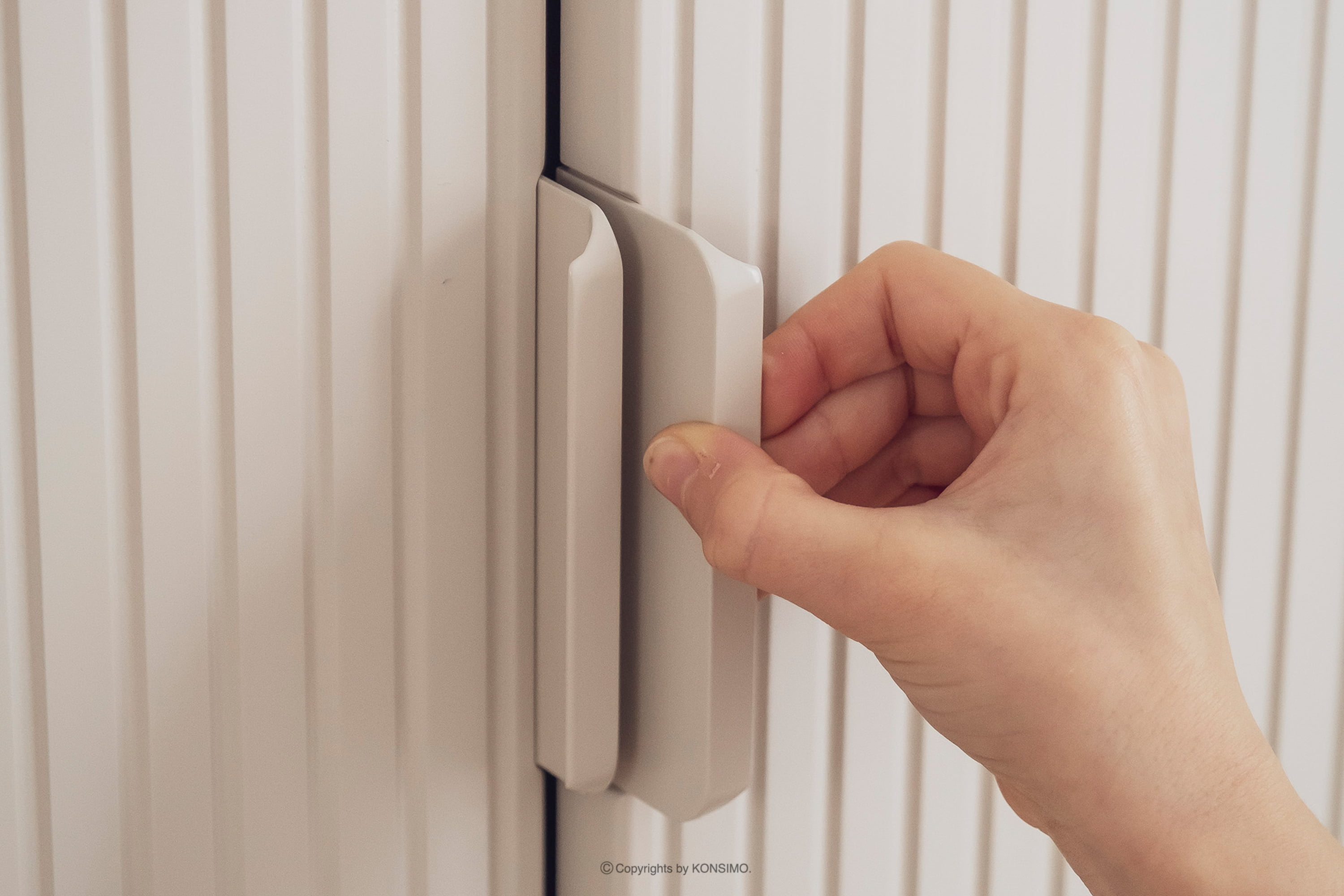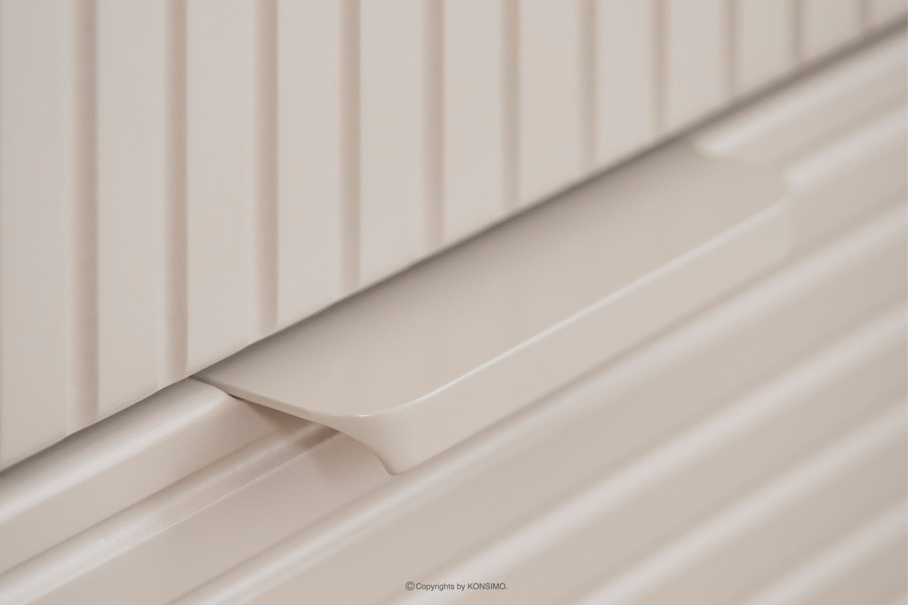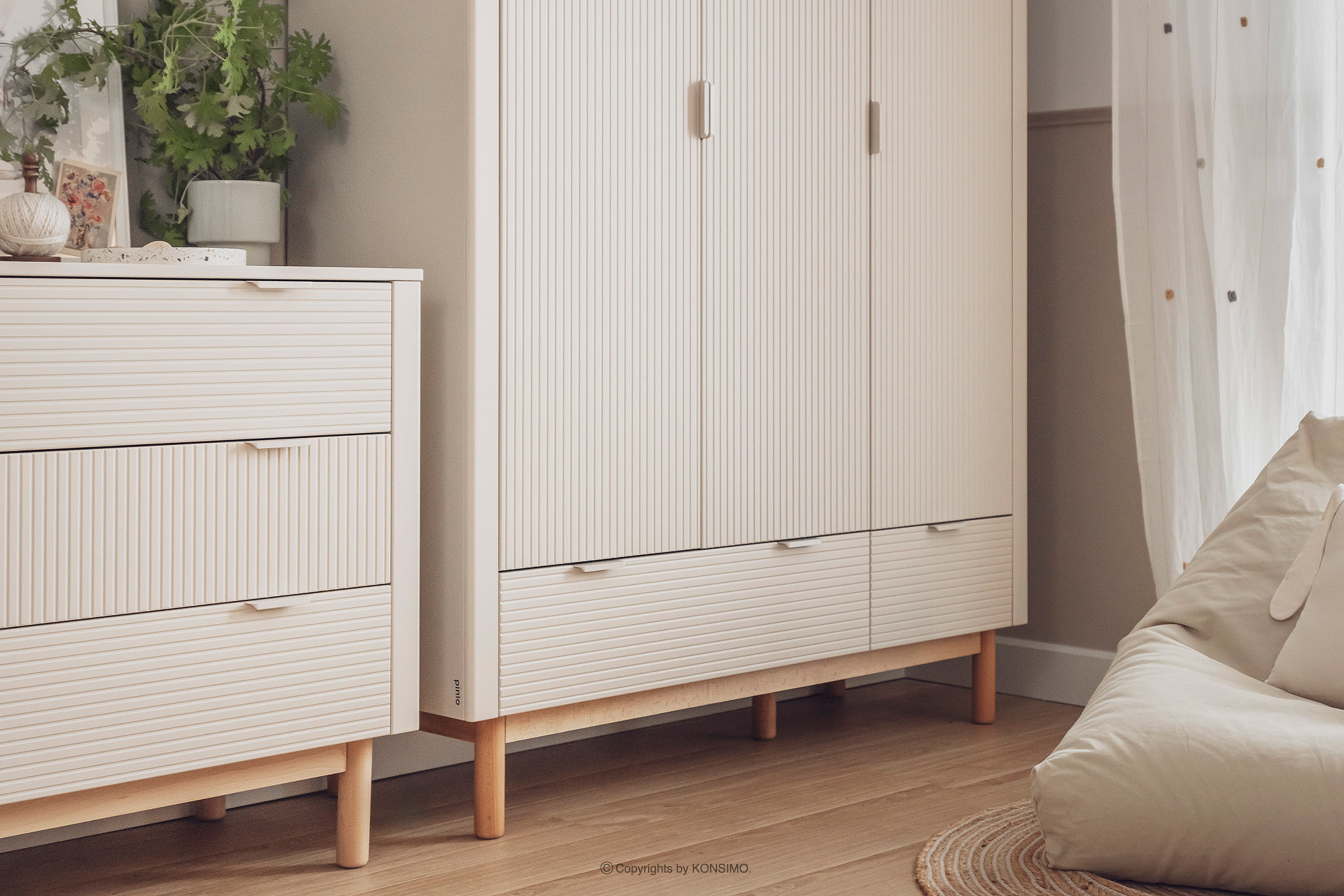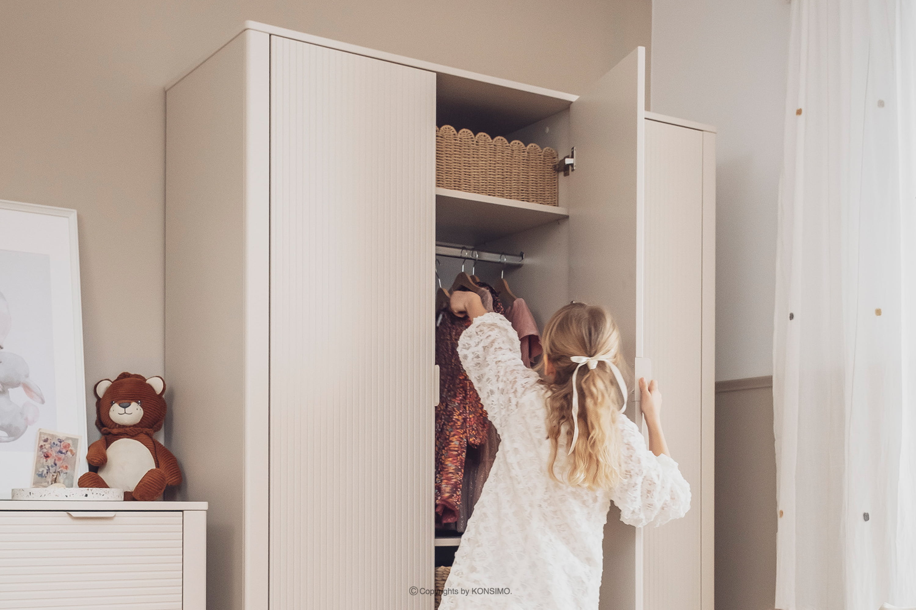 Der beigefarbene Kleiderschrank ist eine unentbehrliche Lösung für die Aufbewahrung der Kleidung und Accessoires Ihres Kindes und verbindet Funktionalität, Design und hochwertige Verarbeitung. Seine Flügeltüren sind mit einem Soft-Close-Mechanismus ausgestattet, der ein sanftes und geräuschloses Öffnen und Schließen des Schranks ermöglicht, was besonders wichtig ist, wenn das Kind schläft. Die Kanten der sanft abgerundeten Ecksofas sorgen für zusätzliche Sicherheit bei der Benutzung, so dass die Gefahr von versehentlichen Verletzungen ausgeschlossen ist.