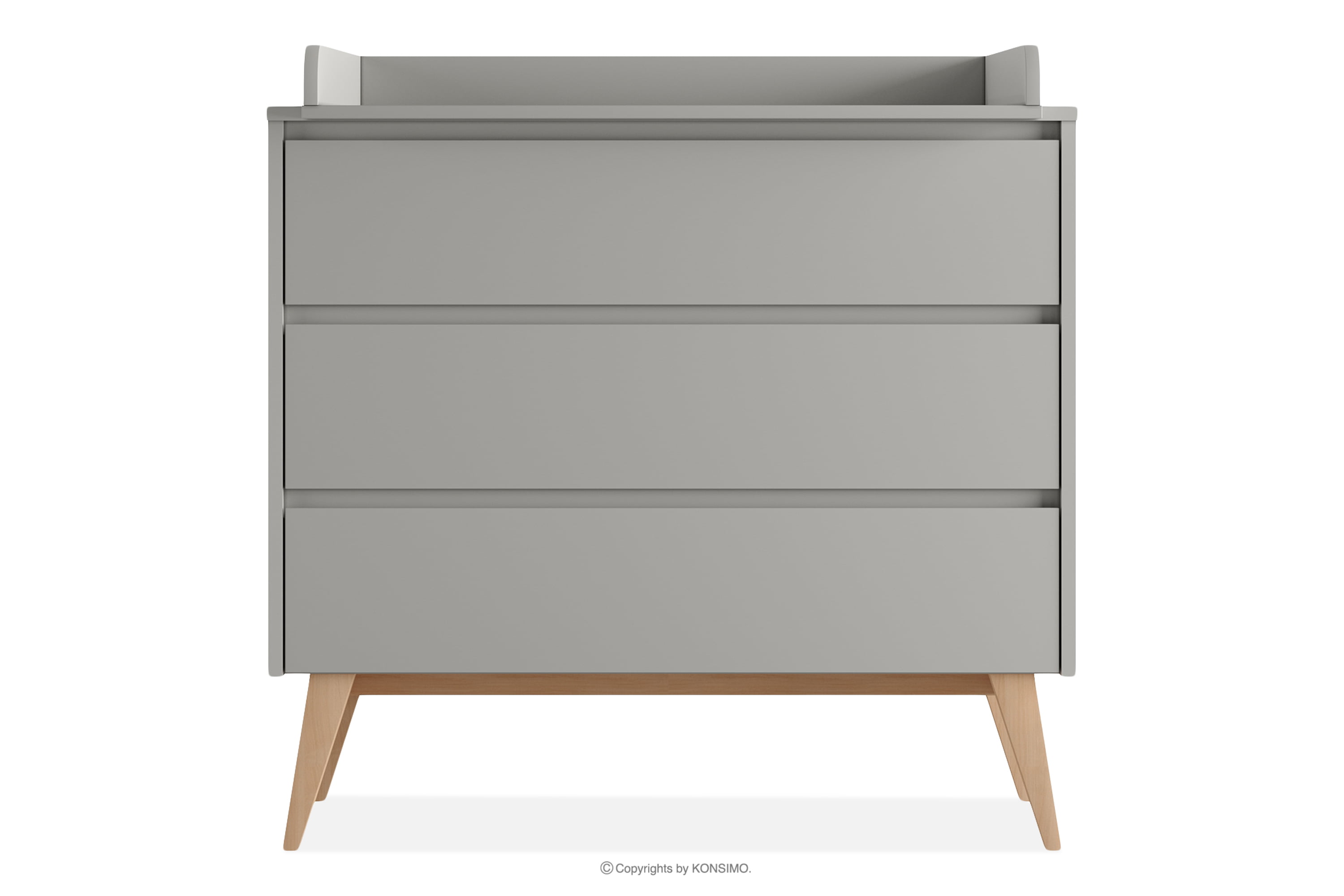 Die Kinderkommode besticht durch ihr elegantes Design, bietet aber auch praktische Lösungen für die Inneneinrichtung. Der Korpus der Kommode ist aus hochwertigem MDF und laminierter Platte gefertigt, was für Langlebigkeit und Widerstandsfähigkeit sorgt. Der Sockel aus massivem Buchenholz verleiht der Kommode Solidität und Stabilität und macht sie nicht nur zu einem ästhetisch ansprechenden Designelement, sondern auch zu einem funktionalen Aufbewahrungsmöbel.