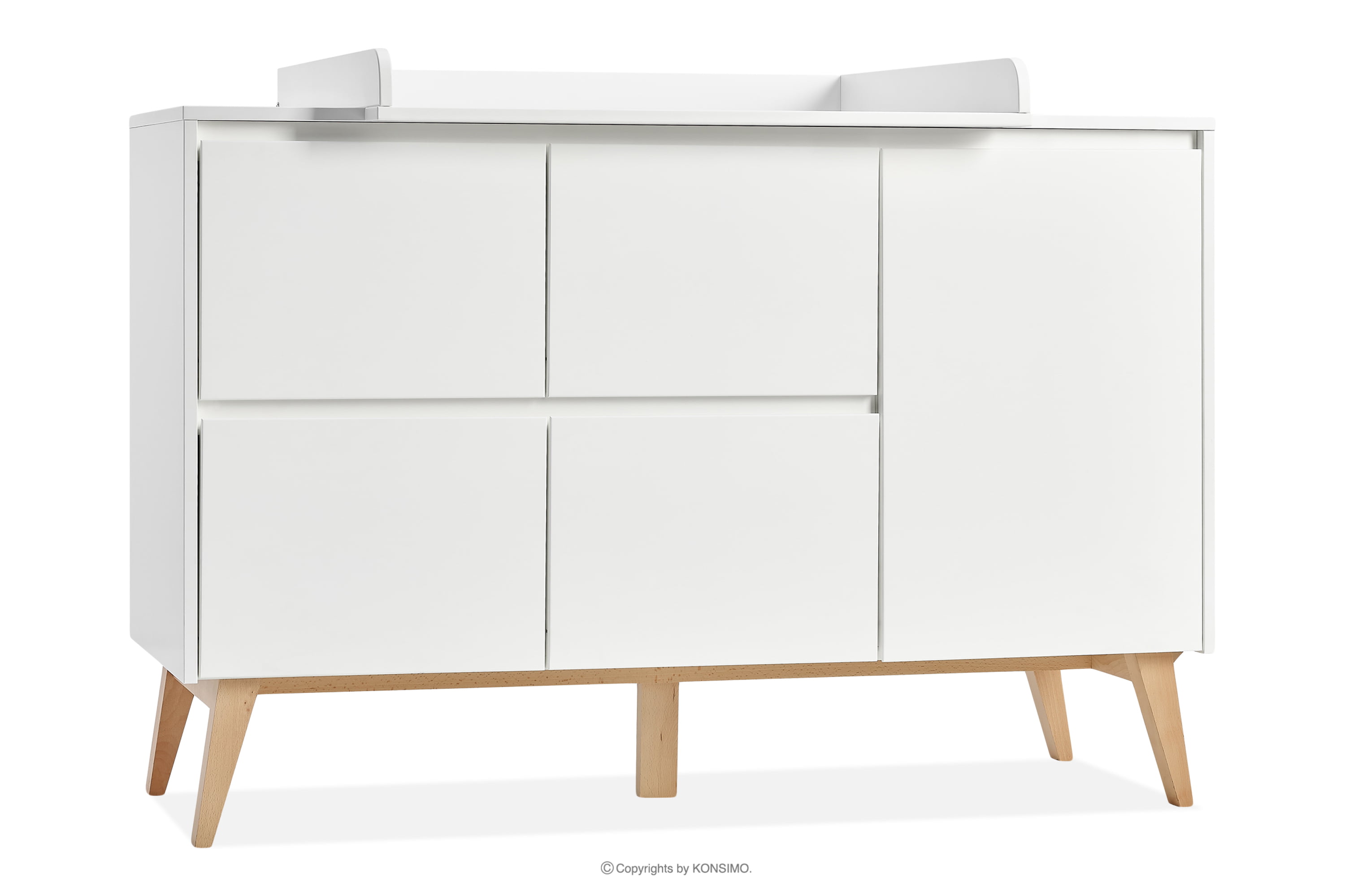 Die Kommode steht auf hohen Beinen aus massivem Buchenholz, die ihr ein leichtes und feines Aussehen verleihen. Die aus hochwertigem Material gefertigten Beine sorgen für die Stabilität und Festigkeit der gesamten Konstruktion. Die Oberfläche der Kommode ist mit zertifizierten Lacken beschichtet, die eine sichere Benutzung auch für die jüngsten Mitglieder des Haushalts garantieren.
