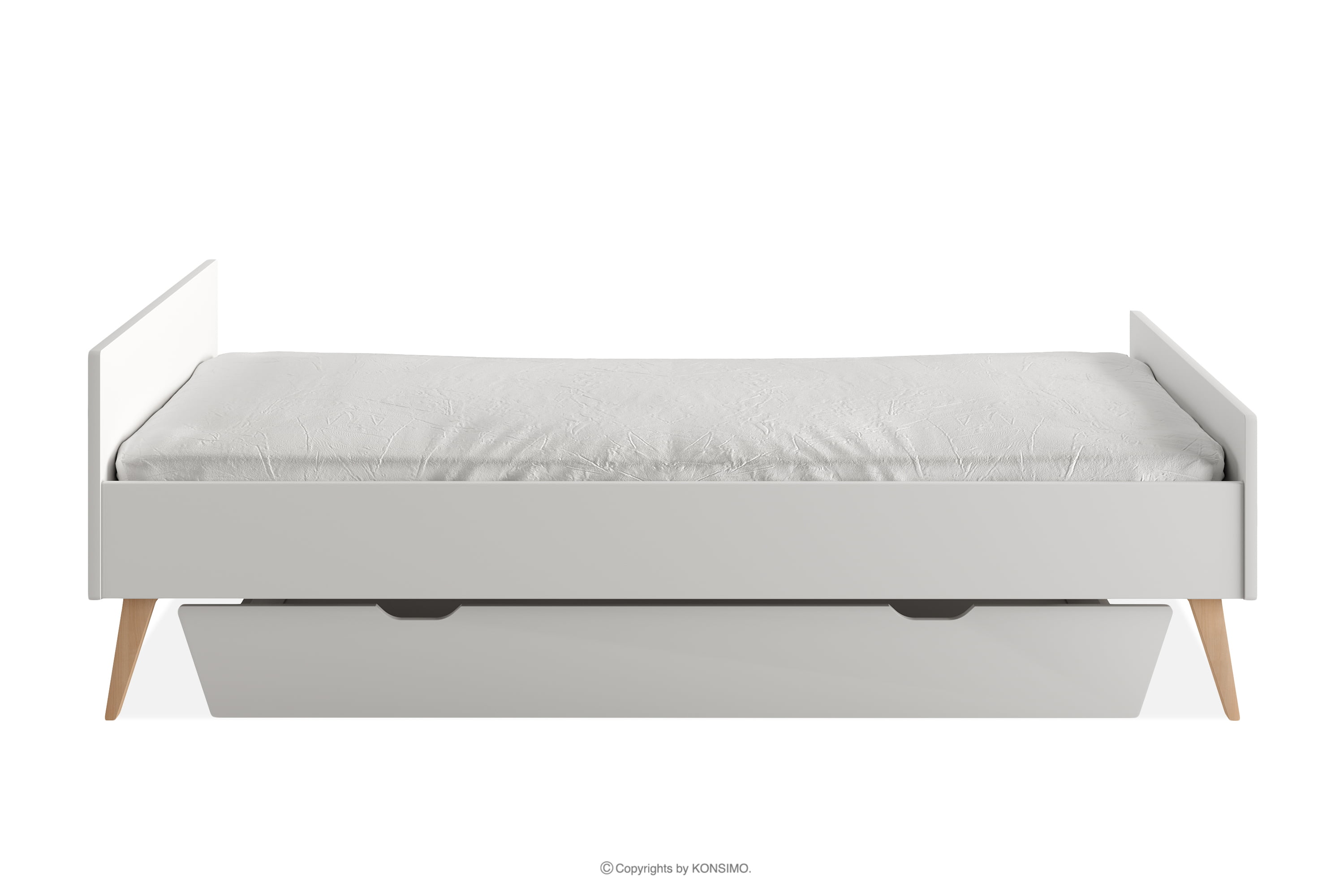 Vor allem aber ist das Kinderbett ein komfortabler Ort zum Ausruhen und Schlafen im Zimmer Ihres Kindes. Der Korpus des Bettes ist aus strapazierfähigem MDF und laminierter Platte gefertigt, was die Robustheit und Langlebigkeit des Möbels gewährleistet. Der Bettrahmen ist aus Kiefernholz und die Füße sind aus massivem Buchenholz gefertigt, was die Stabilität und Festigkeit der gesamten Konstruktion garantiert.