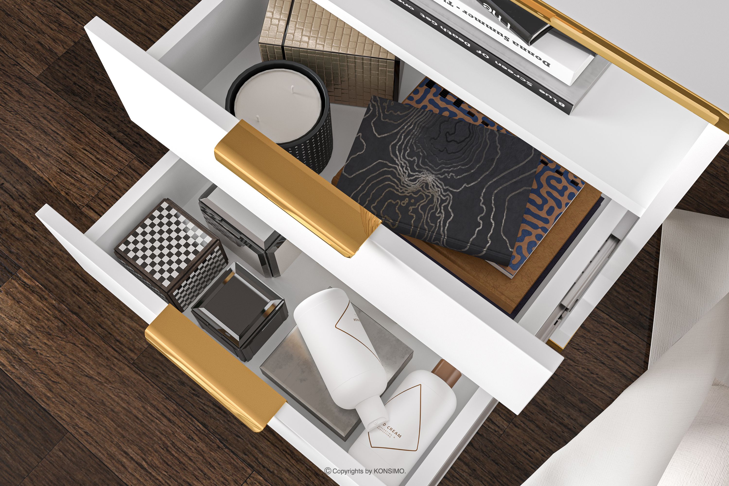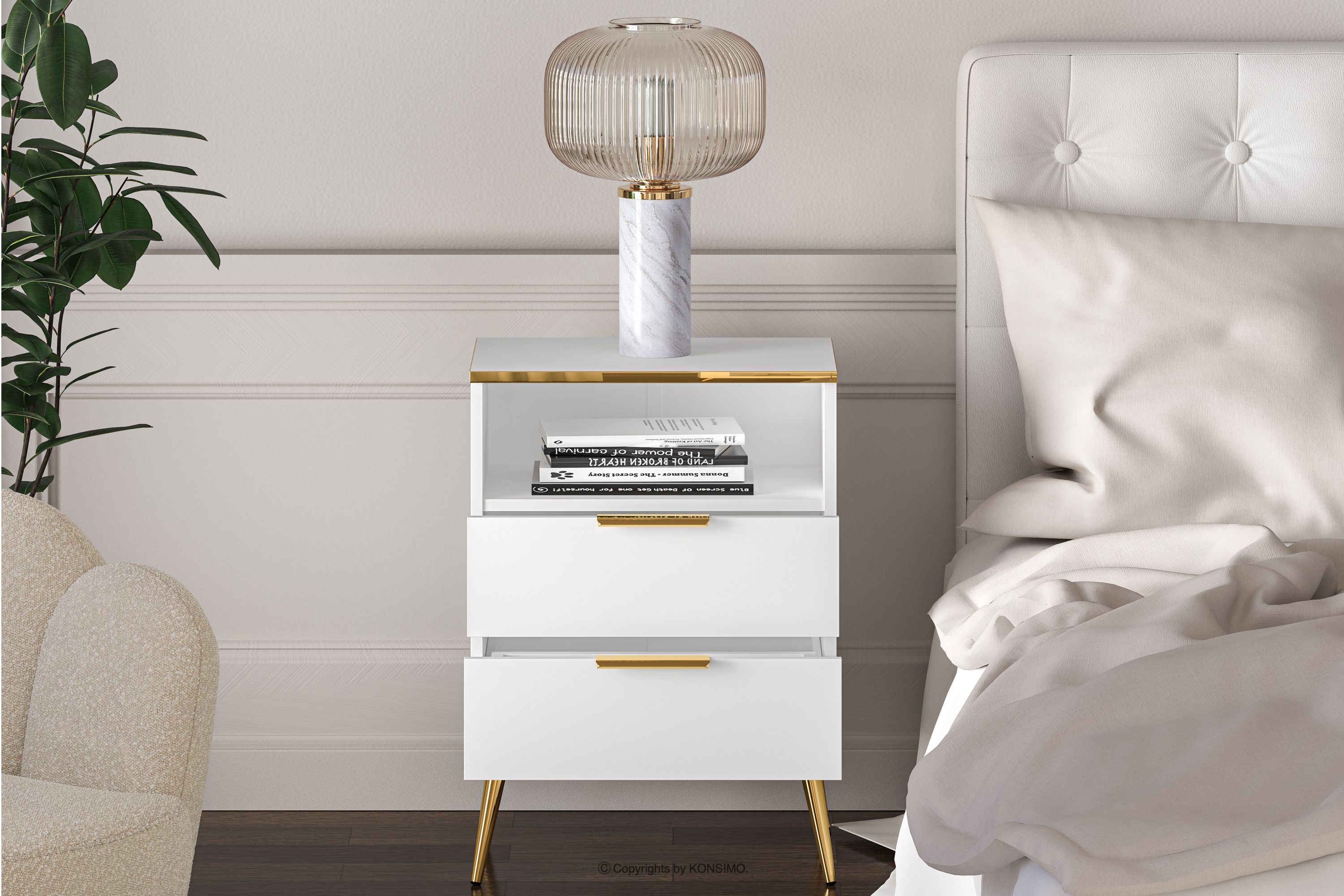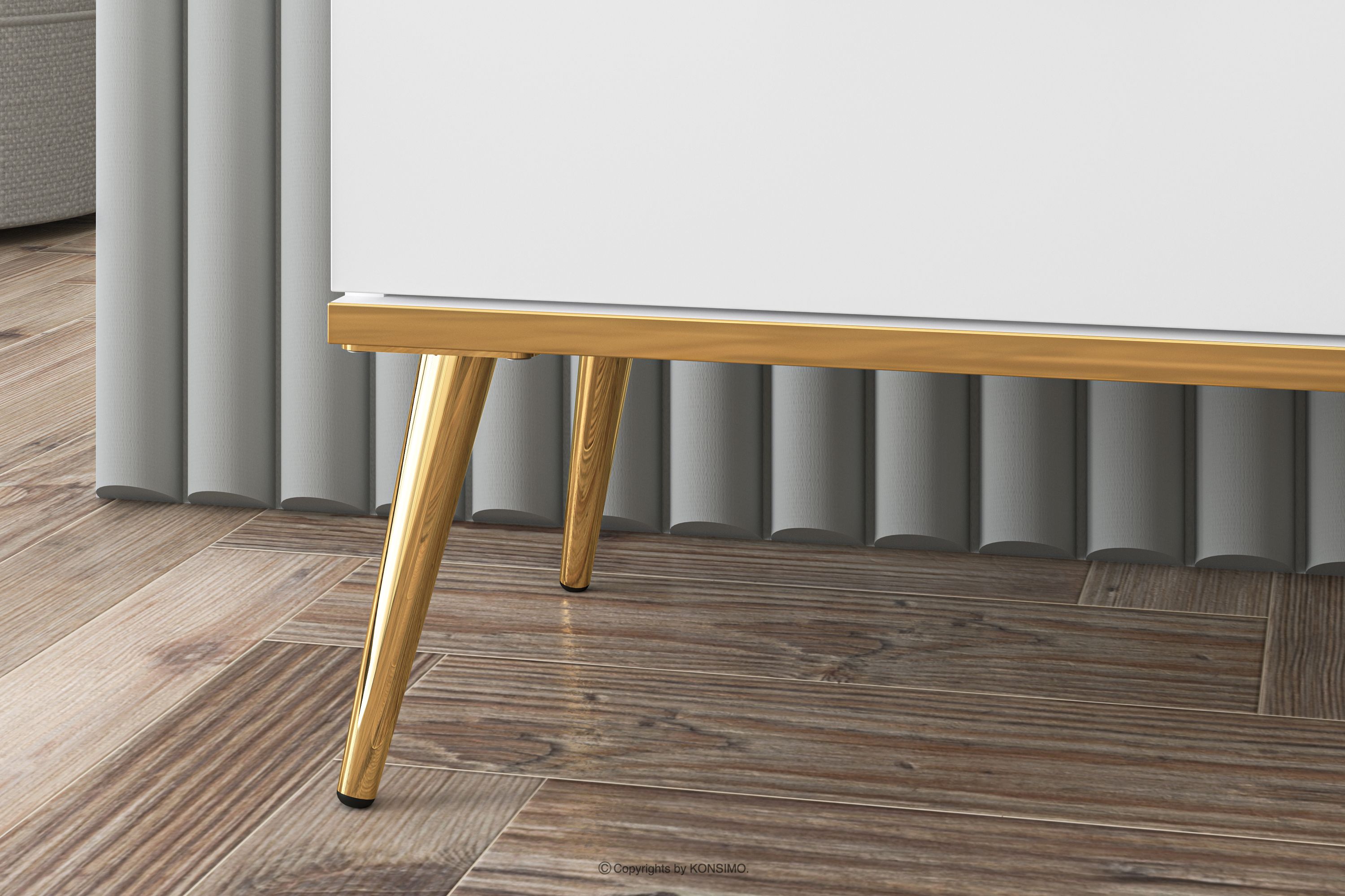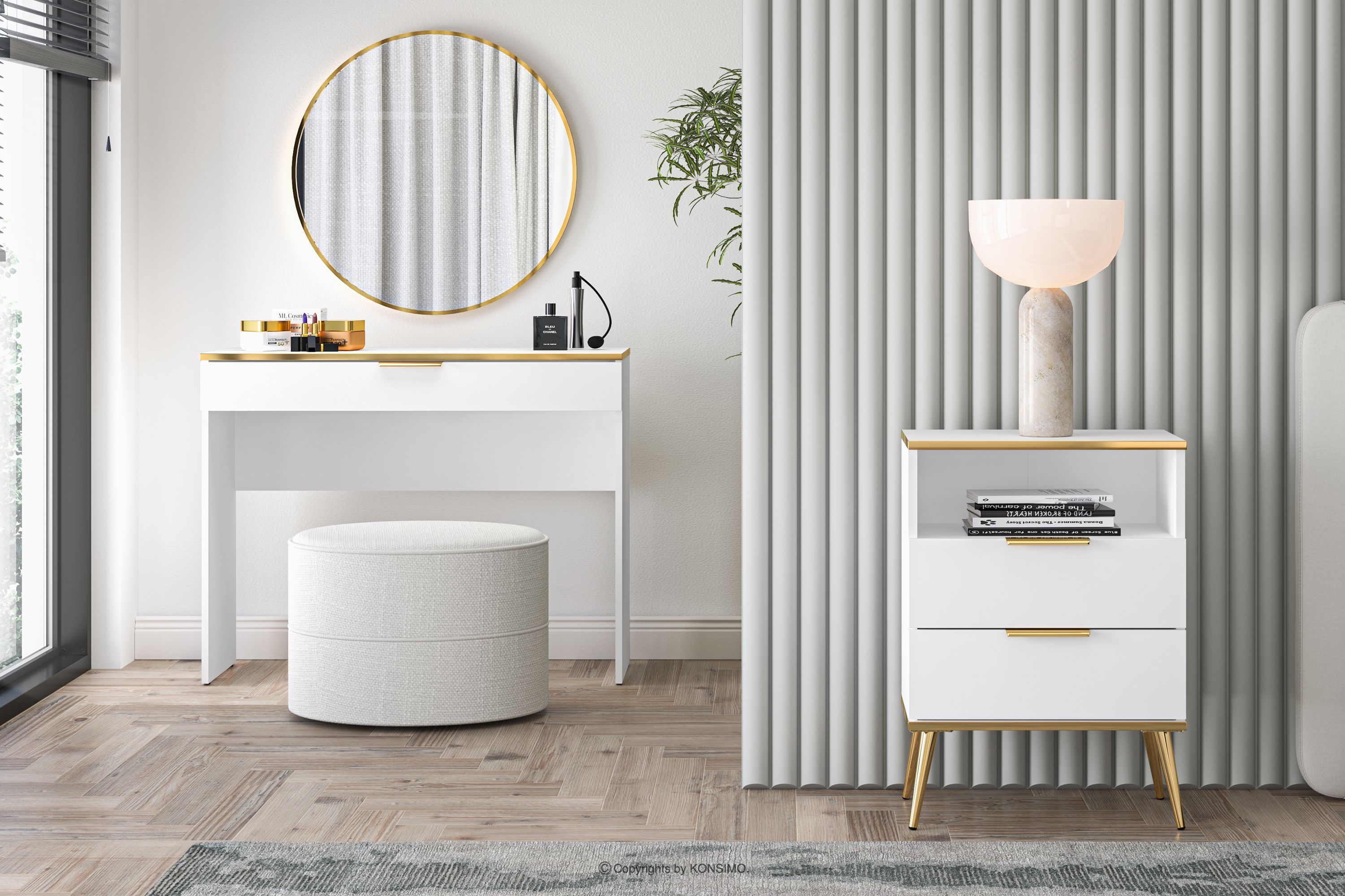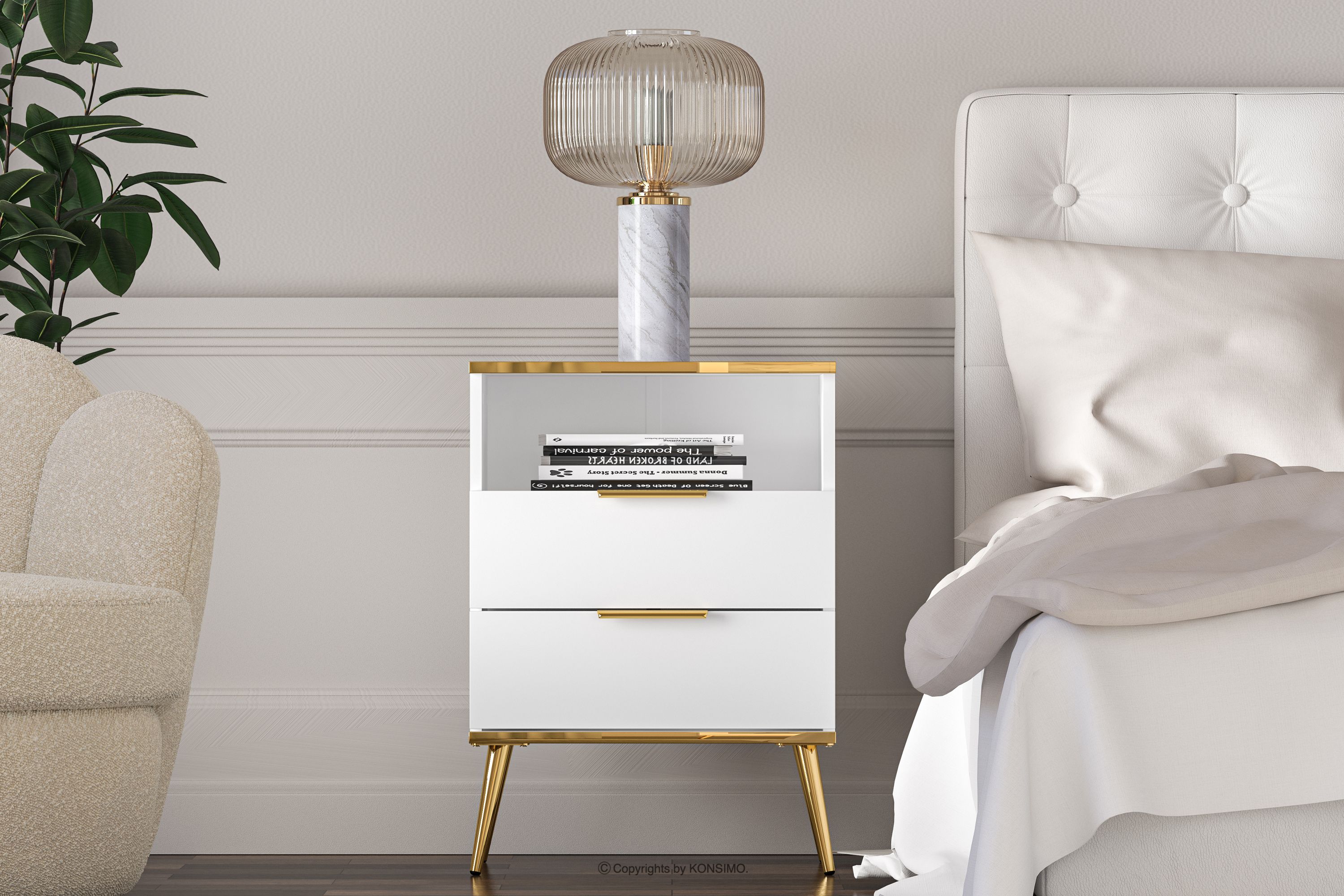 Glamouröser Nachttisch glänzend auf goldenen Beinen weiß