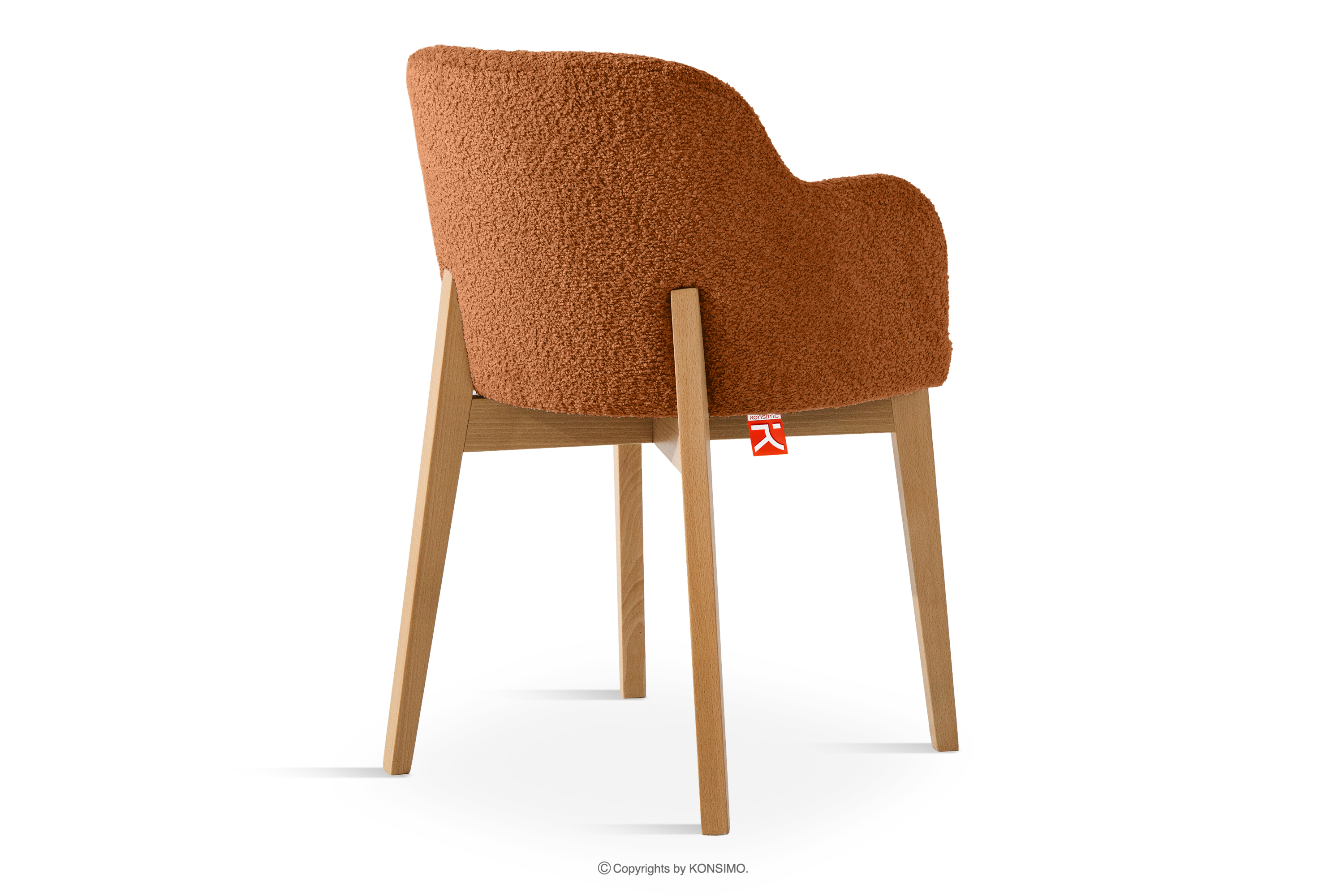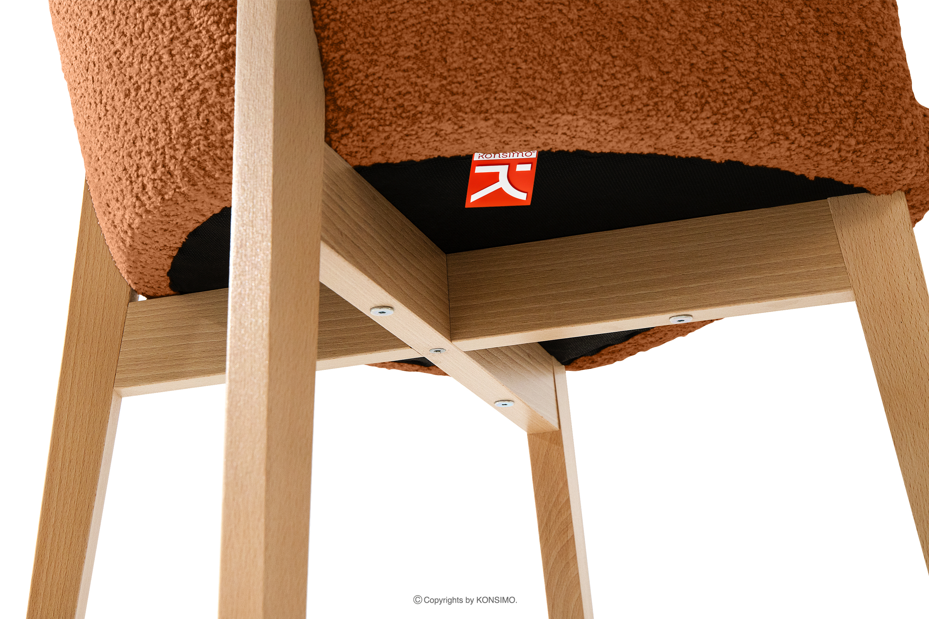 Gepolsterter Stuhl auf Holzbeinen Bouclé-Stoff rot ist der Inbegriff von modernem Design in Kombination mit höchstem Komfort. Die solide Konstruktion basiert auf Beinen aus ausgewähltem Buchenholz, das sich nicht nur durch seine außergewöhnliche Langlebigkeit, sondern auch durch sein schönes, natürliches Aussehen auszeichnet. Die Bouclé-Stoffpolsterung ist ein echter Hingucker. Dieses einzigartige Material, das sich durch eine Schlingenstruktur auszeichnet, sorgt nicht nur für eine angenehme Haptik, sondern weist auch eine erhöhte Abrieb- und Schmutzbeständigkeit auf.
