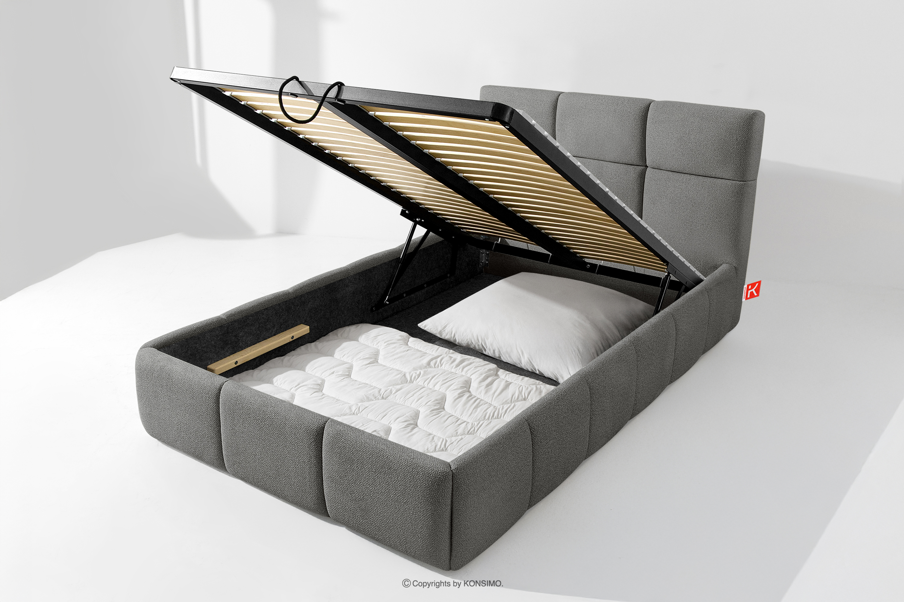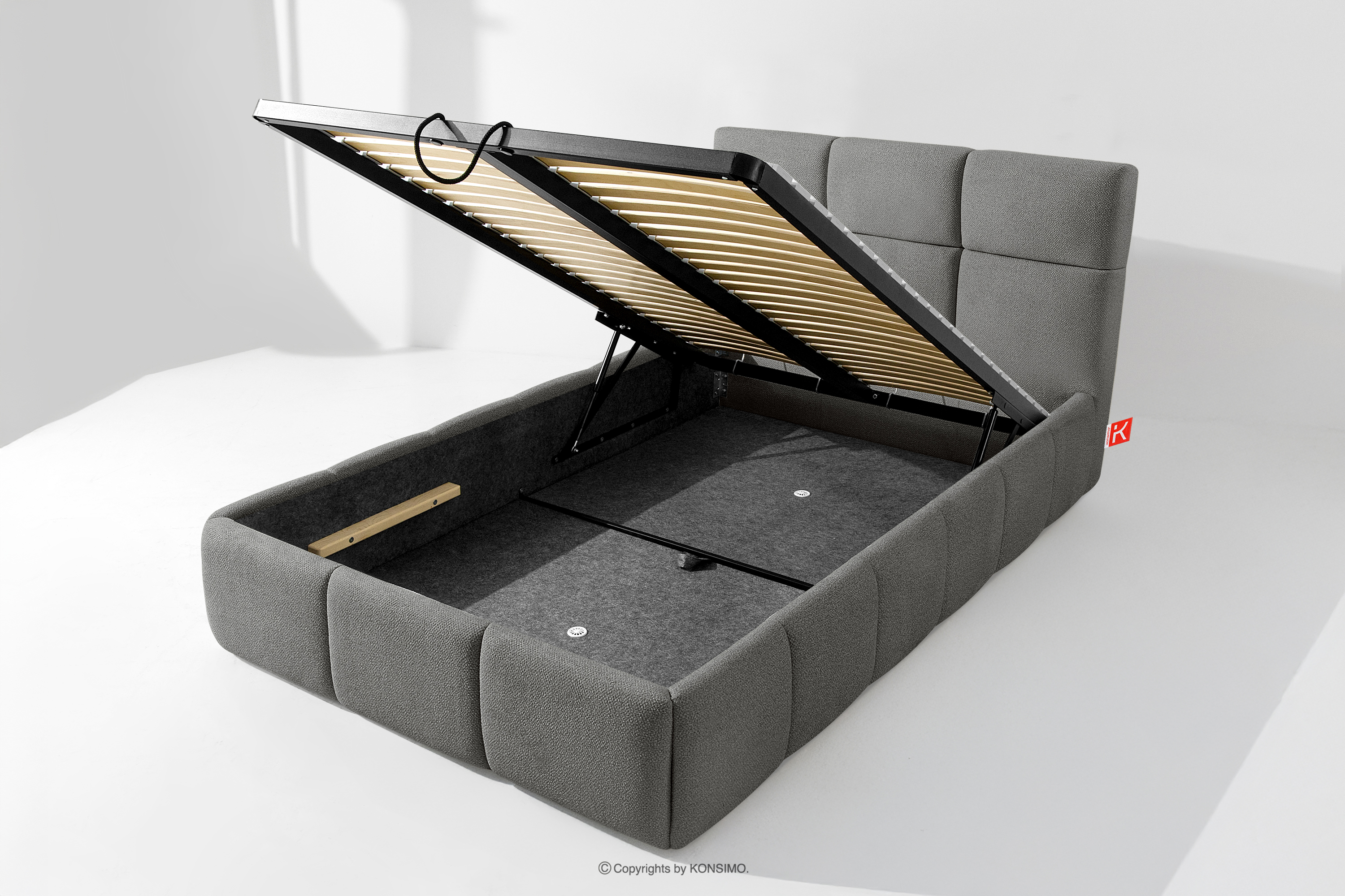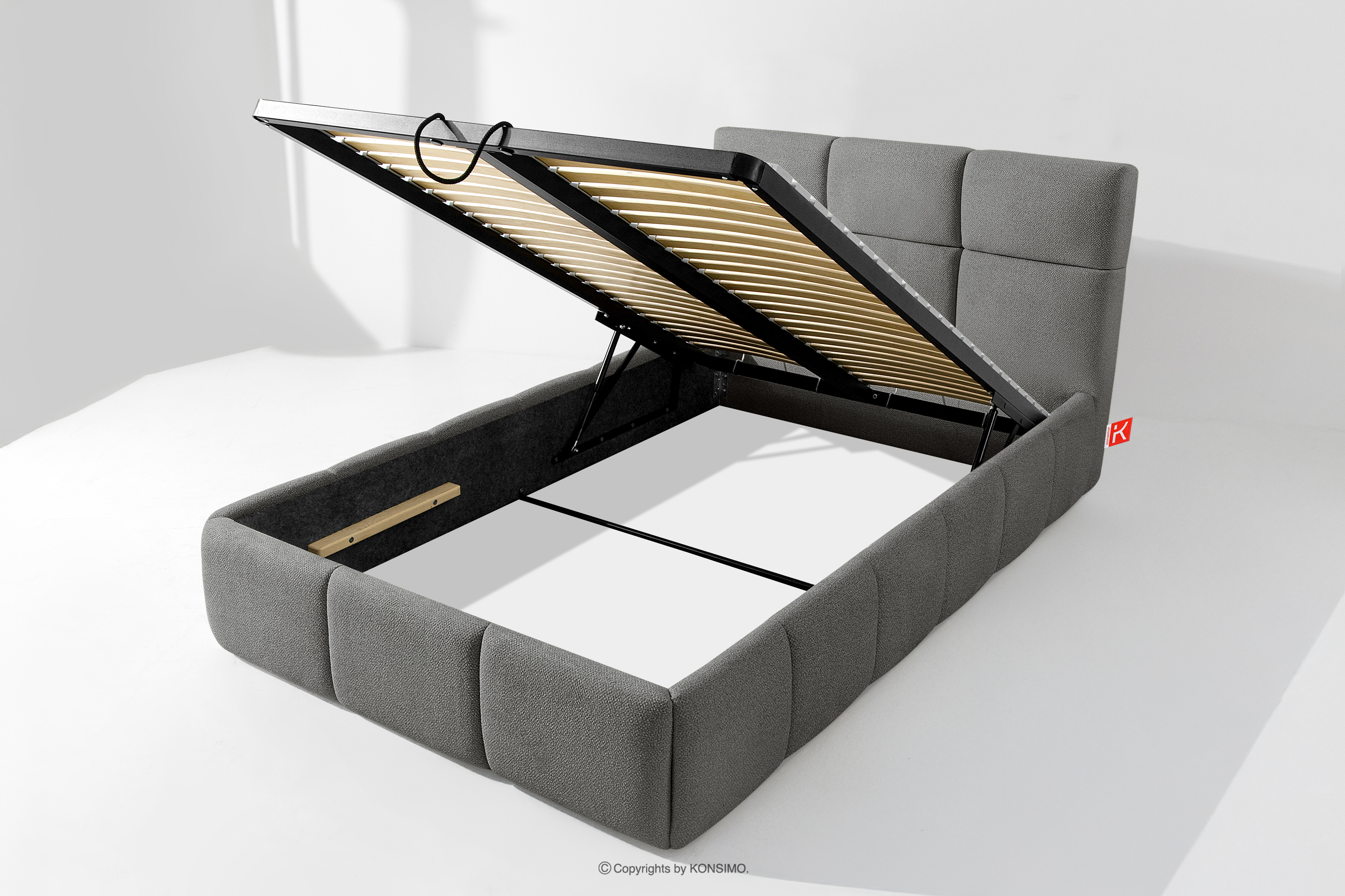 Darüber hinaus hat der Benutzer die Möglichkeit, den Härtegrad des Bettes individuell einzustellen - dank der herausnehmbaren Latten kann eine weichere oder festere Unterlage gewählt werden. Ein weiterer Komfort ist der bequeme Bettzeugbehälter, der sich dank moderner Gasflaschen mühelos und vollautomatisch öffnet. Diese praktische Lösung ermöglicht einen schnellen Zugriff auf das gelagerte Bettzeug, ohne die schwere Matratze manuell anheben zu müssen.