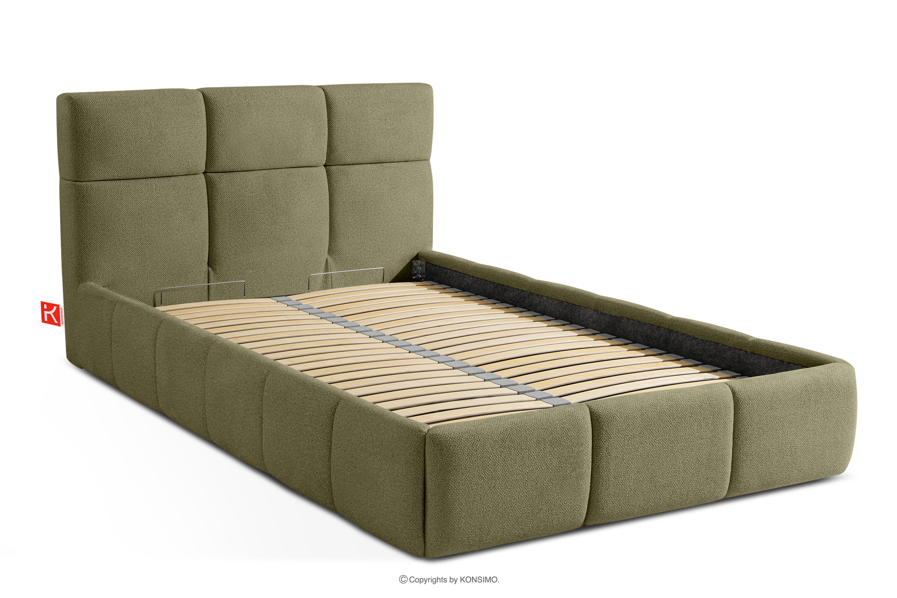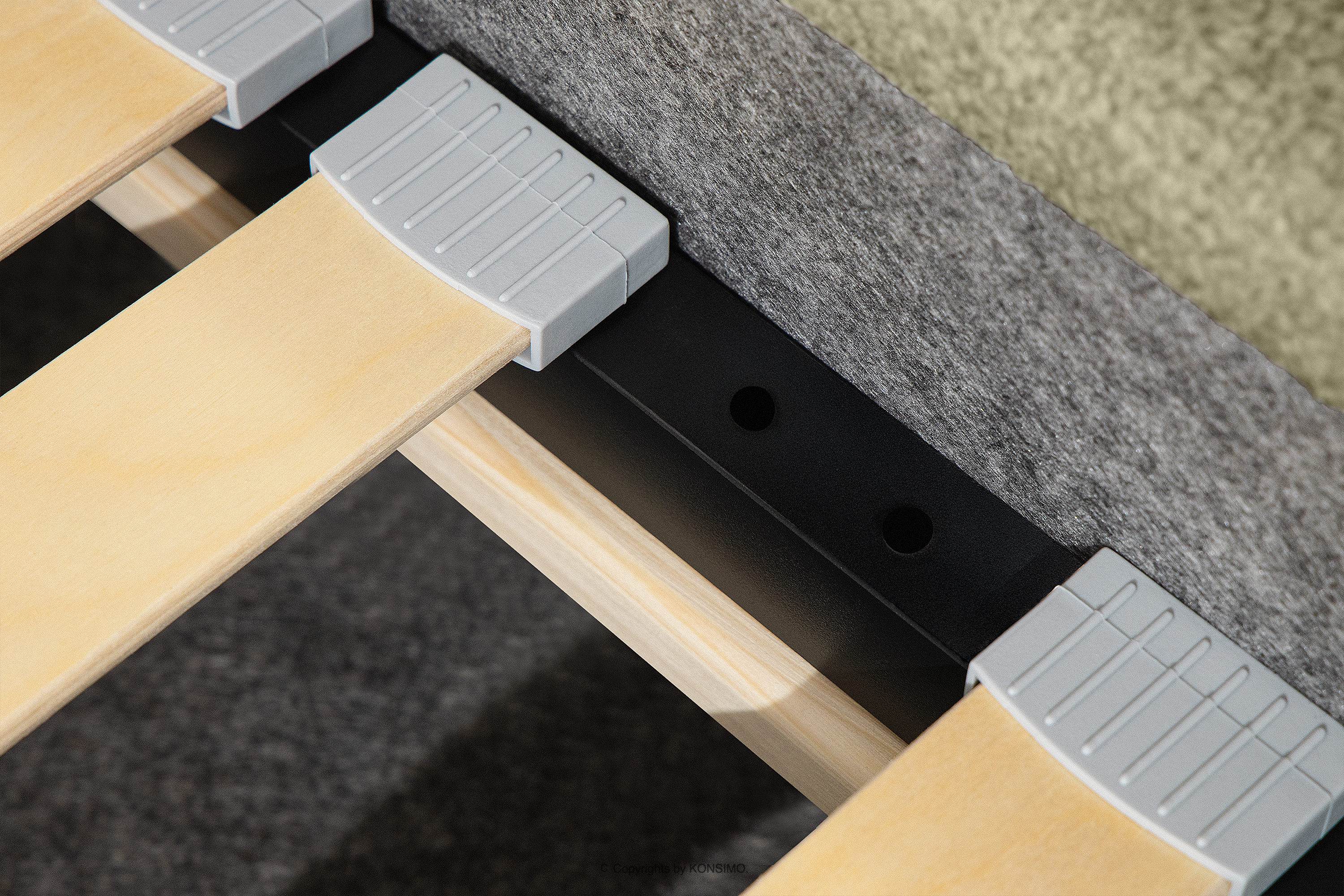 Das 120 cm lange Polsterbett im skandinavischen Stil grün verbindet minimalistisches Design mit maximalem Komfort. Seine einzigartige Form lässt es nicht nur bemerkenswert aussehen, sondern bietet auch Komfort auf höchstem Niveau. Das Bett ist mit einem stabilen Rahmen aus flexiblen Holzlatten ausgestattet, die die Matratze optimal stützen und sich den natürlichen Bewegungen des Körpers anpassen.