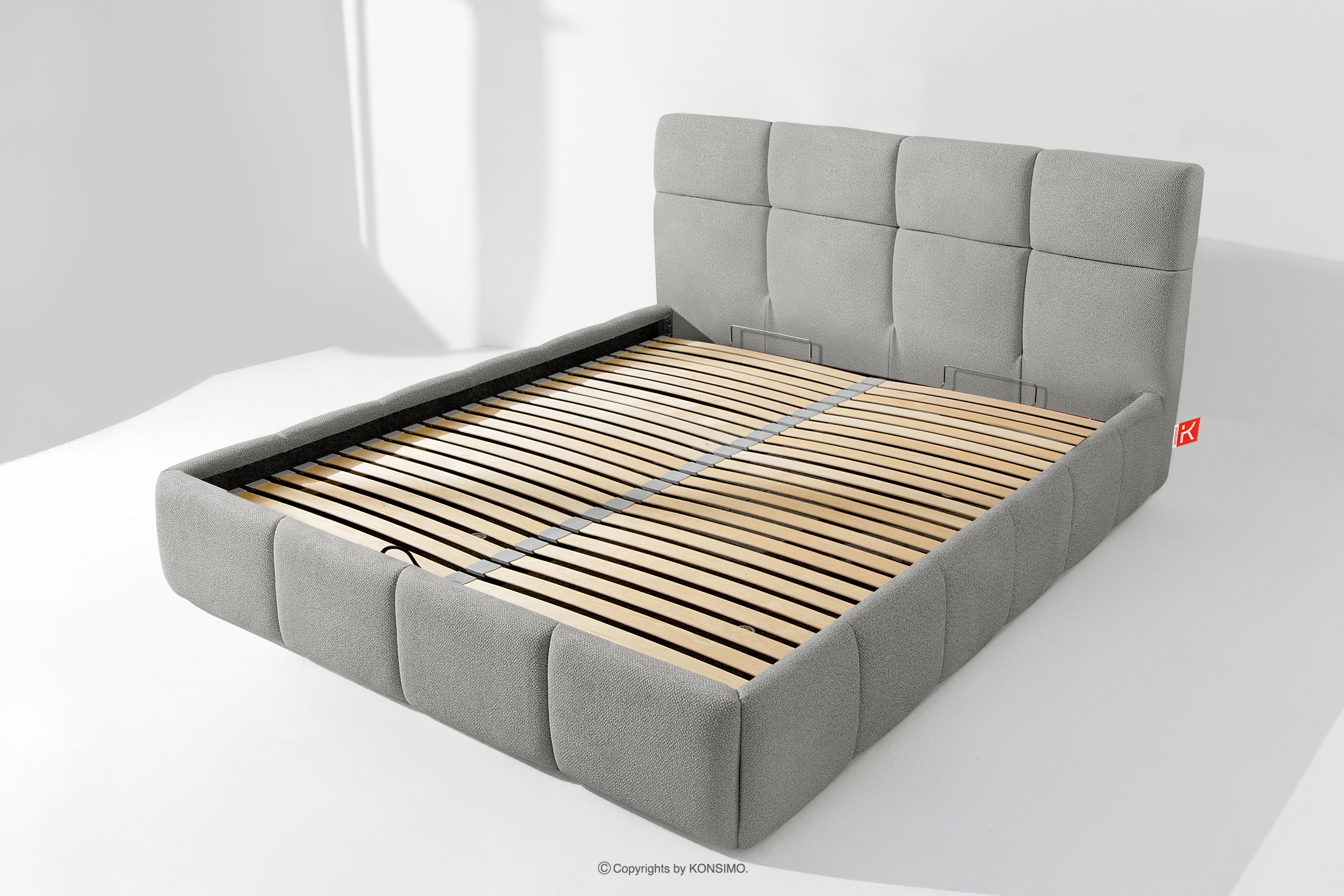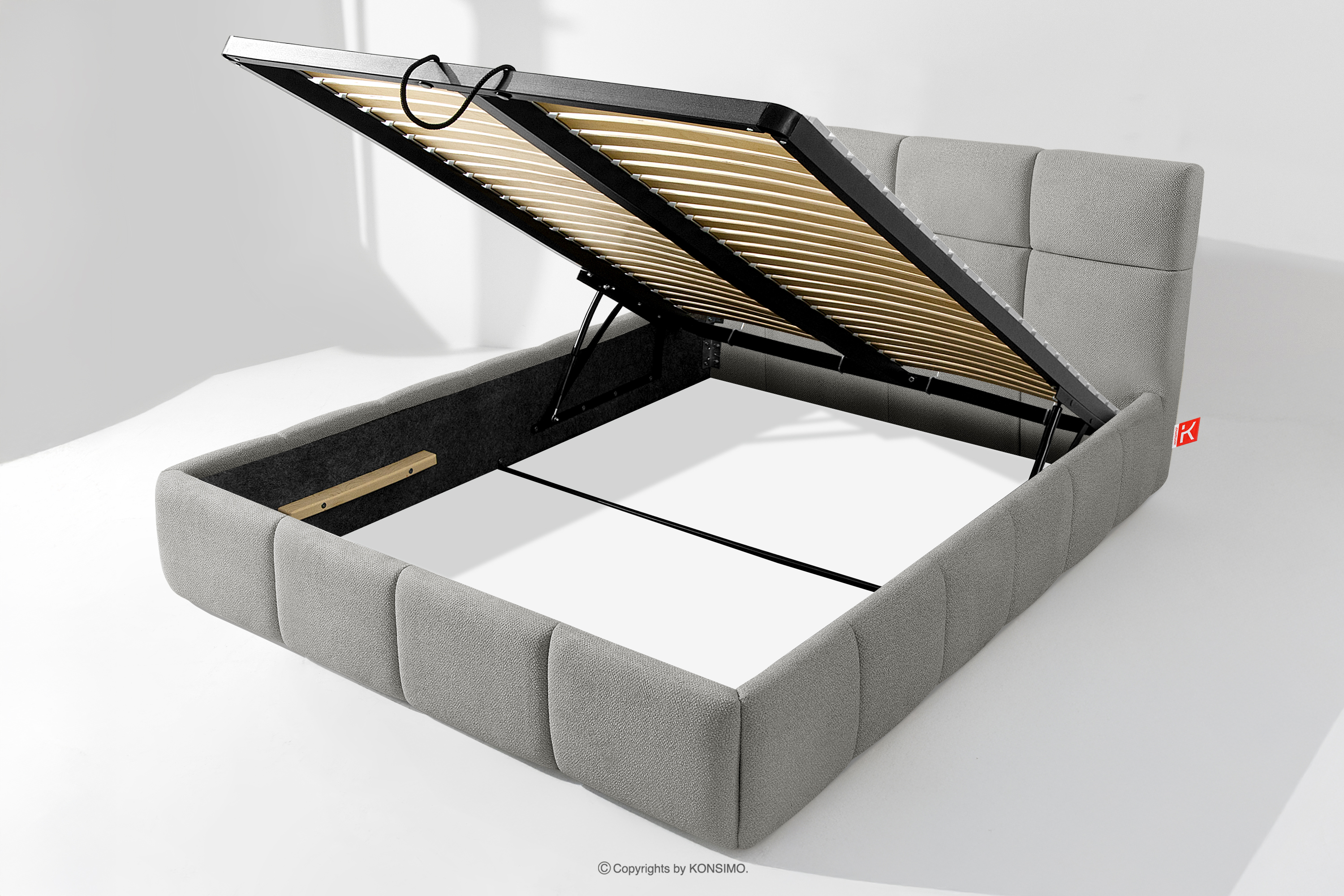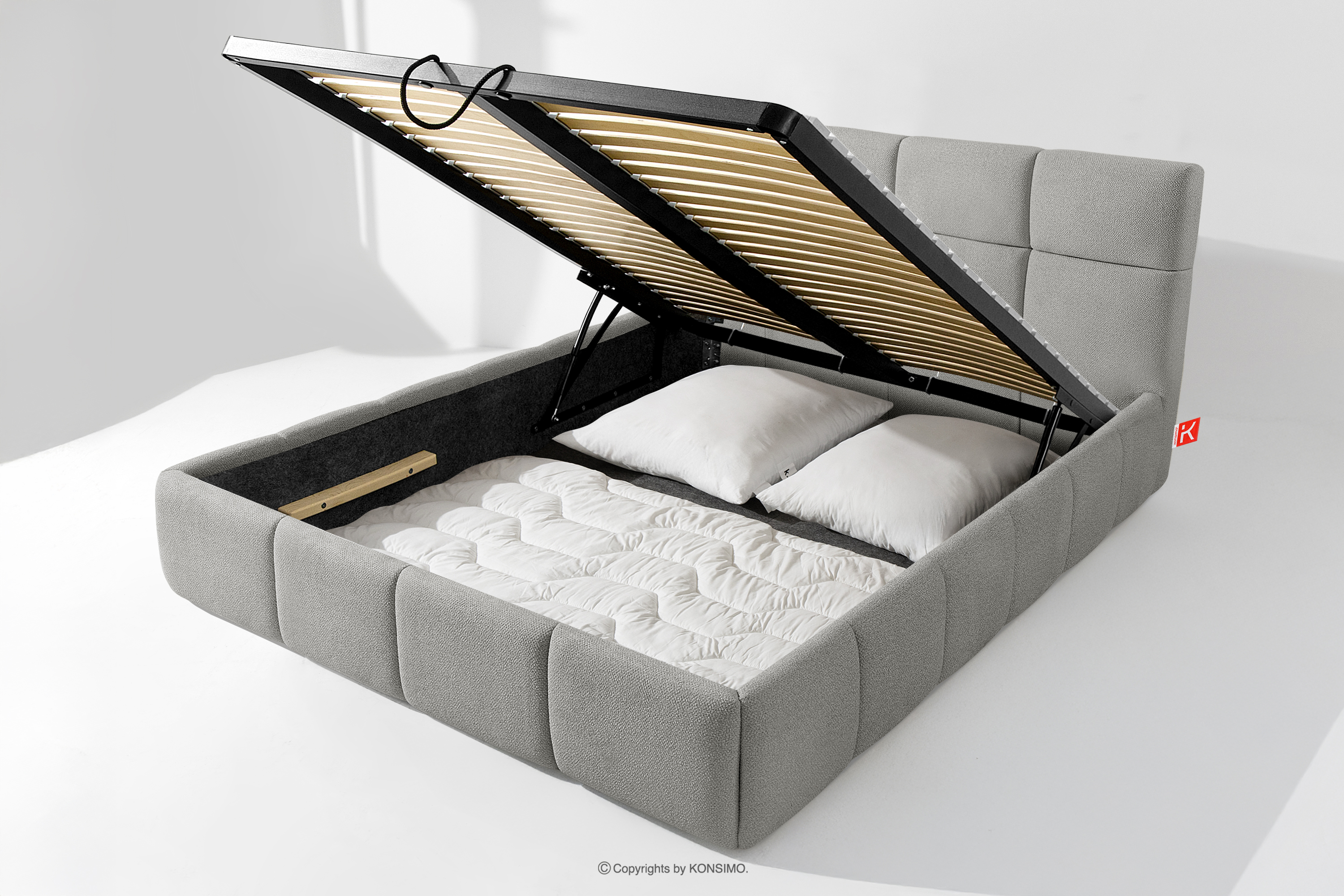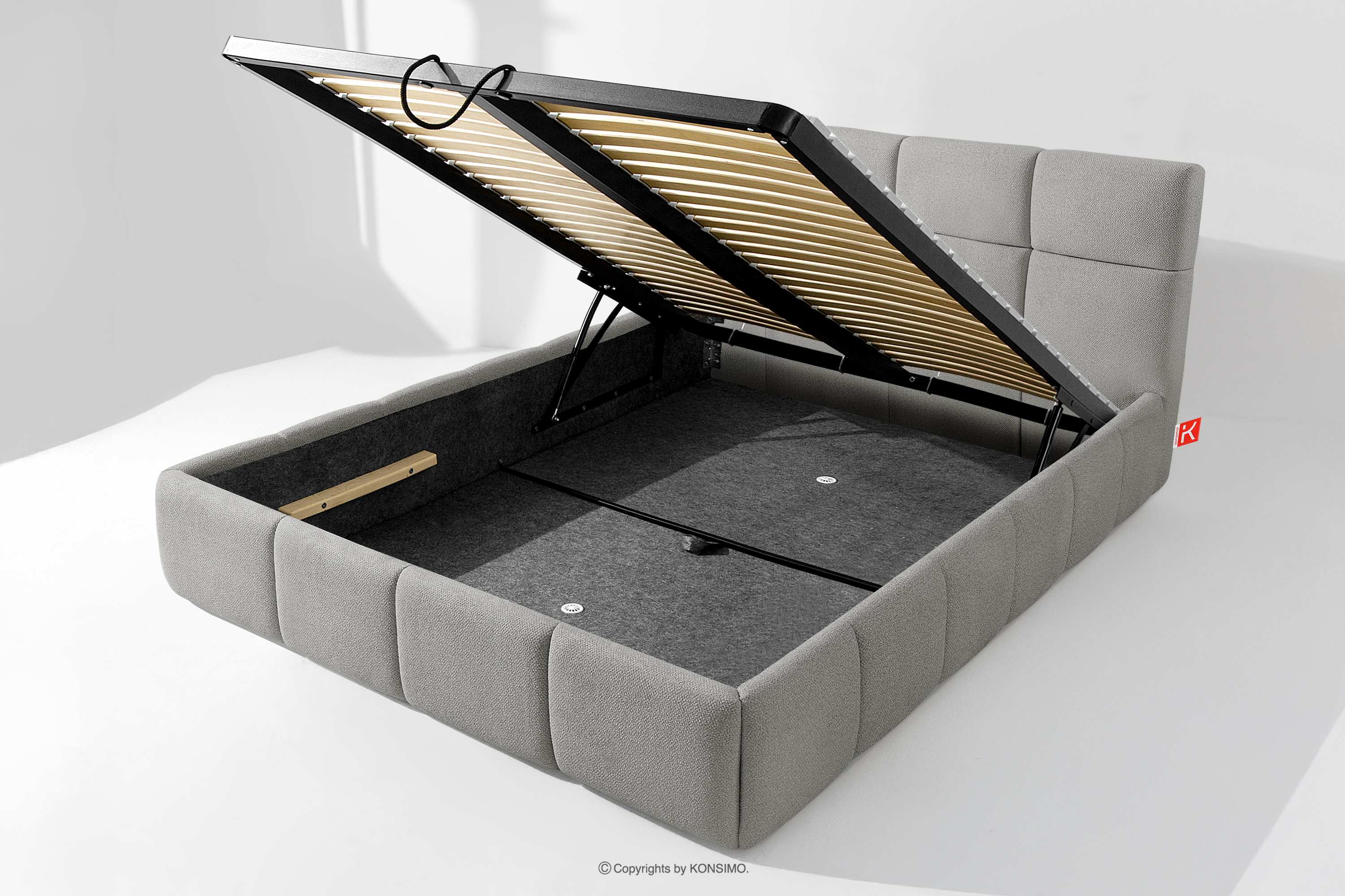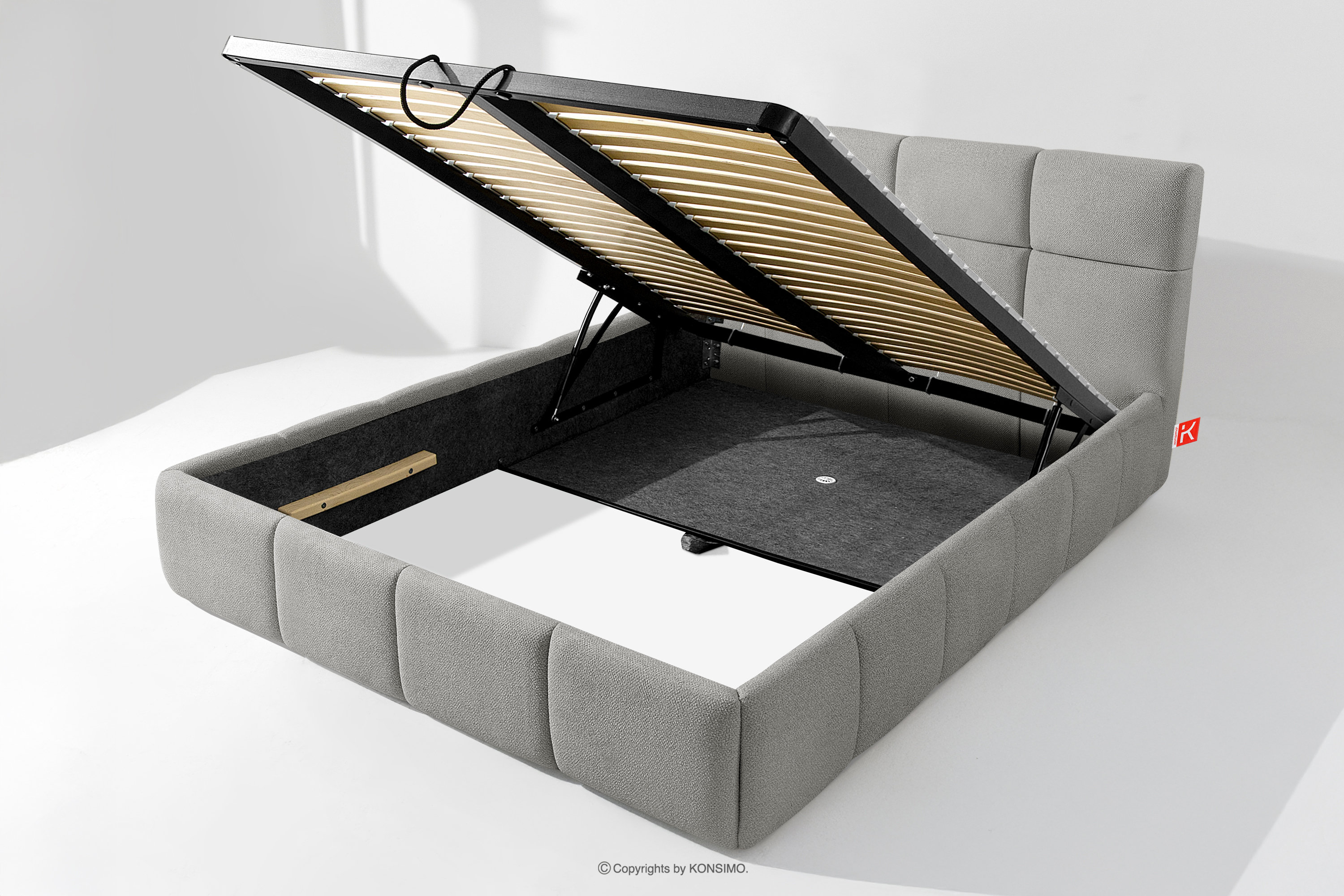 Darüber hinaus hat der Benutzer die Möglichkeit, den Härtegrad des Bettes individuell einzustellen - dank der herausnehmbaren Latten kann eine weichere oder festere Unterlage gewählt werden. Ein weiterer Komfort ist der bequeme Bettzeugbehälter, der sich dank moderner Gasflaschen mühelos und vollautomatisch öffnet. Diese praktische Lösung ermöglicht einen schnellen Zugriff auf das gelagerte Bettzeug, ohne die schwere Matratze manuell anheben zu müssen.