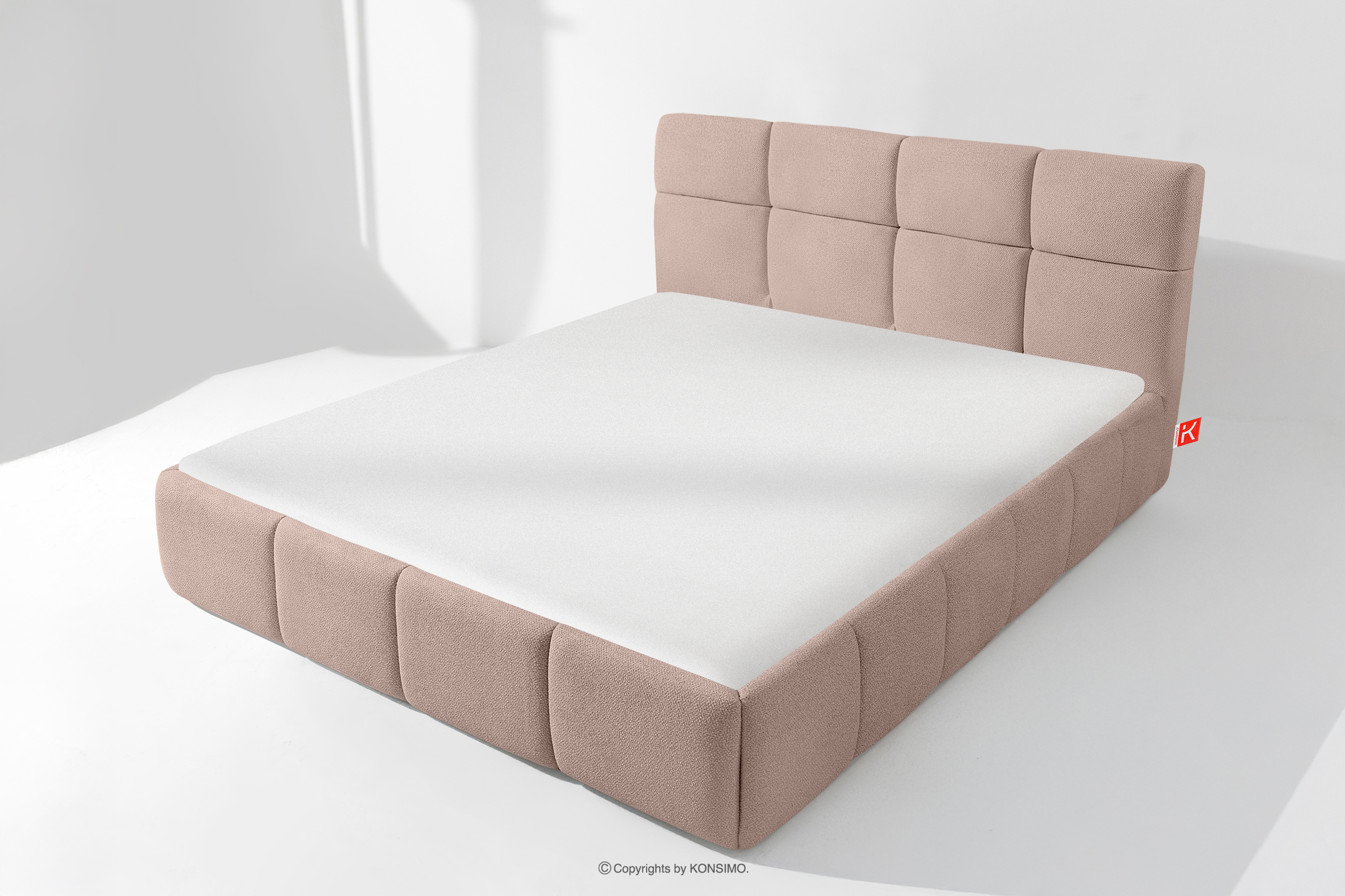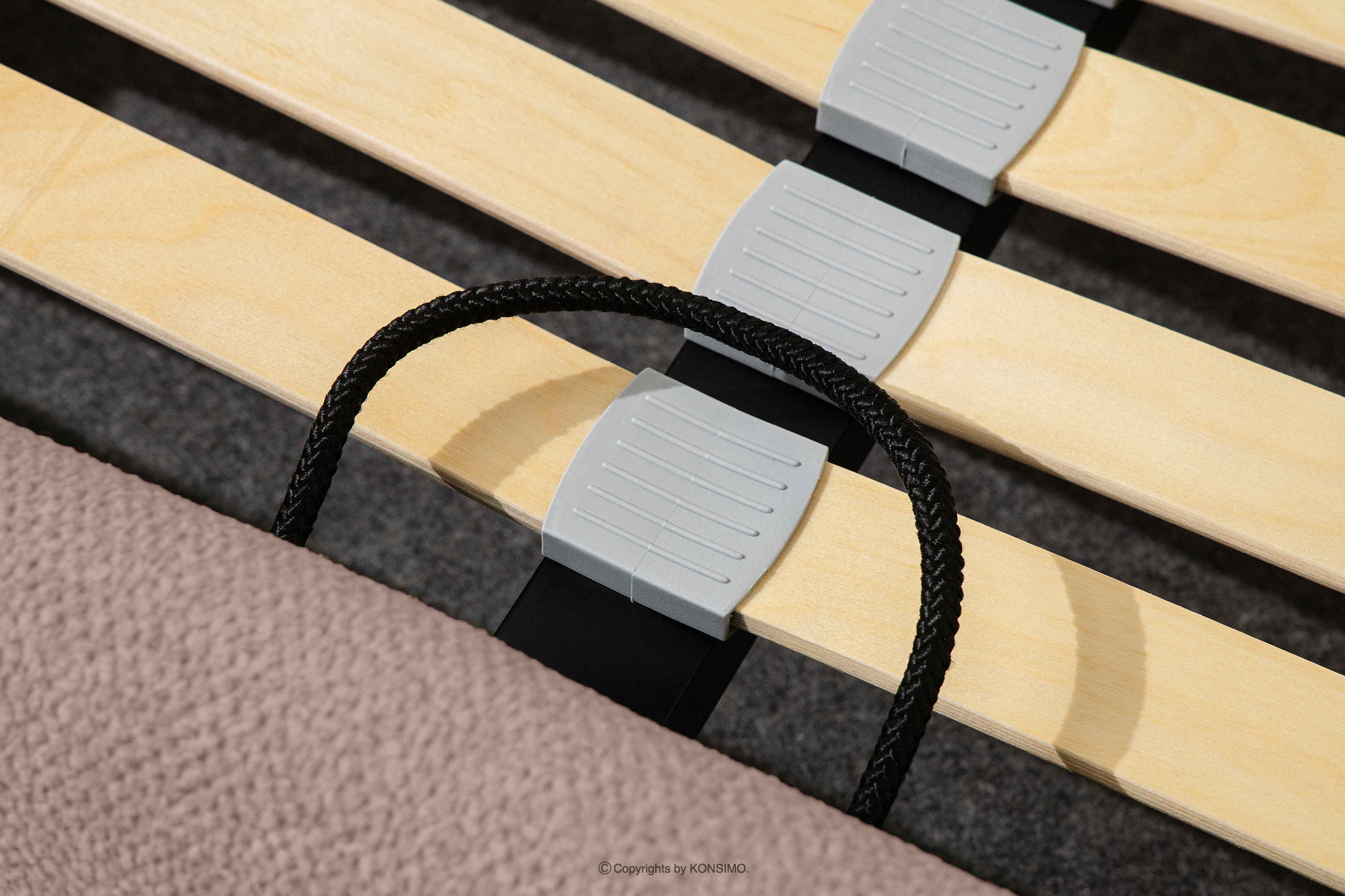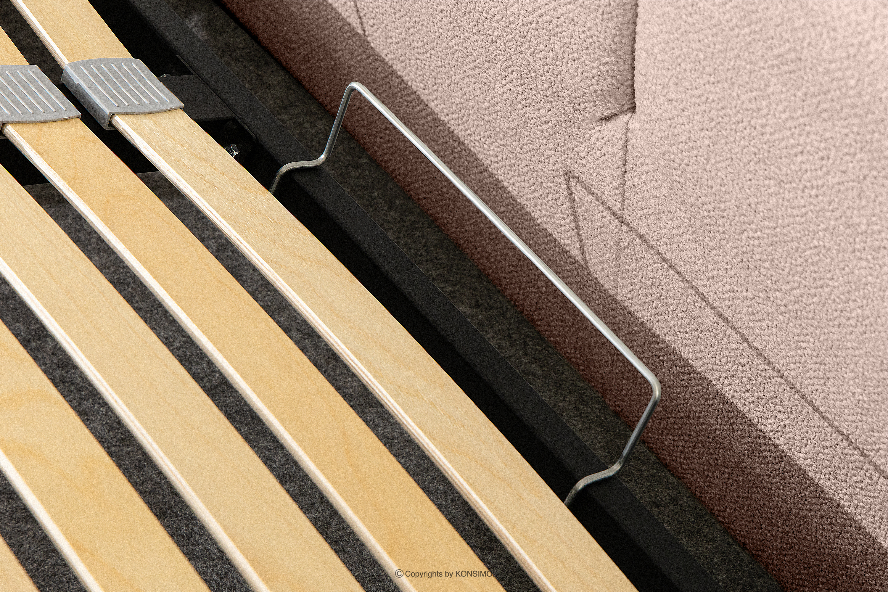 Das 140 cm lange Polsterbett im skandinavischen Stil in Rosa verbindet minimalistisches Design mit maximalem Komfort. Seine einzigartige Form lässt es nicht nur bemerkenswert aussehen, sondern bietet auch Komfort auf höchstem Niveau. Das Bett ist mit einem stabilen Rahmen aus flexiblen Holzlatten ausgestattet, die die Matratze optimal stützen und sich den natürlichen Bewegungen des Körpers anpassen.