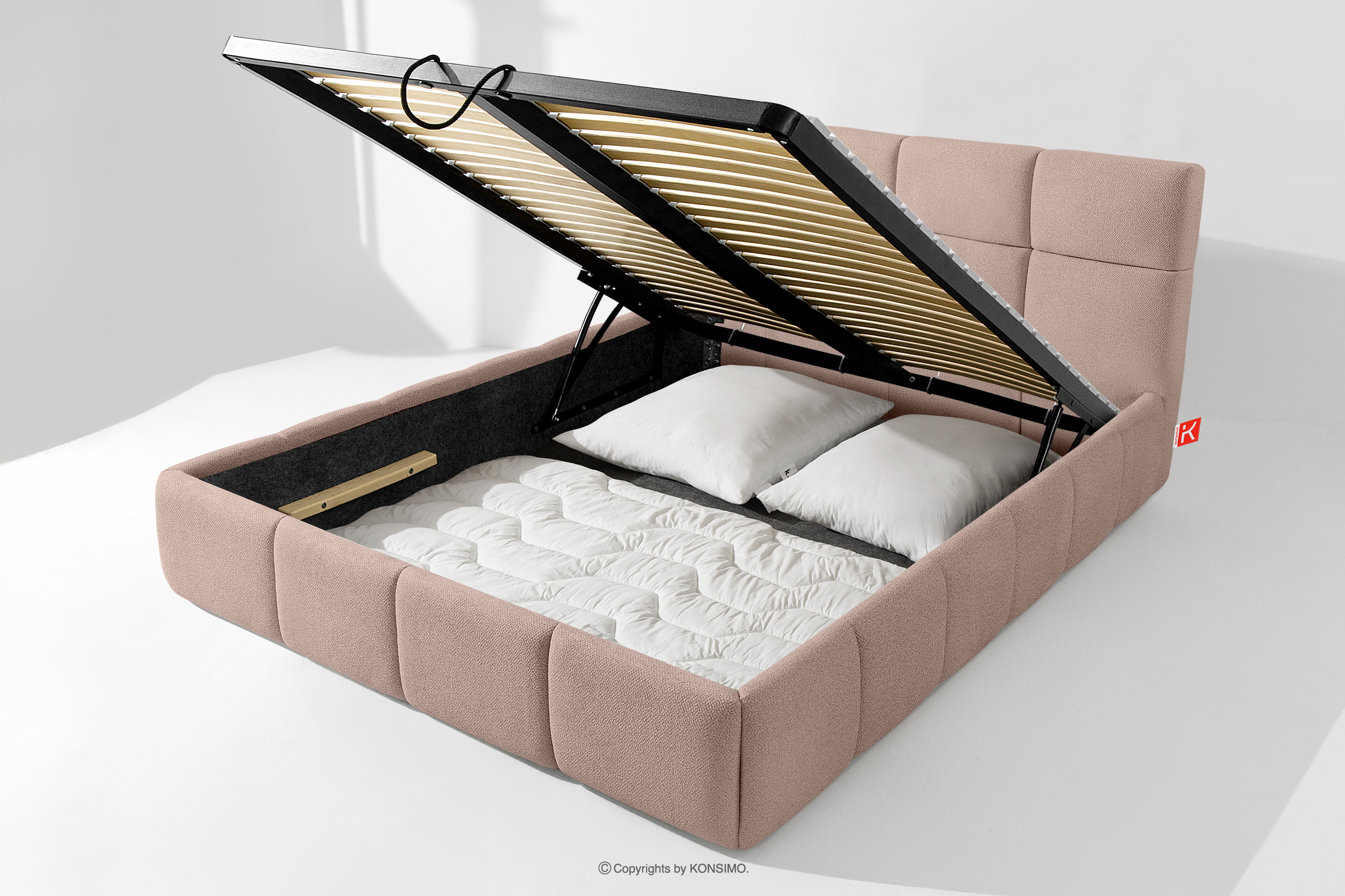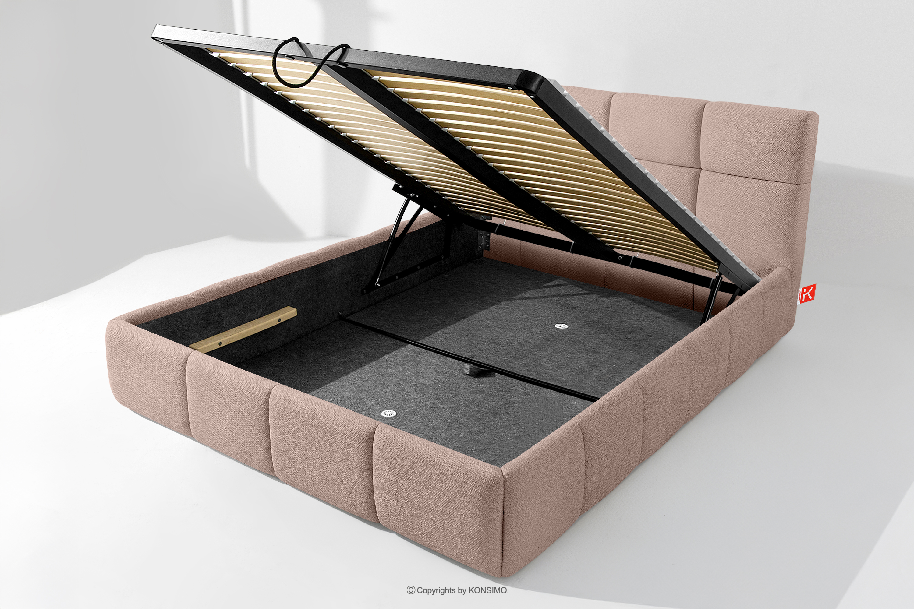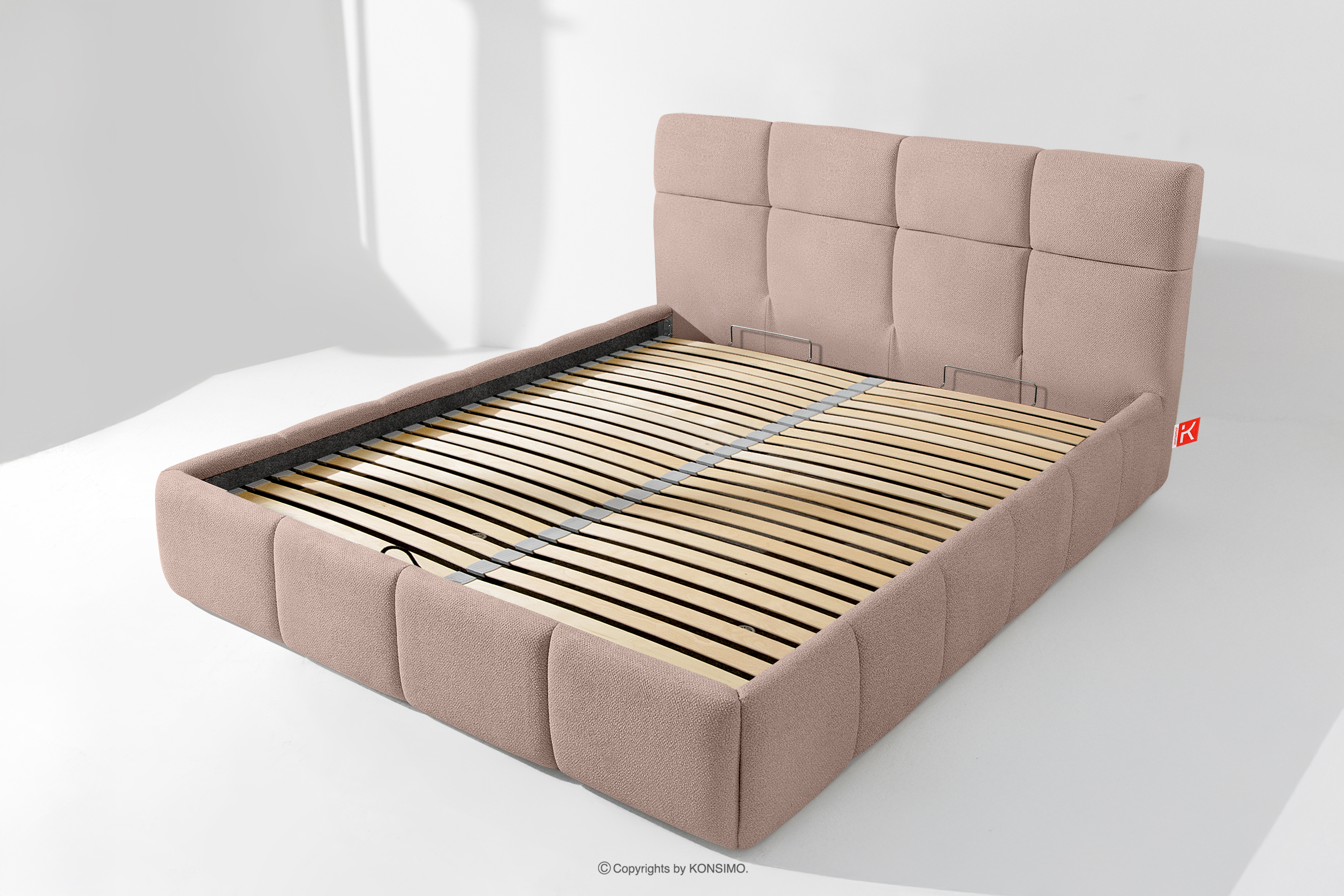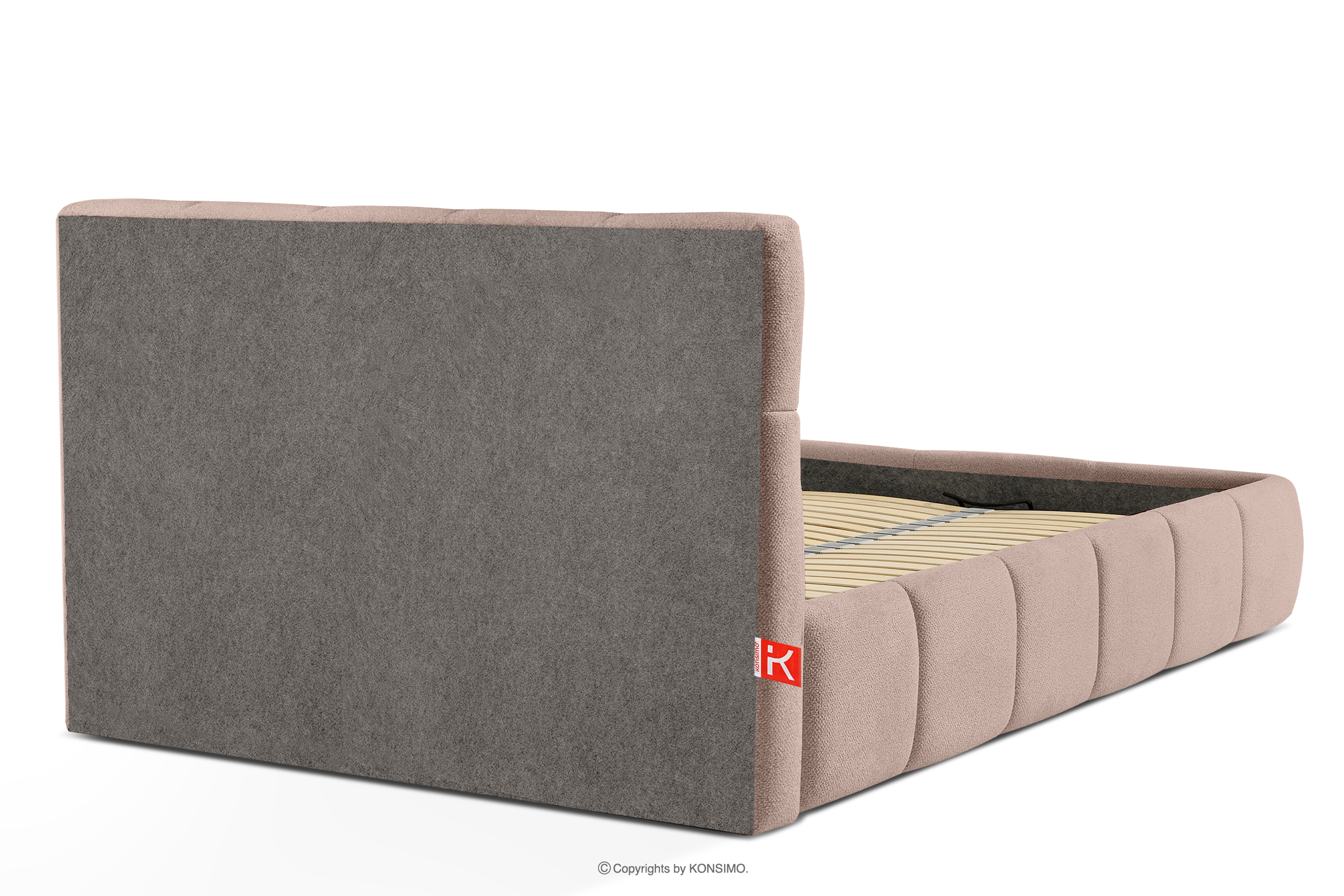 Das 140 cm lange Polsterbett im skandinavischen Stil in Rosa verbindet minimalistisches Design mit maximalem Komfort. Seine einzigartige Form lässt es nicht nur bemerkenswert aussehen, sondern bietet auch Komfort auf höchstem Niveau. Das Bett ist mit einem stabilen Rahmen aus flexiblen Holzlatten ausgestattet, die die Matratze optimal stützen und sich den natürlichen Bewegungen des Körpers anpassen.