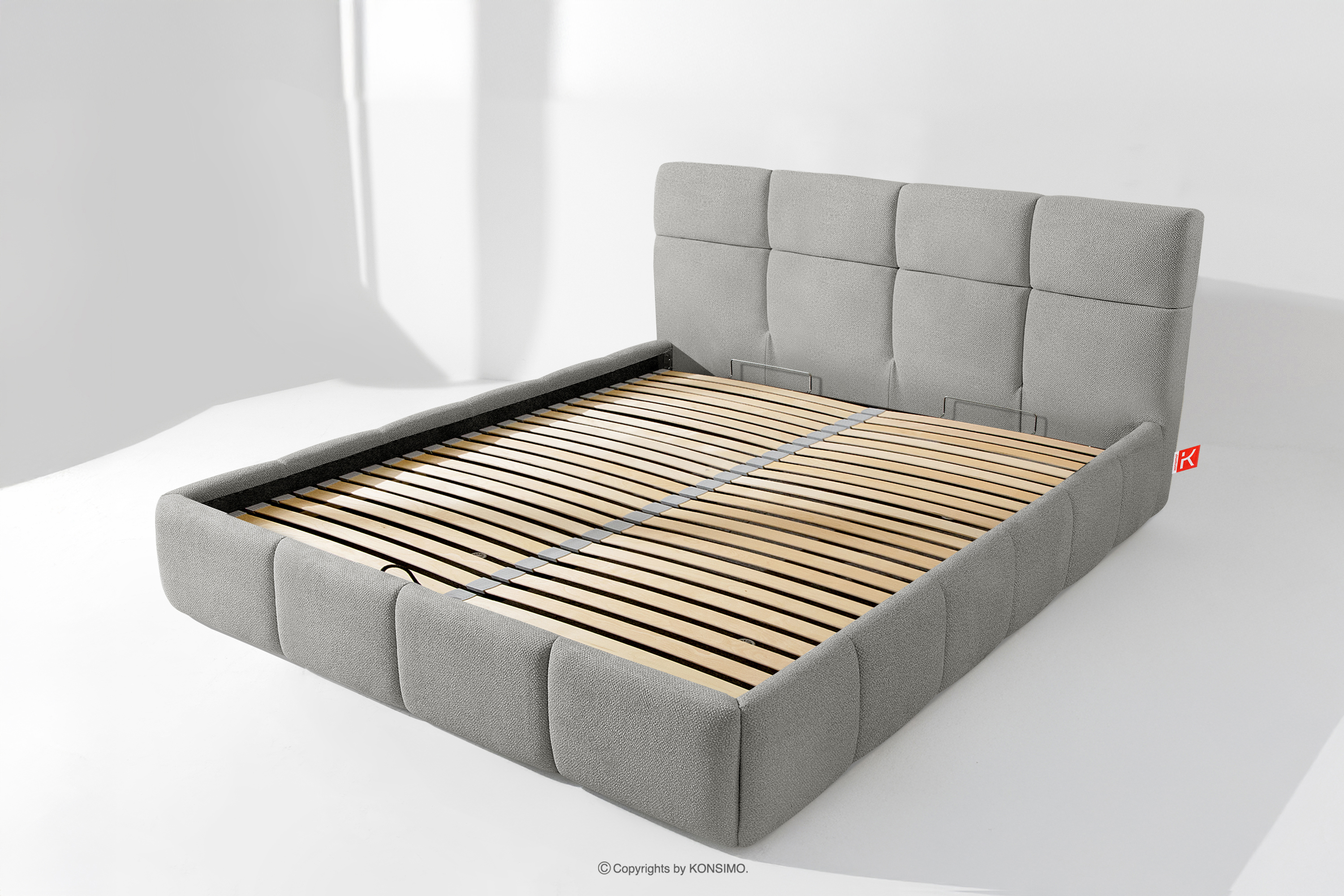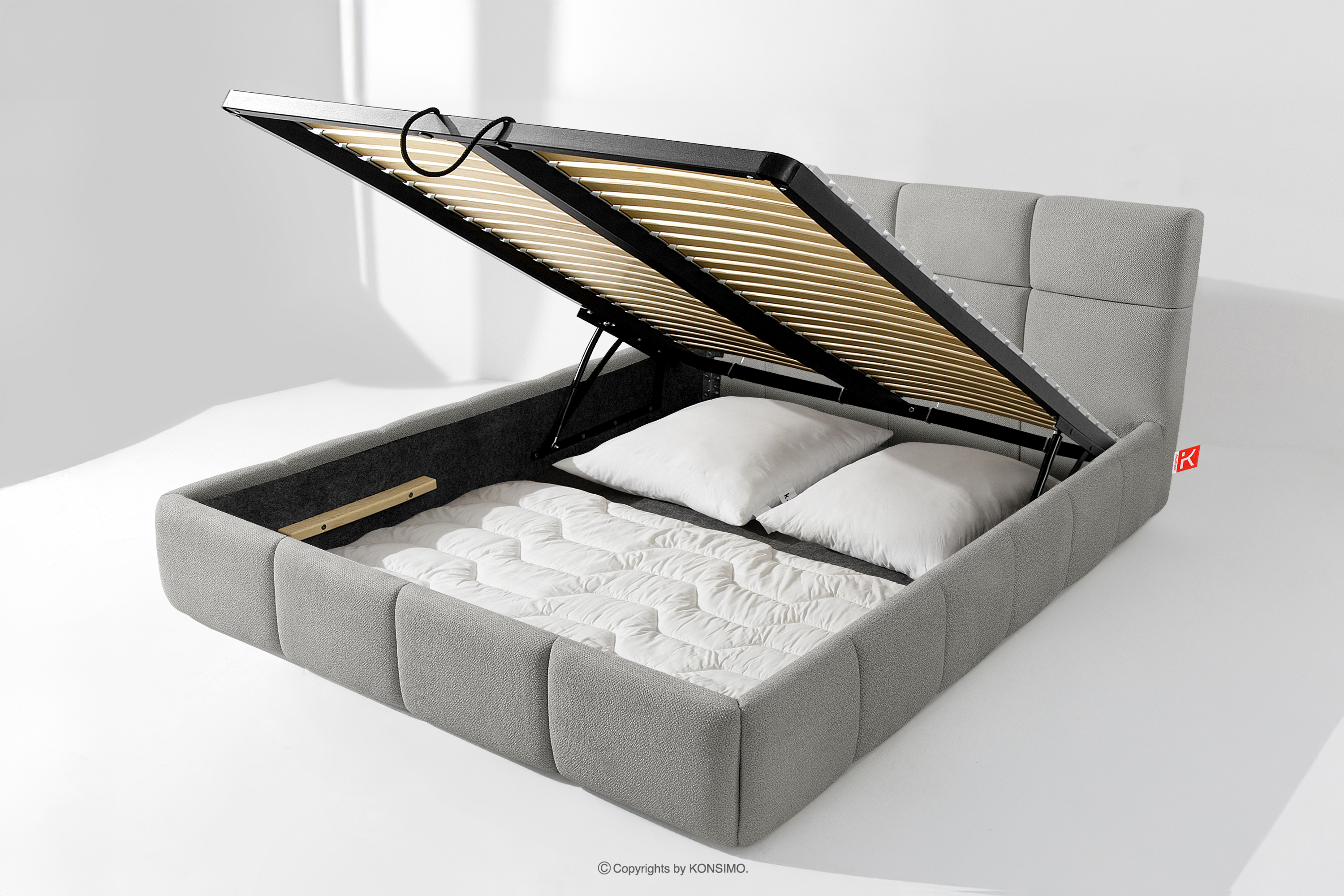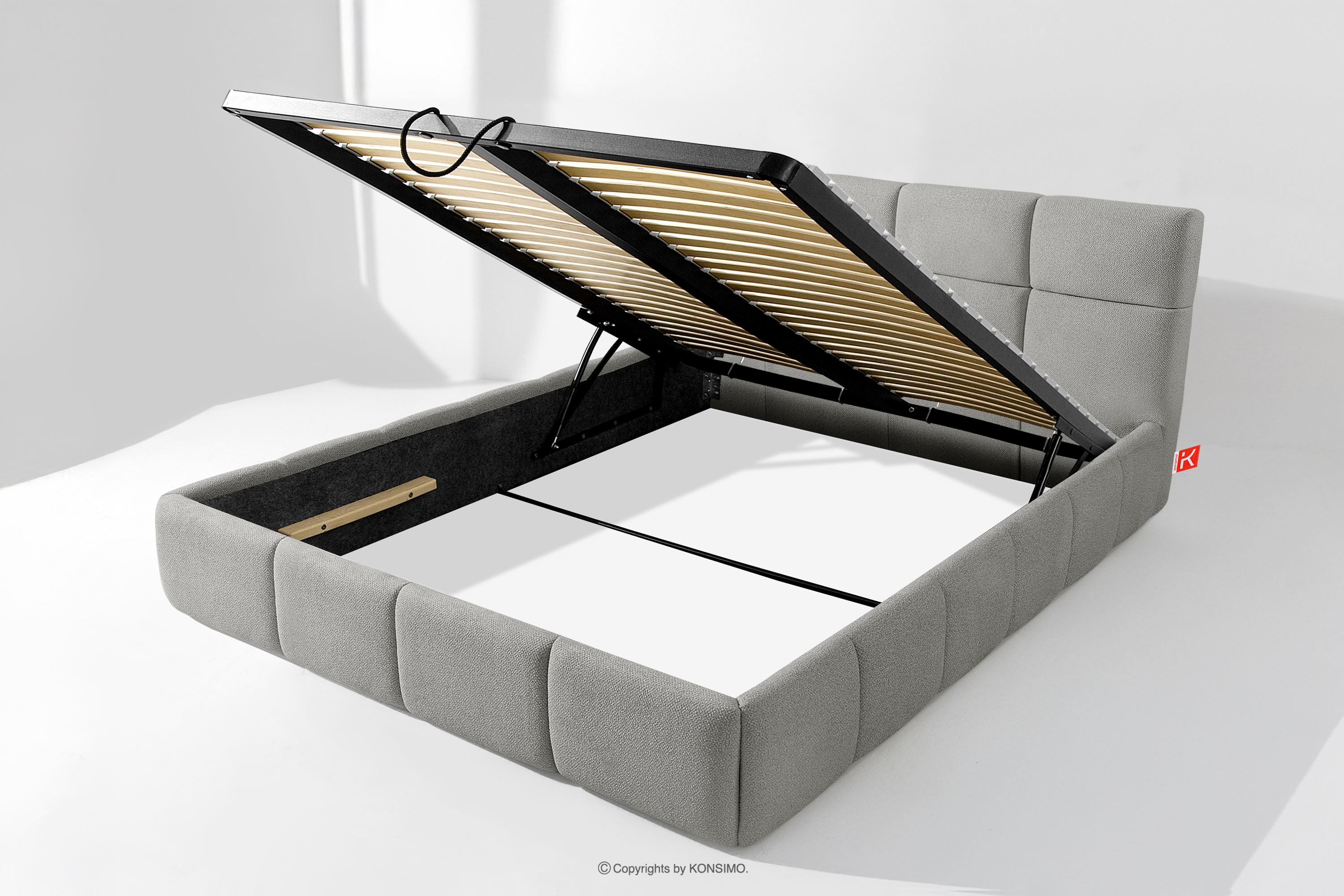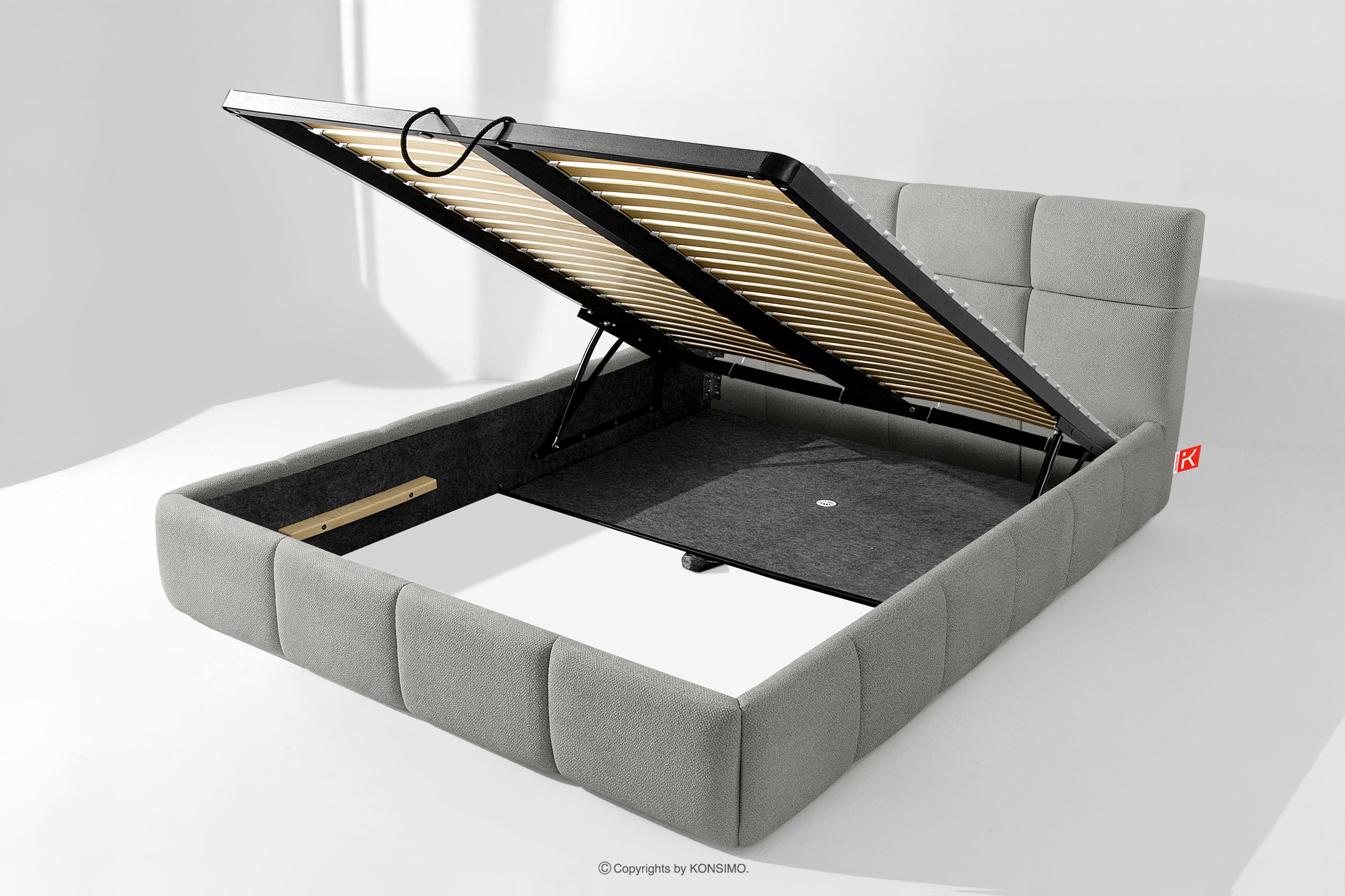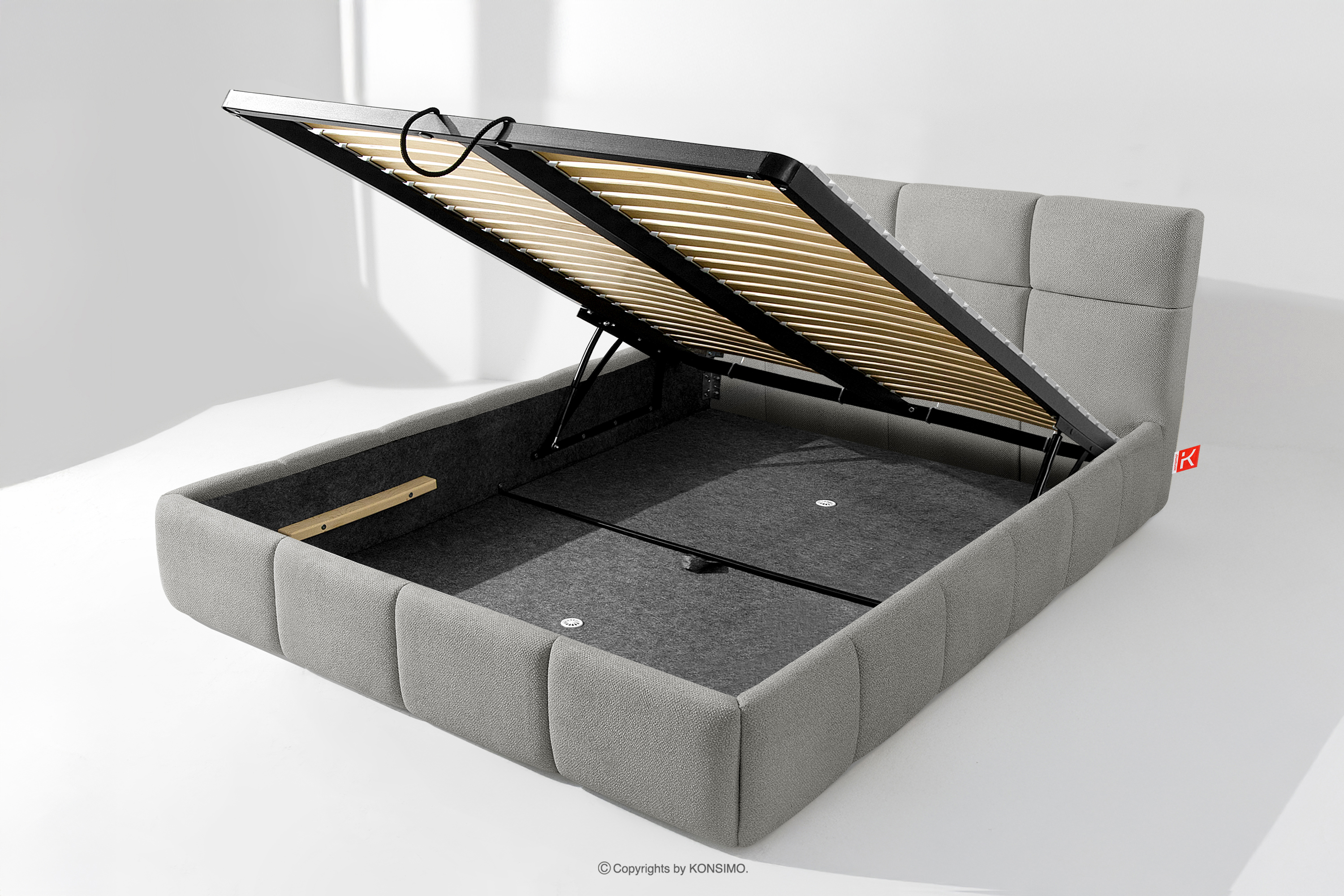 Darüber hinaus hat der Benutzer die Möglichkeit, den Härtegrad des Bettes individuell einzustellen - dank der herausnehmbaren Latten kann eine weichere oder festere Unterlage gewählt werden. Ein weiterer Komfort ist der bequeme Bettzeugbehälter, der sich dank moderner Gasflaschen mühelos und vollautomatisch öffnet. Diese praktische Lösung ermöglicht einen schnellen Zugriff auf das gelagerte Bettzeug, ohne die schwere Matratze manuell anheben zu müssen.