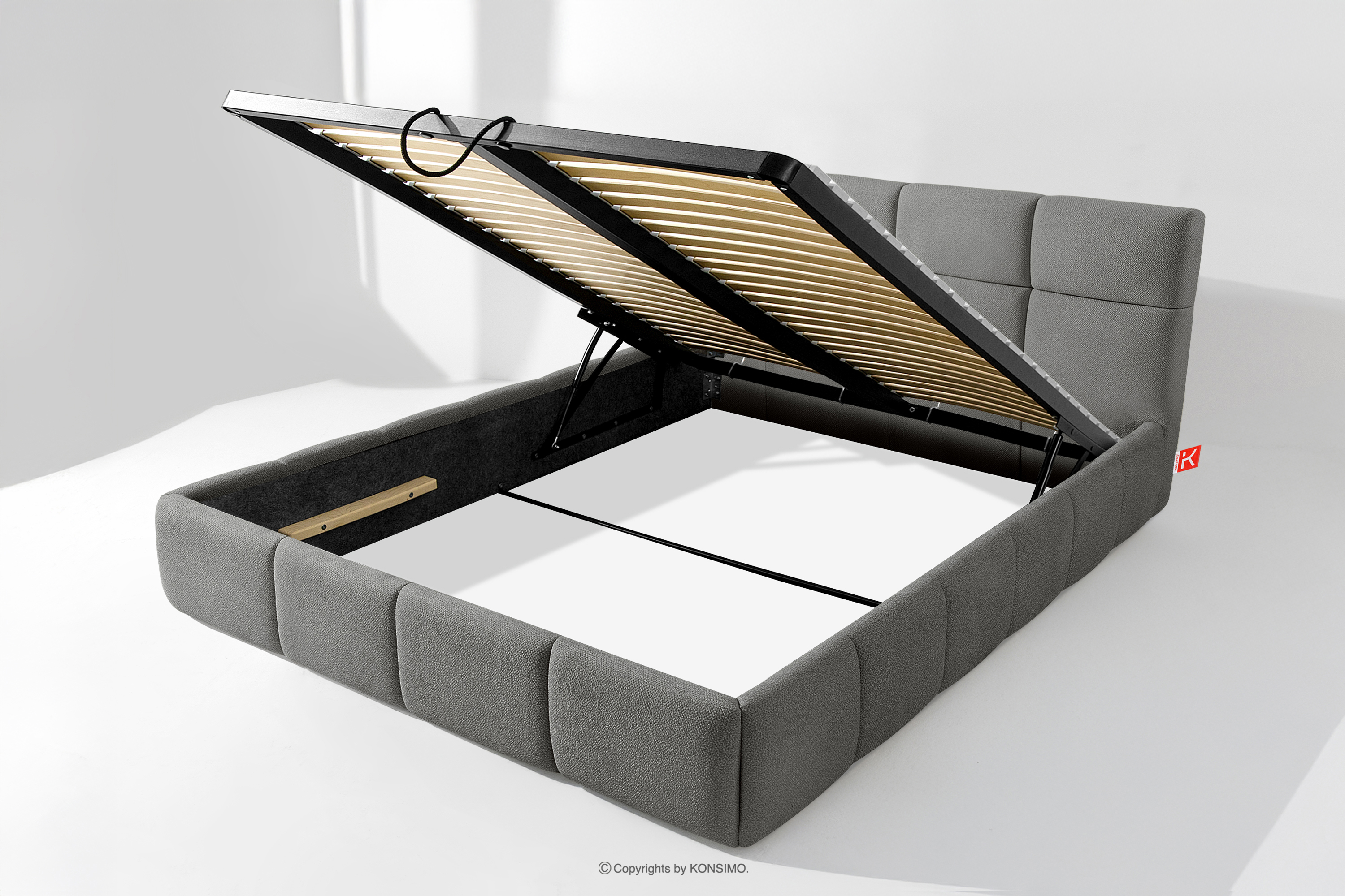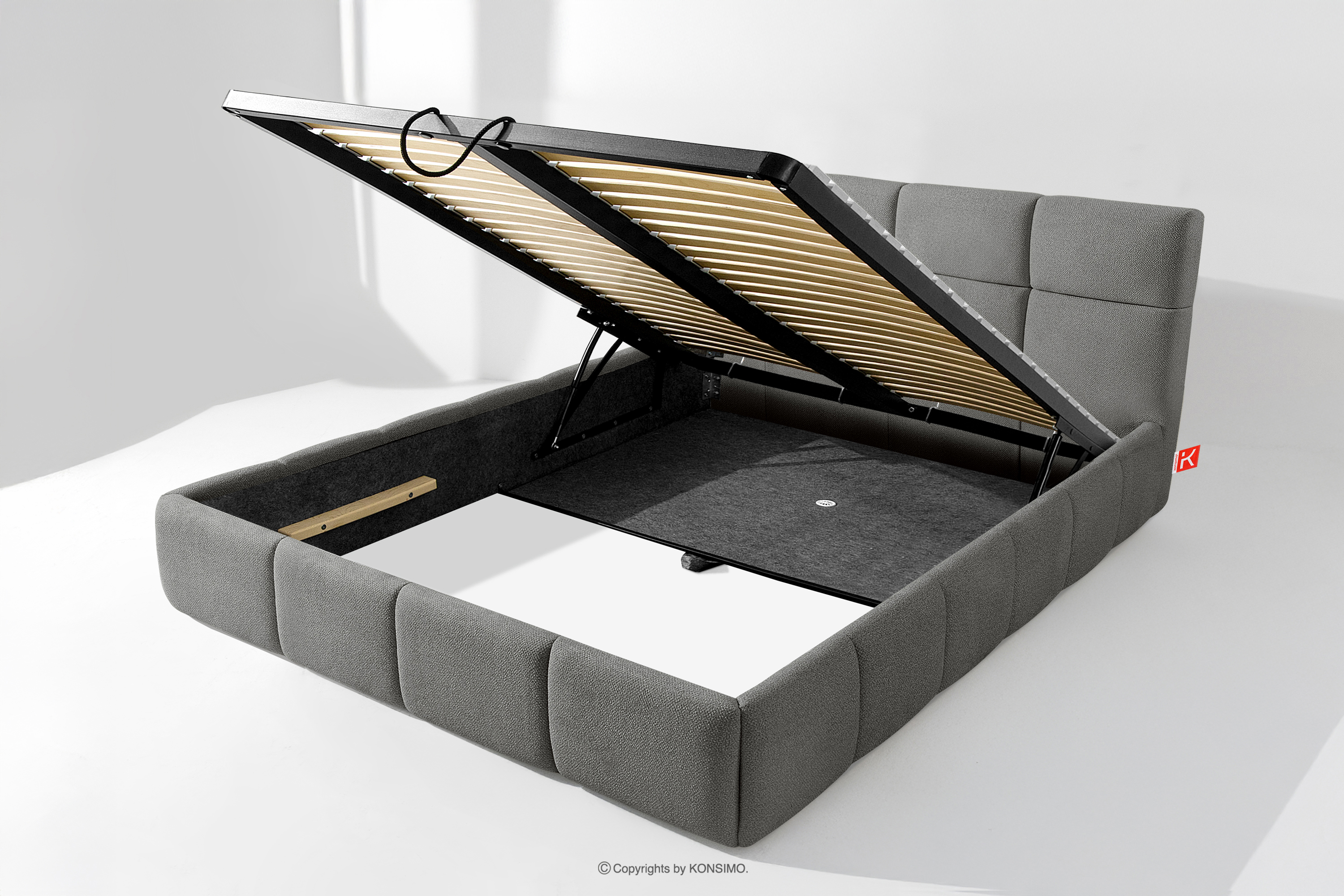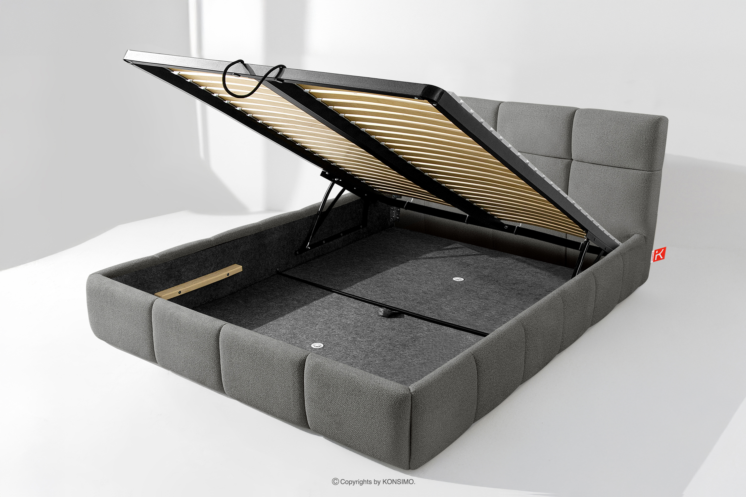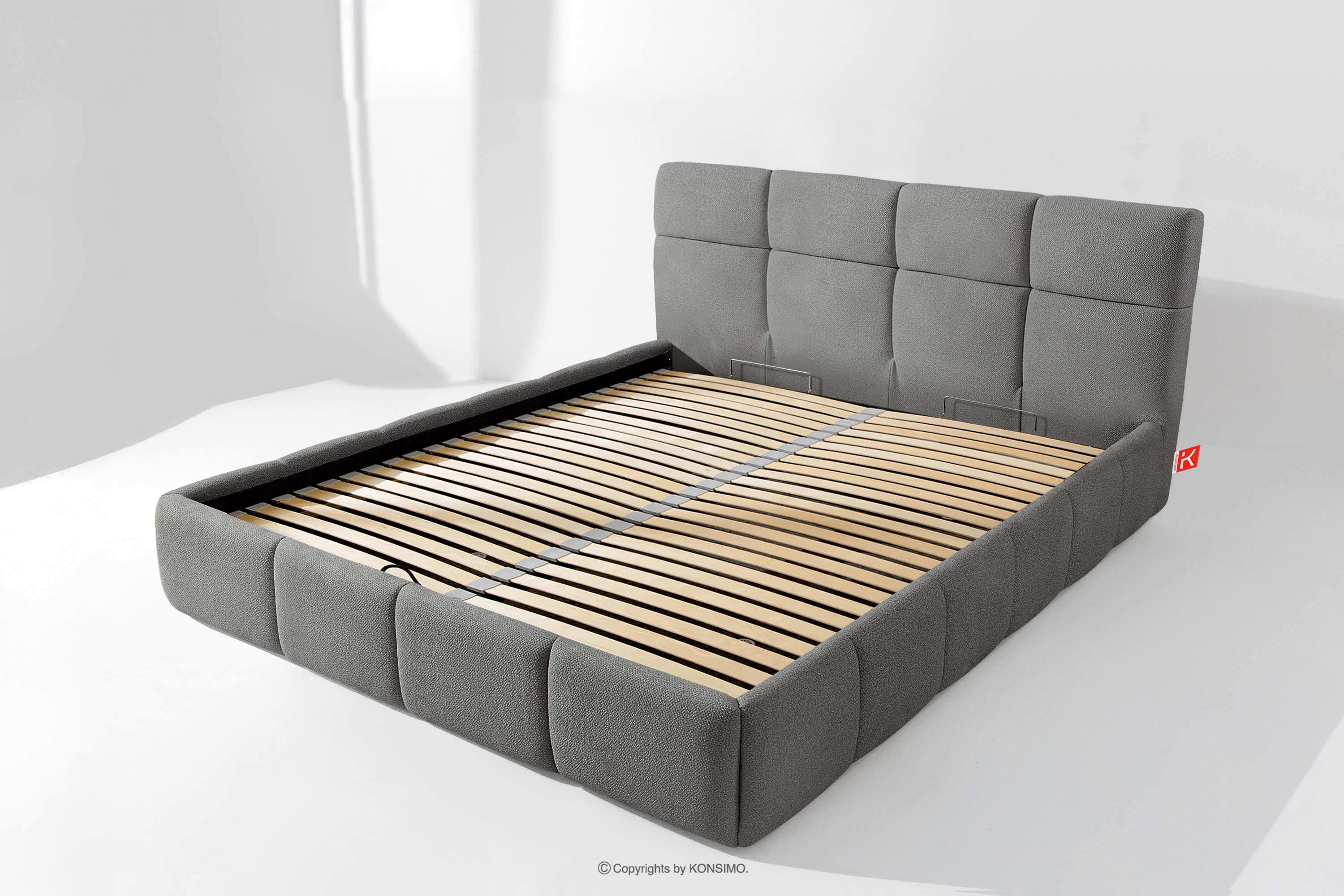 Der für den Bezug des Bettes verwendete Stoff ist von höchster Qualität - er sieht nicht nur schön aus und verleiht dem Interieur Eleganz, sondern ist auch äußerst funktionell. Er ist widerstandsfähig gegen Abrieb und alltägliche Beanspruchung. Der Stoff passt perfekt in moderne und skandinavische Interieurs, in denen Schlichtheit und Funktionalität Hand in Hand gehen. Der Boden des Bettkastens ist herausnehmbar, so dass die Reinigung unter den Möbeln leicht möglich ist. Außerdem sind die Wände und die Bodenplatte des Kastens mit Filz versehen, der das Verrutschen von Bettzeug und anderen gelagerten Gegenständen verhindert und für Ordnung und Ästhetik sorgt.