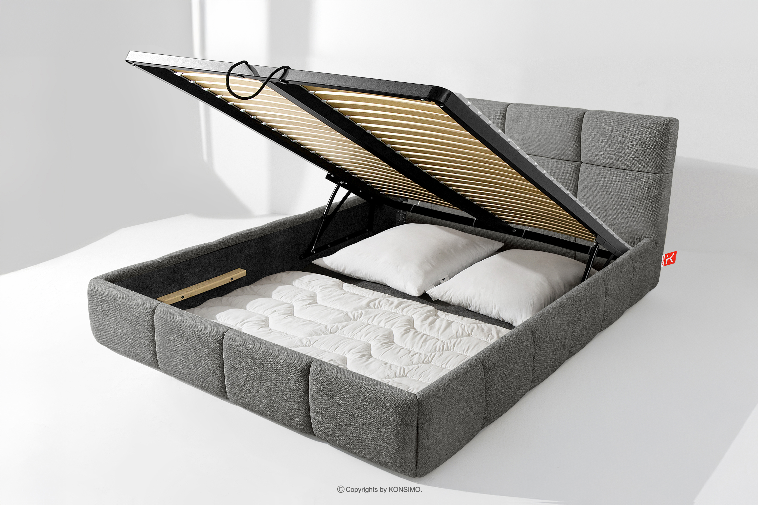 Darüber hinaus hat der Benutzer die Möglichkeit, den Härtegrad des Bettes individuell einzustellen - dank der herausnehmbaren Latten kann eine weichere oder festere Unterlage gewählt werden. Ein weiterer Komfort ist der bequeme Bettzeugbehälter, der sich dank moderner Gasflaschen mühelos und vollautomatisch öffnet. Diese praktische Lösung ermöglicht einen schnellen Zugriff auf das gelagerte Bettzeug, ohne die schwere Matratze manuell anheben zu müssen.