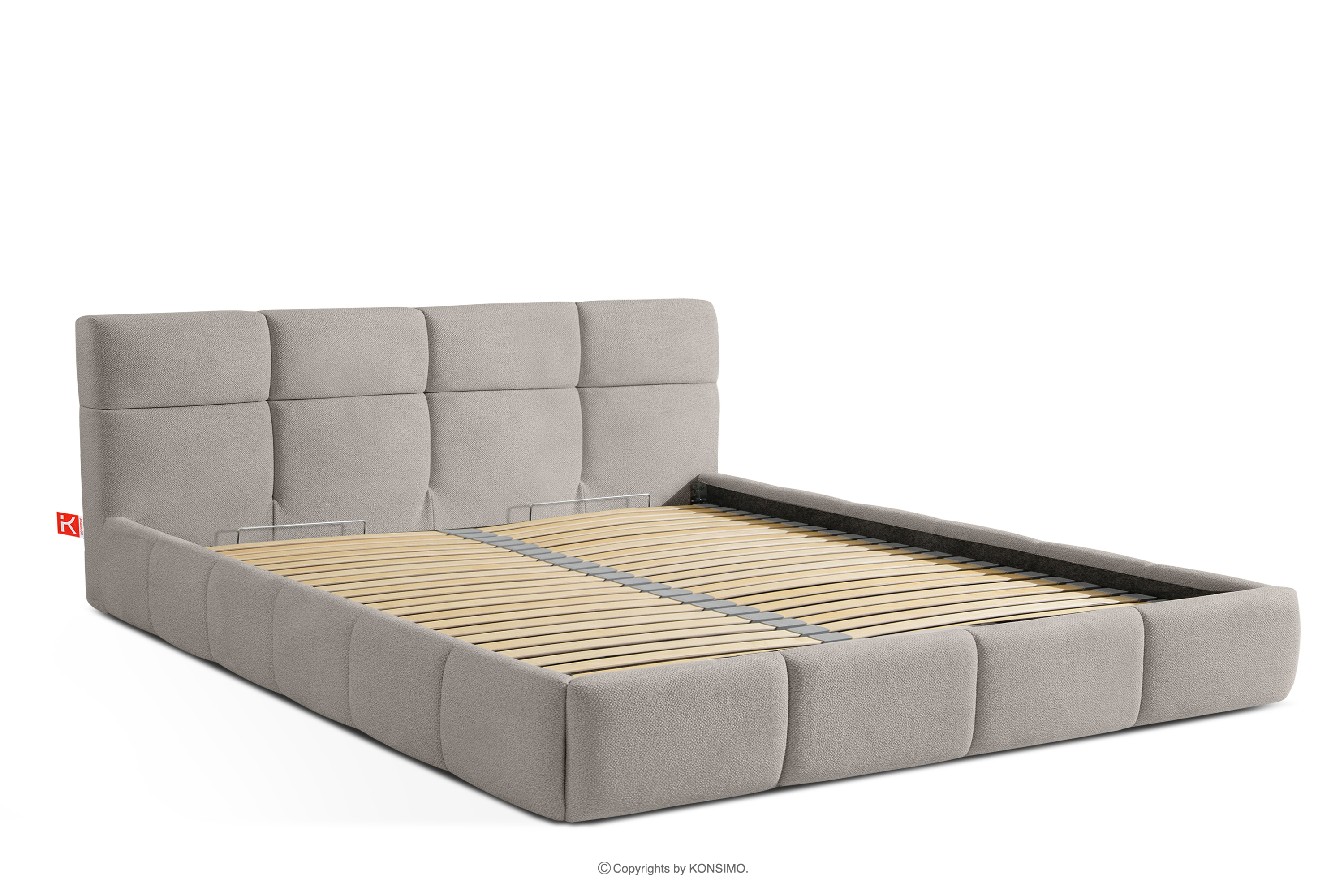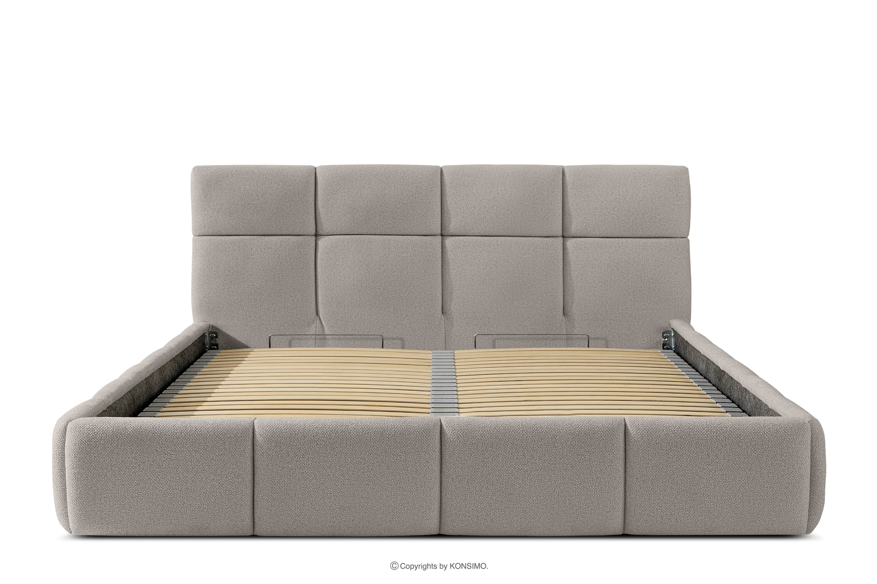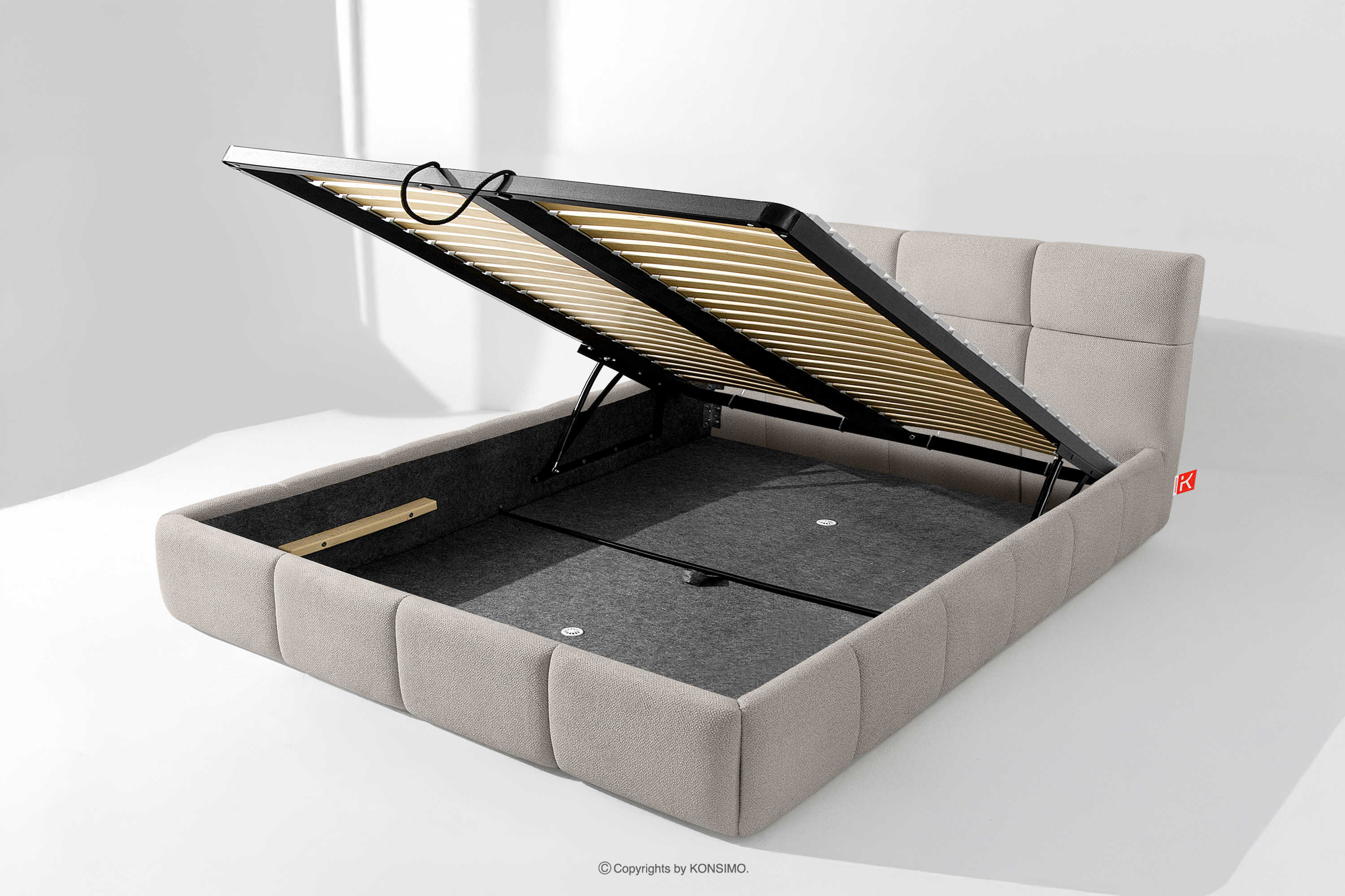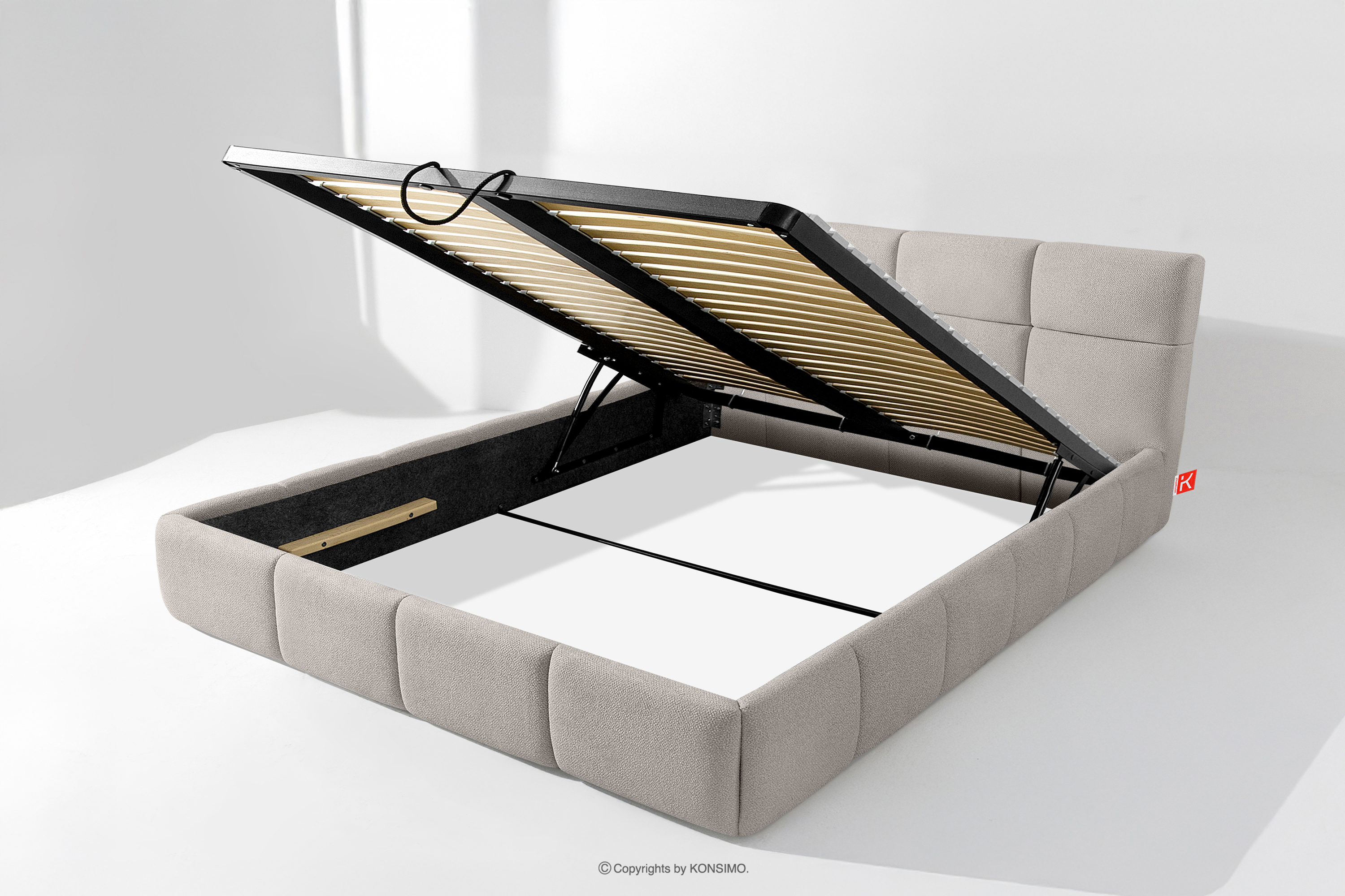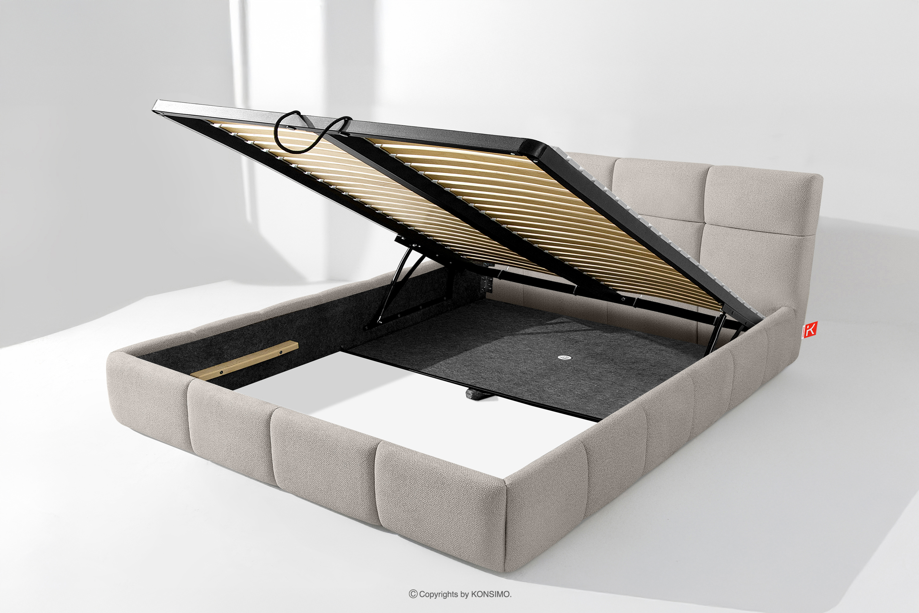 Der für den Bezug des Bettes verwendete Stoff ist von höchster Qualität - er sieht nicht nur schön aus und verleiht dem Interieur Eleganz, sondern ist auch äußerst funktionell. Er ist widerstandsfähig gegen Abrieb und alltägliche Beanspruchung. Der Stoff passt perfekt in moderne und skandinavische Interieurs, in denen Schlichtheit und Funktionalität Hand in Hand gehen. Der Boden des Bettkastens ist herausnehmbar, so dass die Reinigung unter den Möbeln leicht möglich ist. Außerdem sind die Wände und die Bodenplatte des Kastens mit Filz versehen, der das Verrutschen von Bettzeug und anderen gelagerten Gegenständen verhindert und für Ordnung und Ästhetik sorgt.