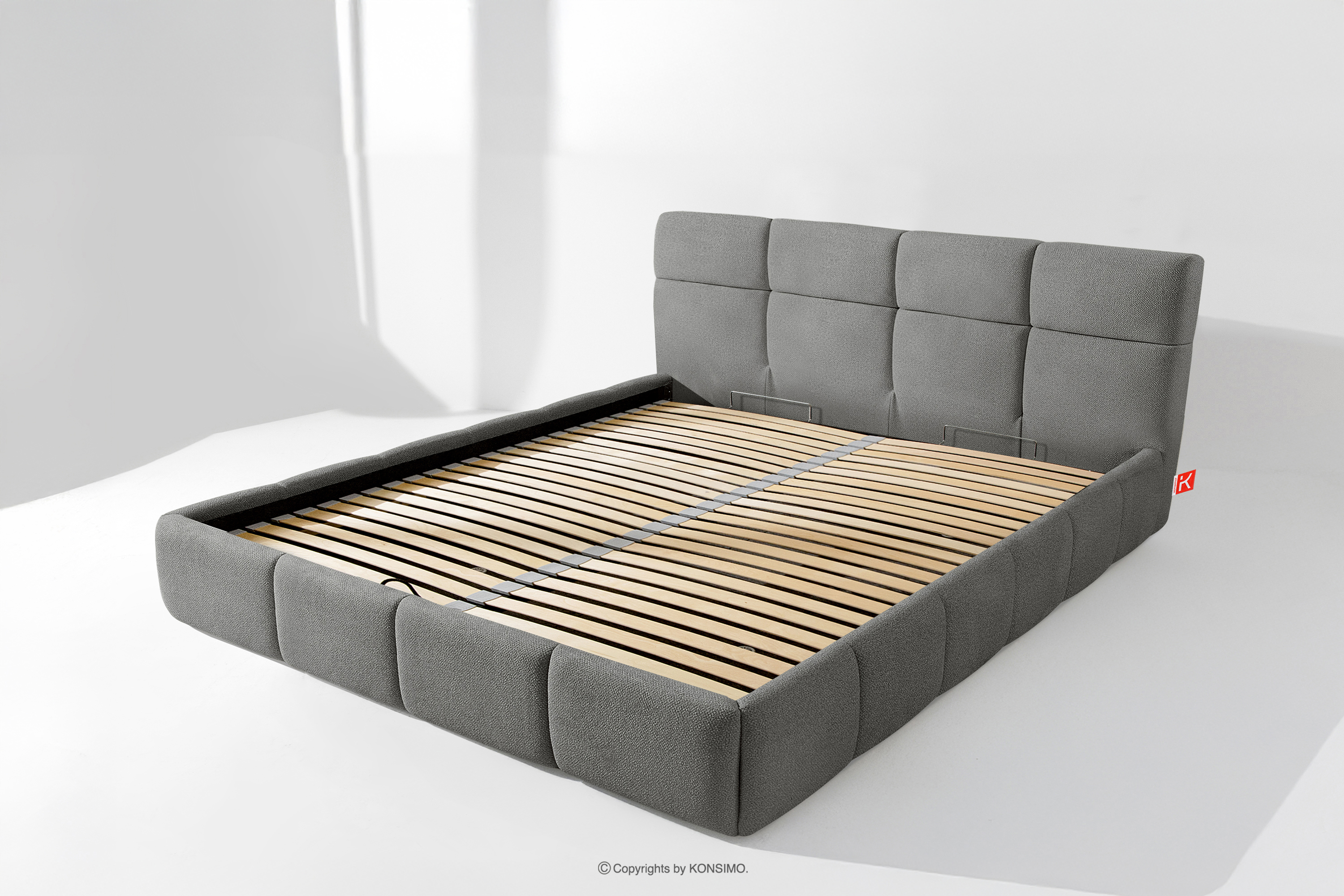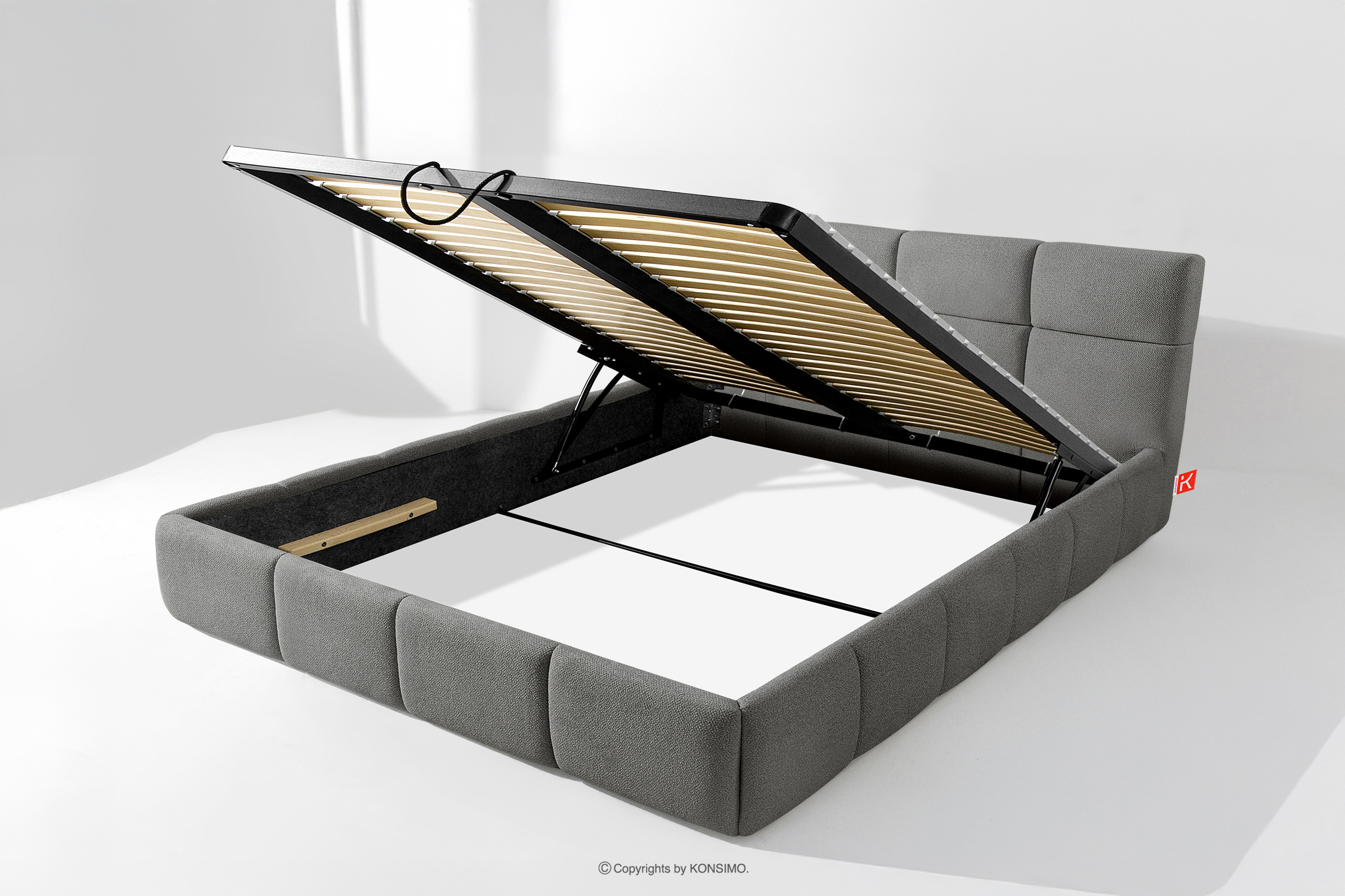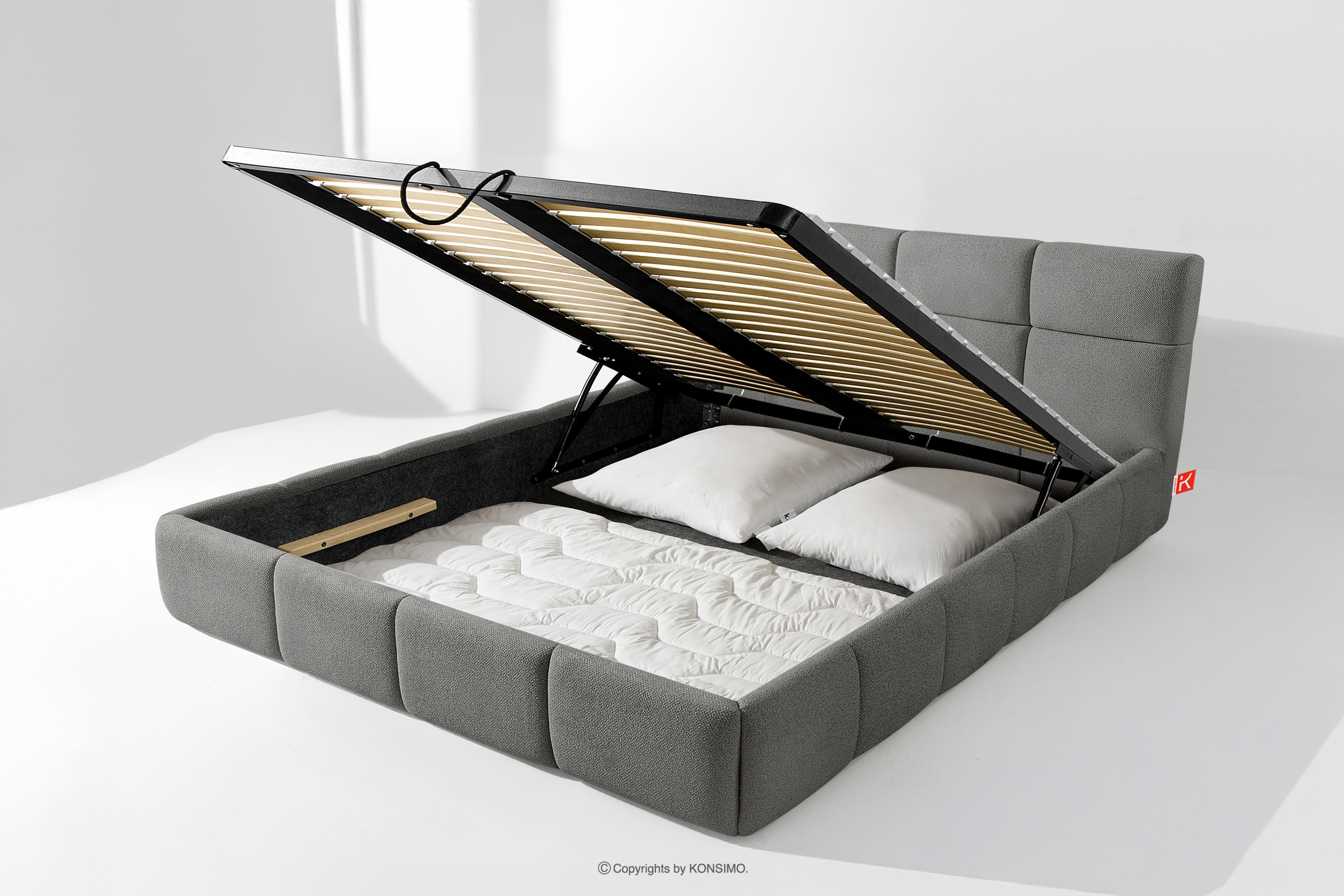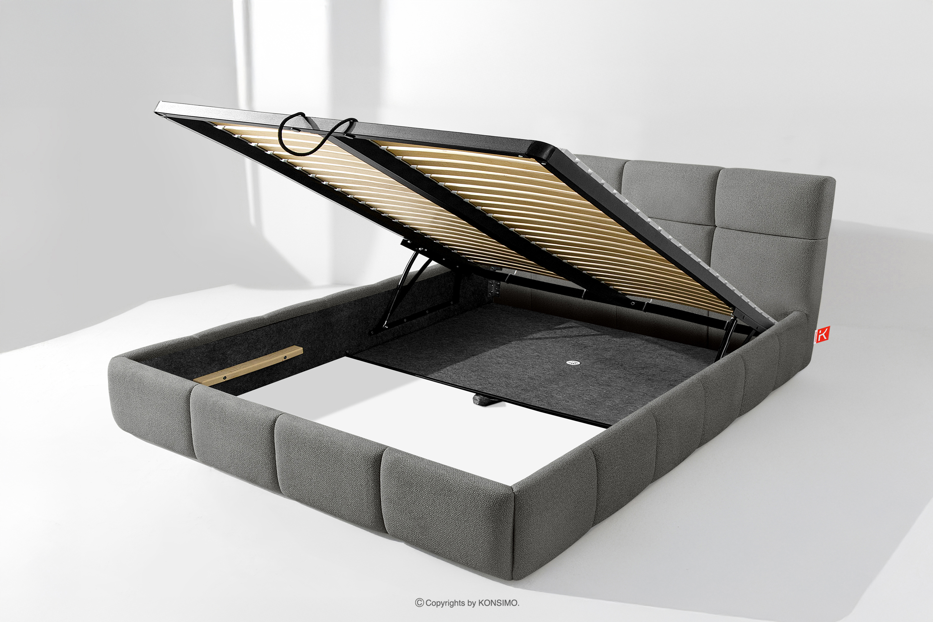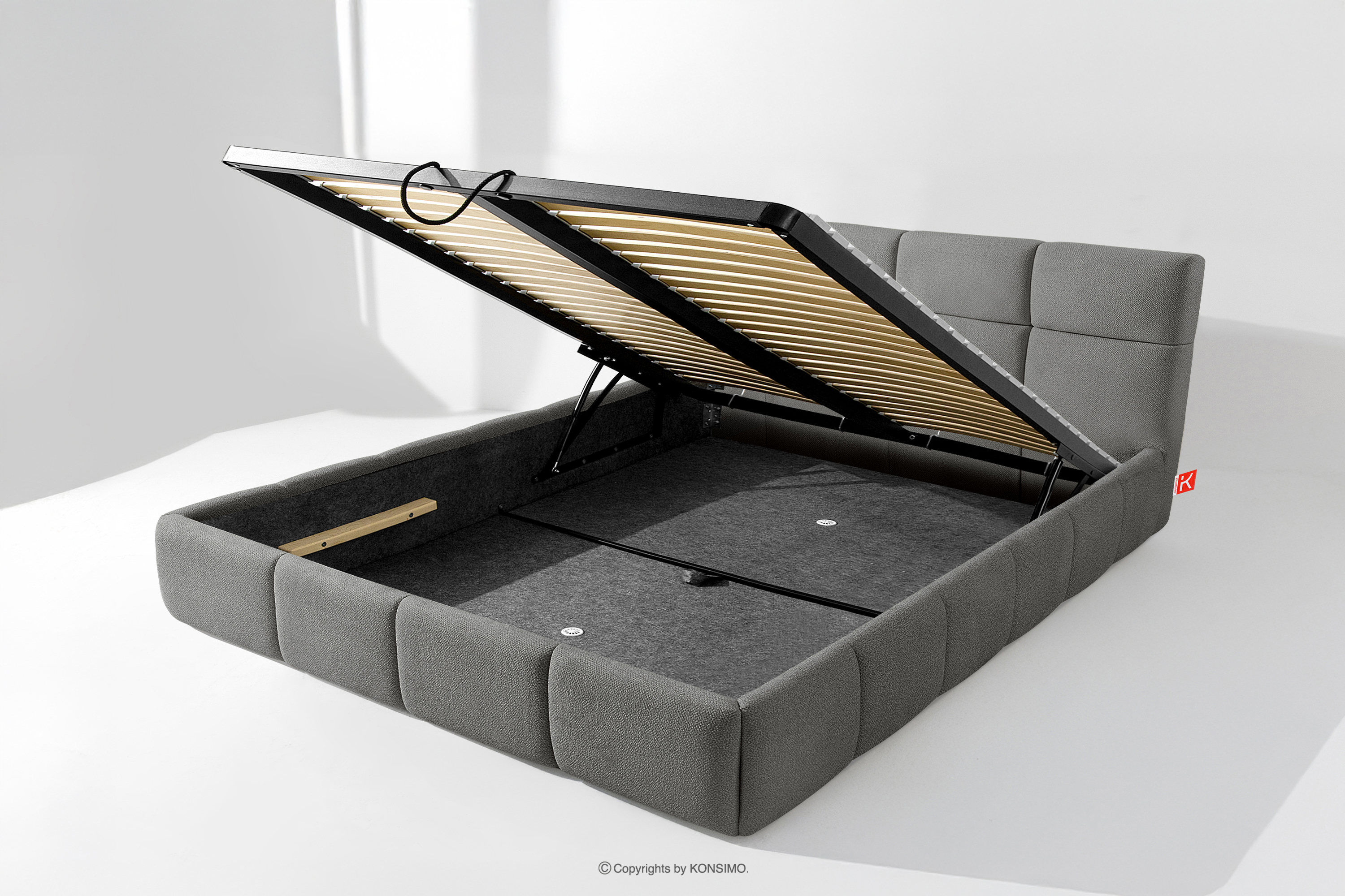 Darüber hinaus hat der Benutzer die Möglichkeit, den Härtegrad des Bettes individuell einzustellen - dank der herausnehmbaren Latten kann eine weichere oder festere Unterlage gewählt werden. Ein weiterer Komfort ist der bequeme Bettzeugbehälter, der sich dank moderner Gasflaschen mühelos und vollautomatisch öffnet. Diese praktische Lösung ermöglicht einen schnellen Zugriff auf das gelagerte Bettzeug, ohne die schwere Matratze manuell anheben zu müssen.