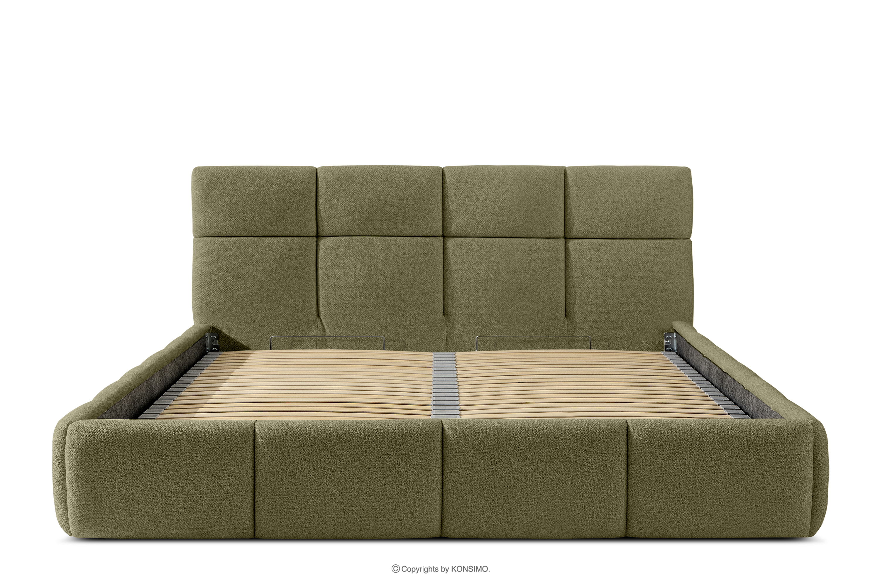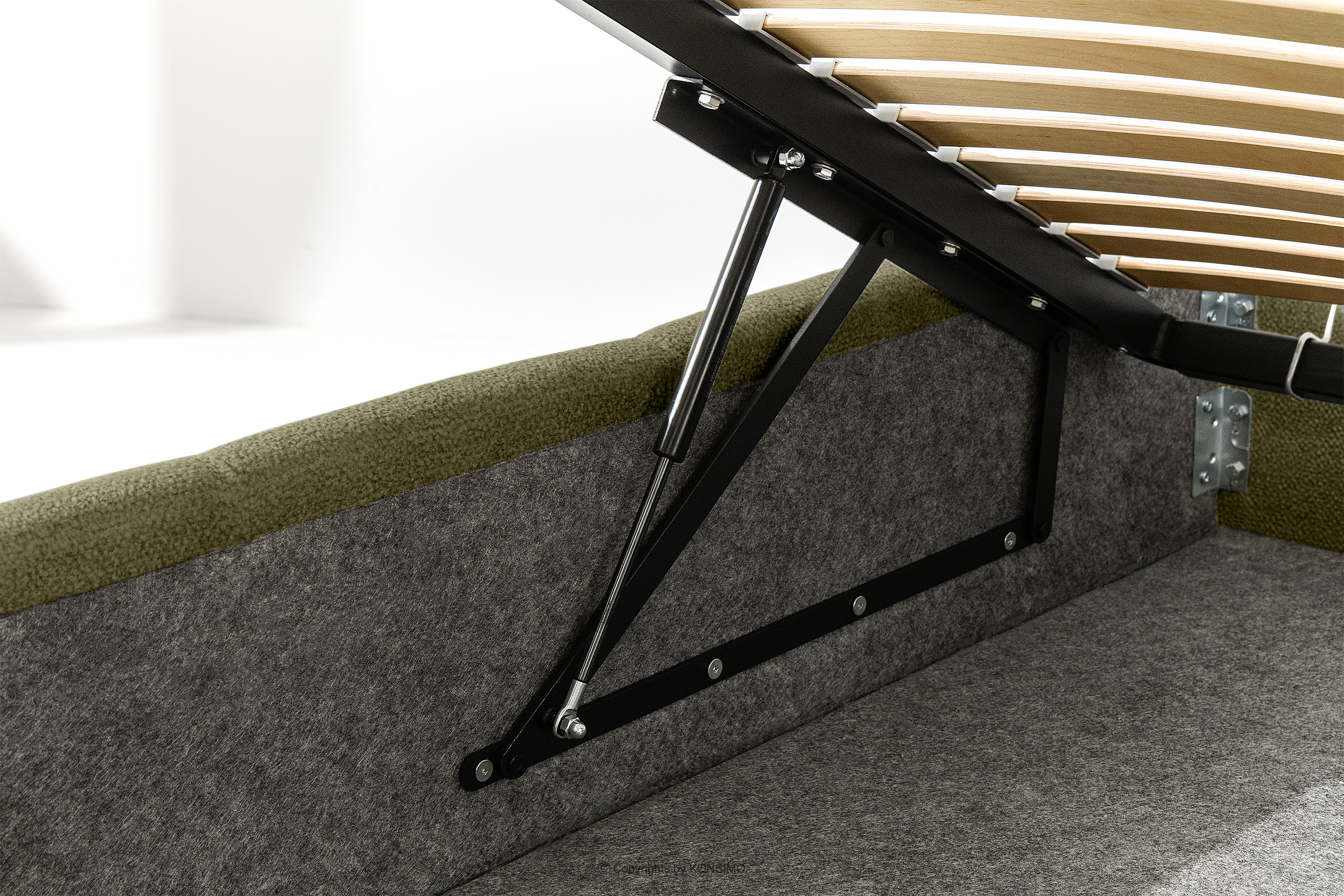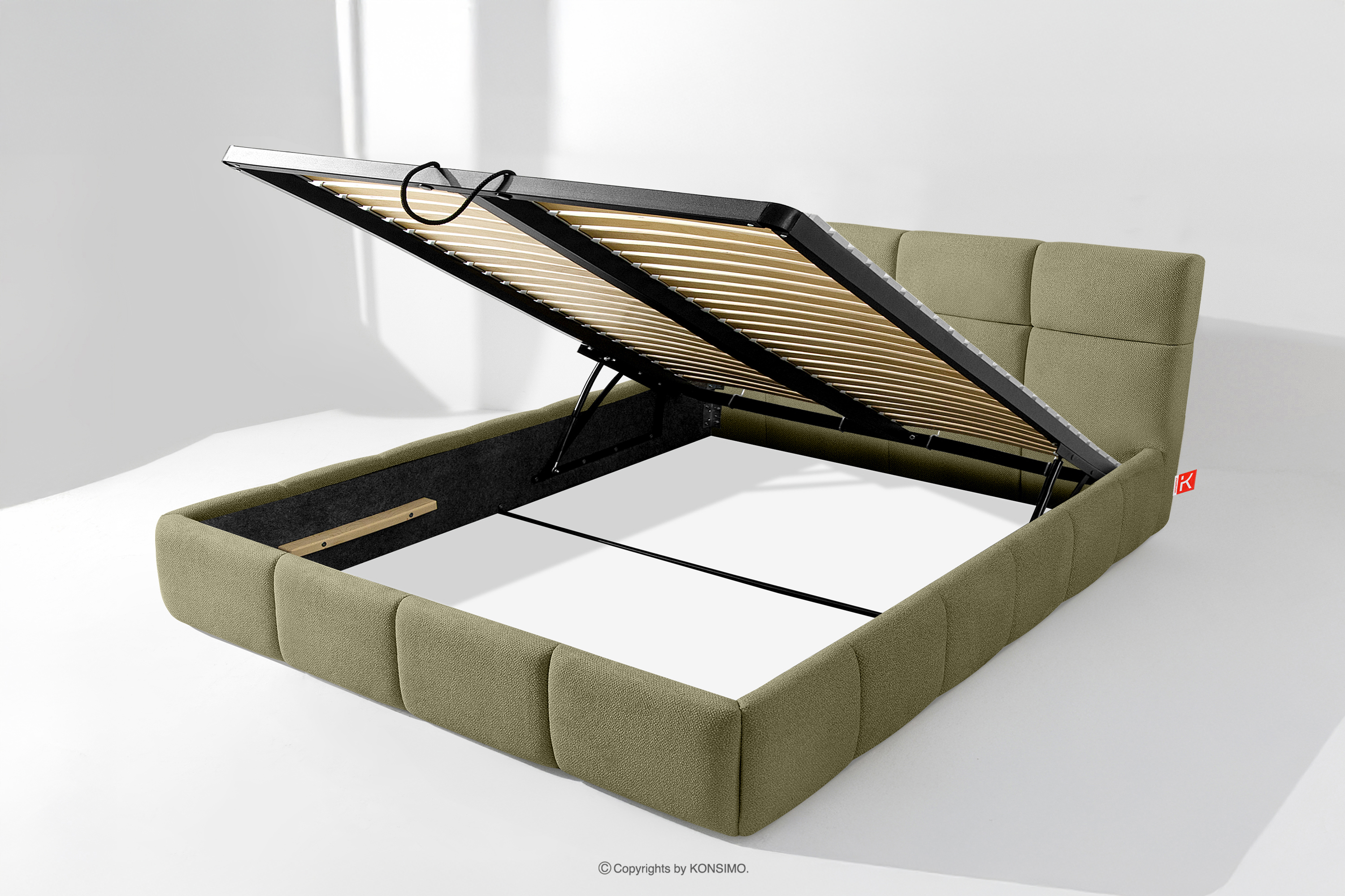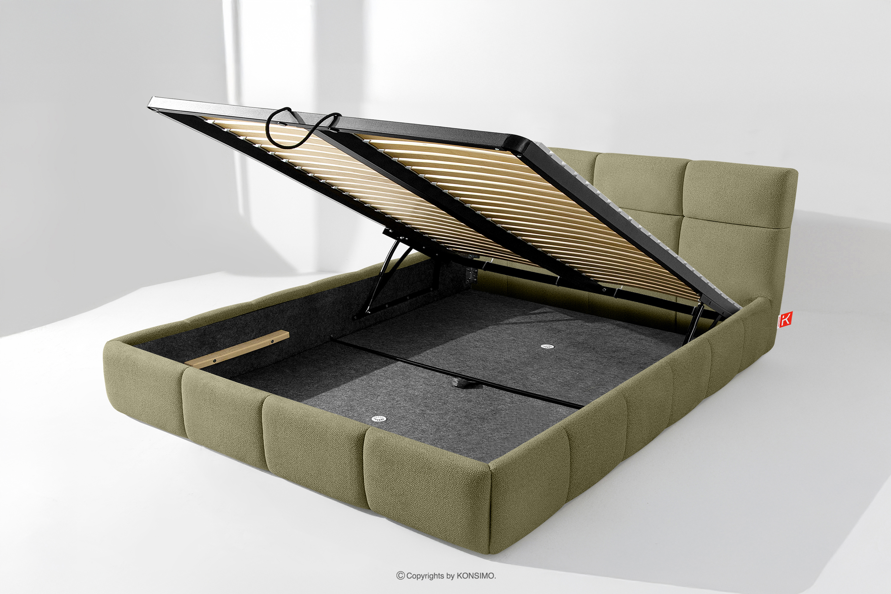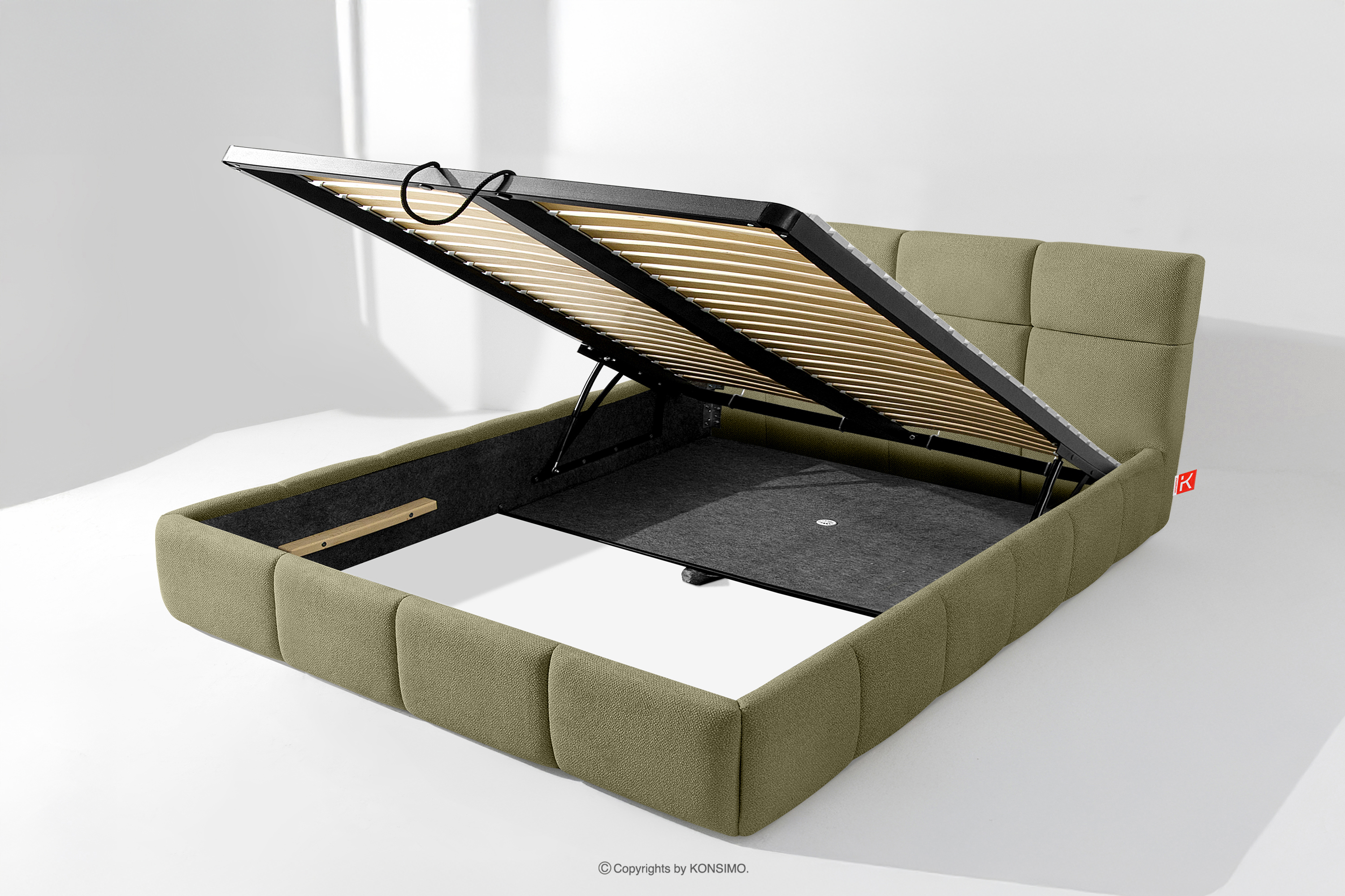 Darüber hinaus hat der Benutzer die Möglichkeit, den Härtegrad des Bettes individuell einzustellen - dank der herausnehmbaren Latten kann eine weichere oder festere Unterlage gewählt werden. Ein weiterer Komfort ist der bequeme Bettzeugbehälter, der sich dank moderner Gasflaschen mühelos und vollautomatisch öffnet. Diese praktische Lösung ermöglicht einen schnellen Zugriff auf das gelagerte Bettzeug, ohne die schwere Matratze manuell anheben zu müssen.