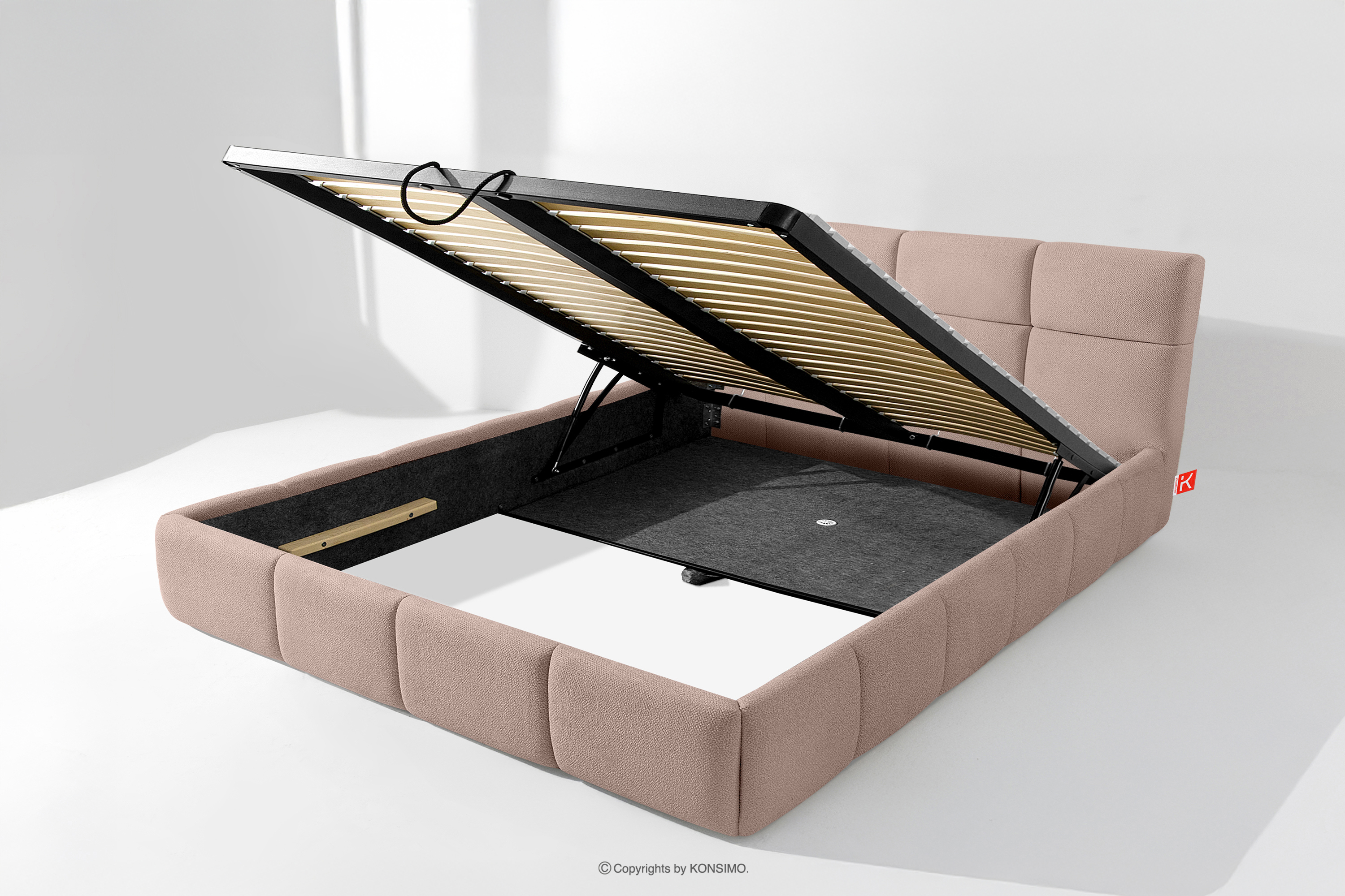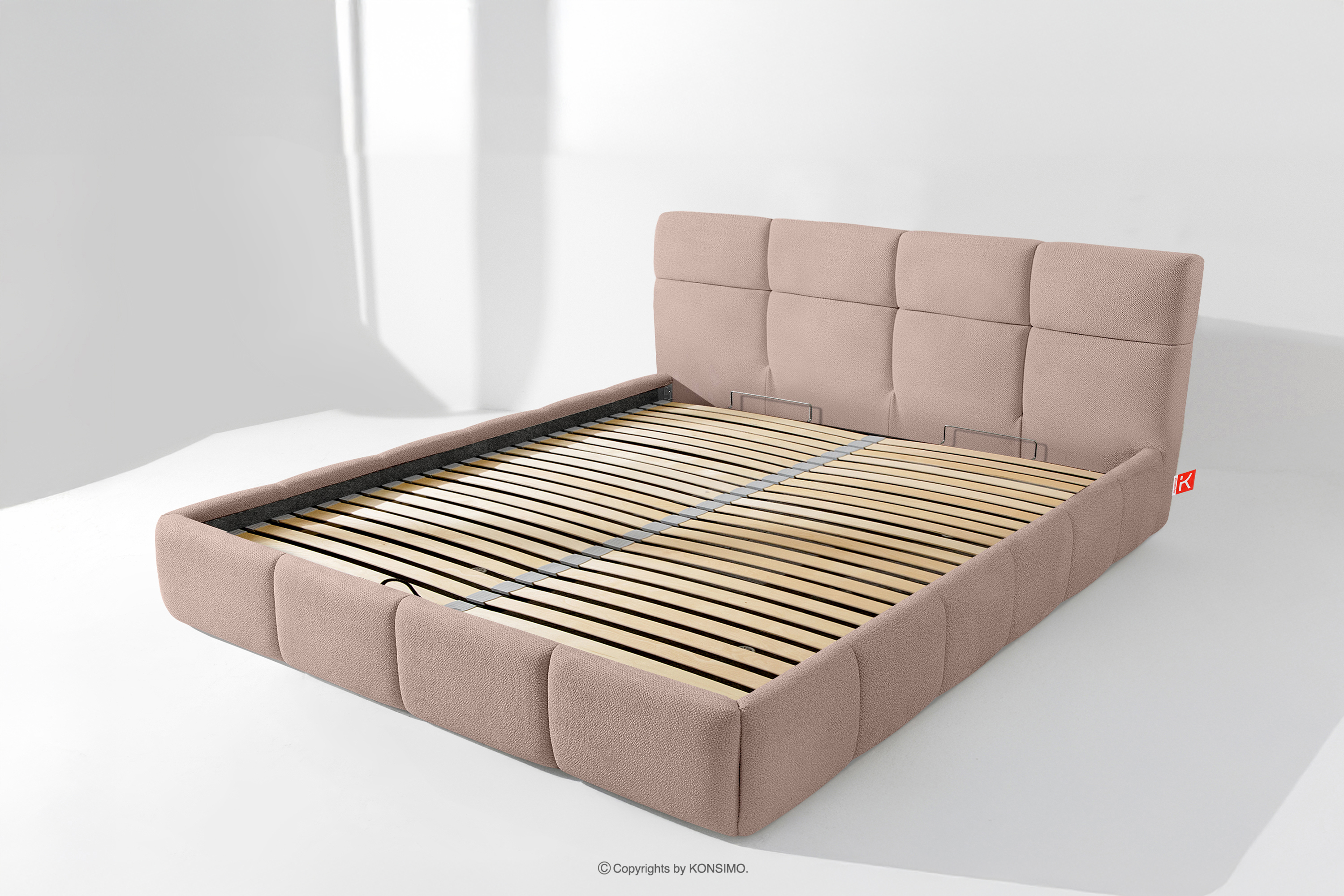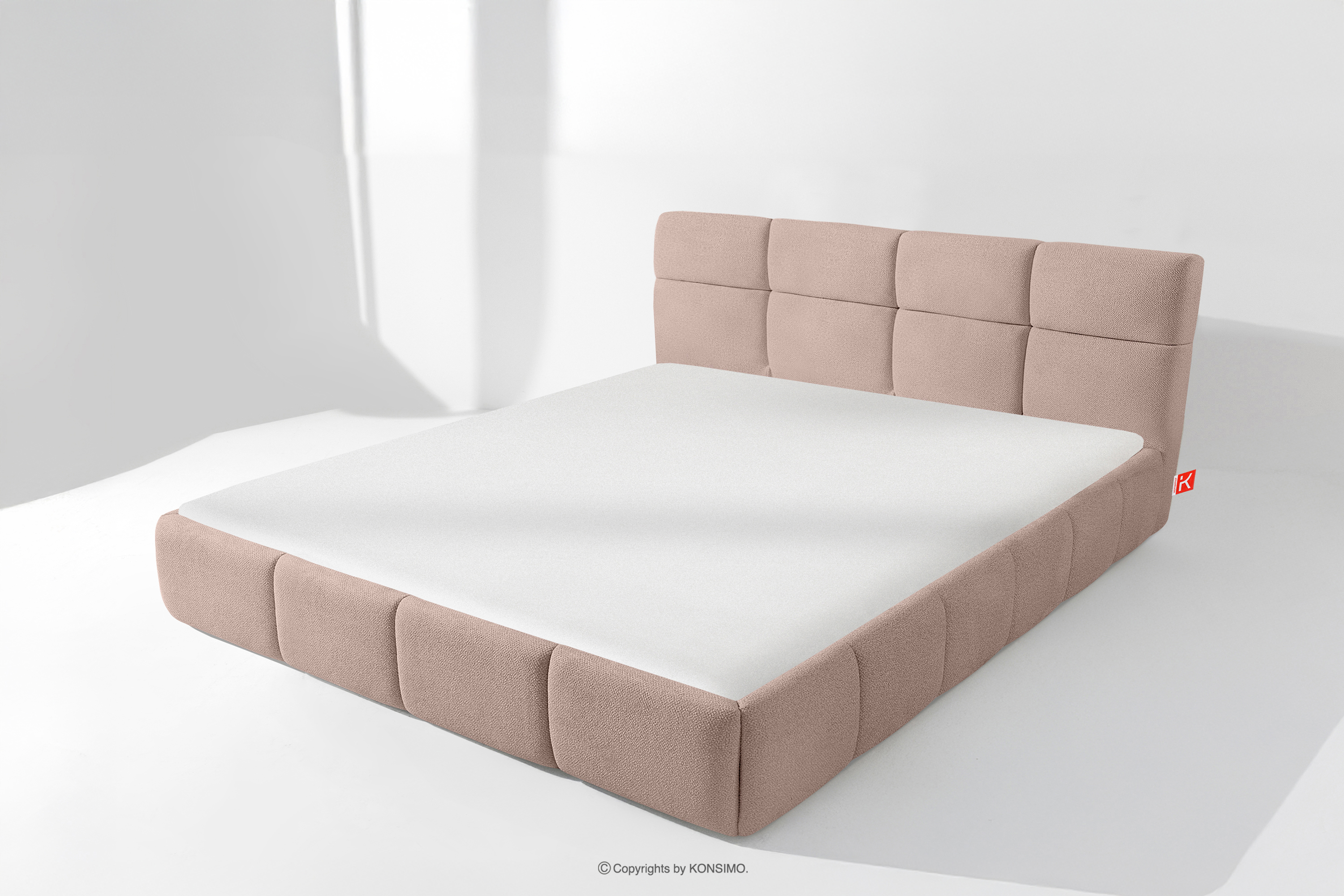 Das 180 cm lange Polsterbett im skandinavischen Stil in Rosa verbindet minimalistisches Design mit maximalem Komfort. Seine einzigartige Form lässt es nicht nur bemerkenswert aussehen, sondern bietet auch Komfort auf höchstem Niveau. Das Bett ist mit einem stabilen Rahmen aus flexiblen Holzlatten ausgestattet, die die Matratze optimal stützen und sich den natürlichen Bewegungen des Körpers anpassen.